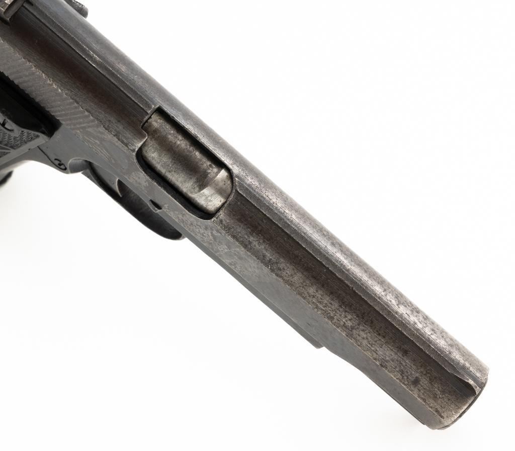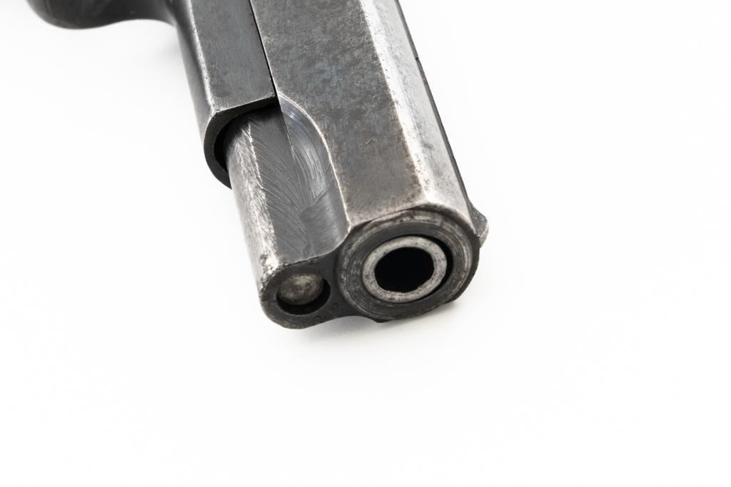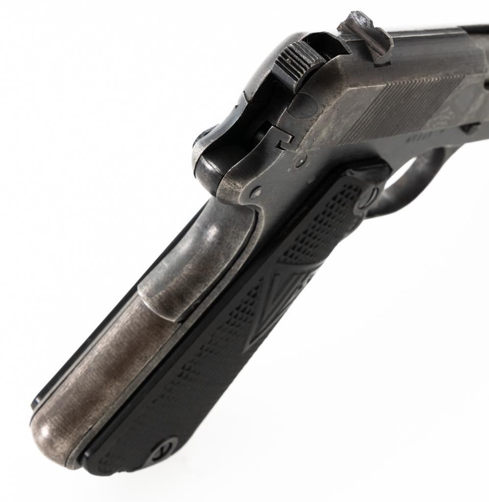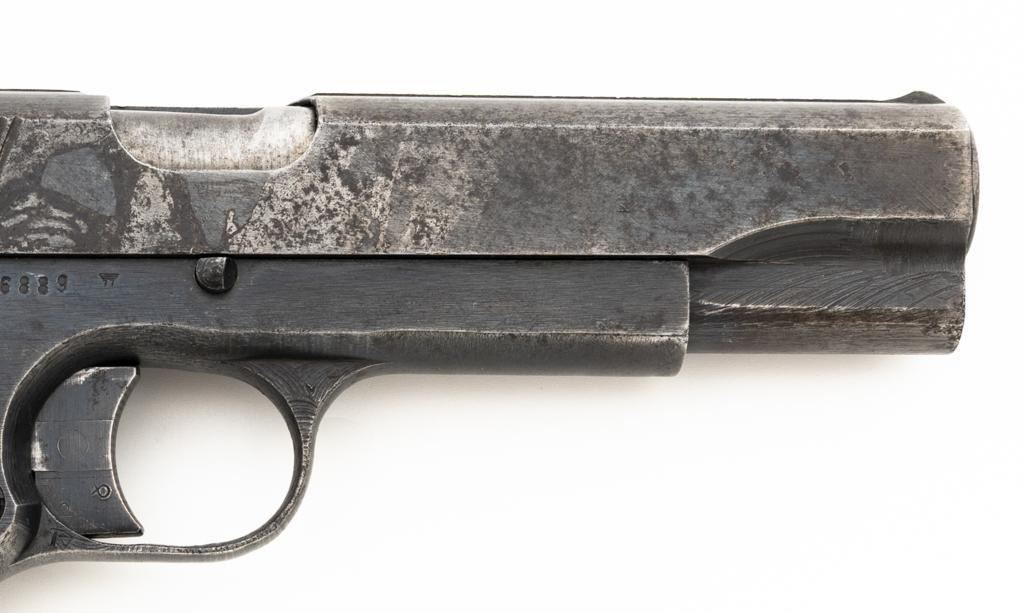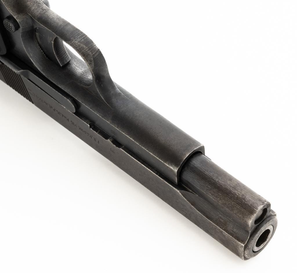 German Occupation P35 Radom VIS Semi-Automatic Pistol, #W6889, 9mm cal., 4.6" barrel, blued finish, checkered black plastic grips embossed with "FB" and "VIS", blade front sight, and fixed rear sight with "V"-notched groove. Includes one unmarked blued steel magazine. Pistol is Type 3 with two levers and no stock slot. Left side of the slide is marked "(eagle)77/F.B.RADOM VIS Mod.35.Pat.Nr.15567". and has a Nazi eagle firing proof and "(eagle)625". There are "(eagle)77" proofs on both sides of the frame. No visible import marks. Condition overall is good, retaining approx. 50% mottled blue finish, with areas of mild pitting on the slide. Grips are good, with handling marks and a few minor chips to the bottom on both sides. Action operates smoothly. Bore rates good with clearly defined rifling. Est.: $800-$1,100. (C&R/PPT)