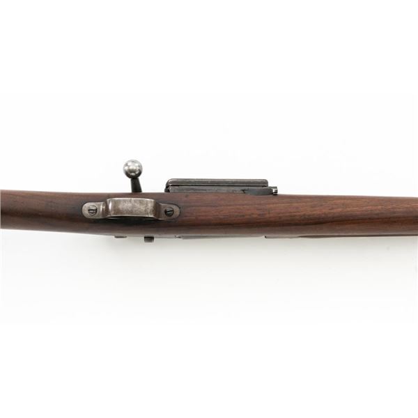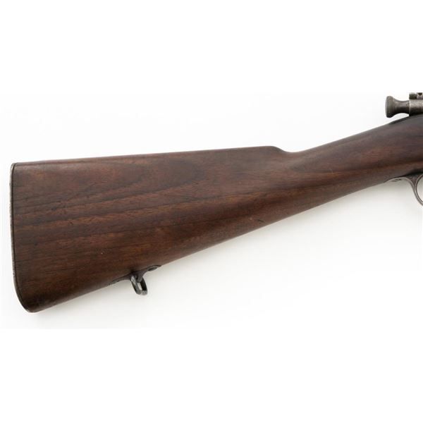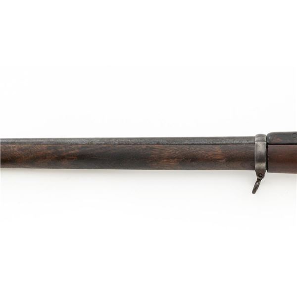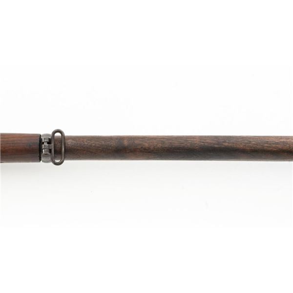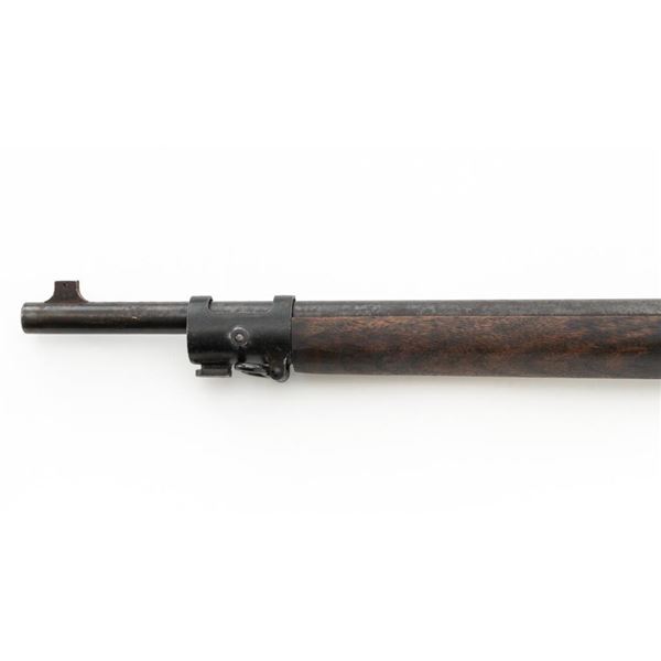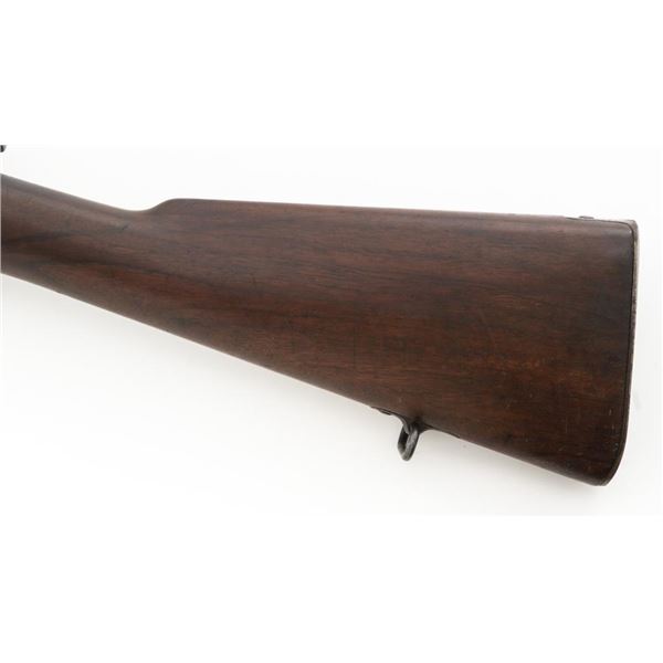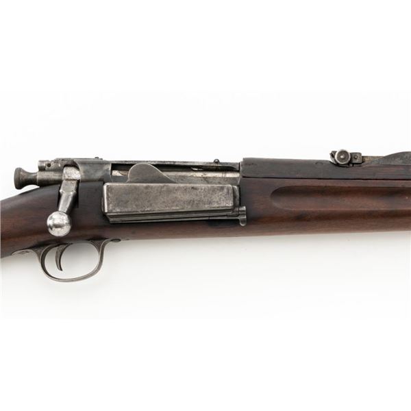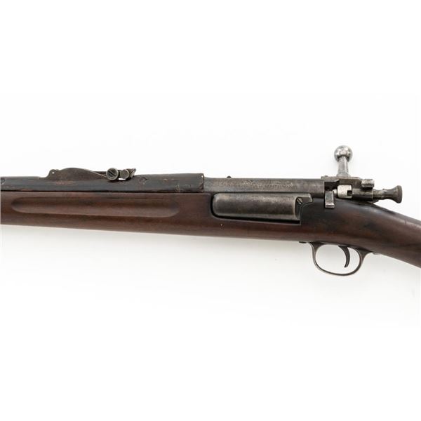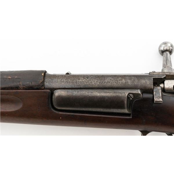 U.S. Springfield Armory Model 1898 Krag Bolt Action Rifle, #289306, .30-40 Krag cal., 30" barrel, blued finish, walnut stock, missing the front sight blade, with a M1902 adjustable "U"-notched rear sight. Receiver is marked "U.S./MODEL 1898 SPRINGFIELD ARMORY 289306" on the left side. Rifle is in good overall condition. Metal with a mottled appearance consisting of toning blue and moderate patina, with a few scattered spots of light rust. Stock is marked with a boxed "JSA/1900" on the left side, and a circled "P" behind the trigger guard. Forend of the stock is joined under the barrel band and is modified from another rifle, and shows more wear than the rear portion. Remainder of the stock is very good, with light handling marks and scratches. Rear of the handguard was repaired with plastic wood and has several dents and scratches. Action works properly. Bore is good bore with light pitting and clear rifling. Est.: $500-$800. (C&R)