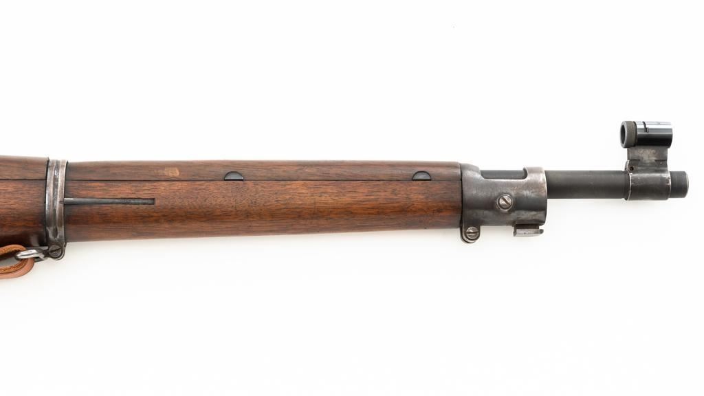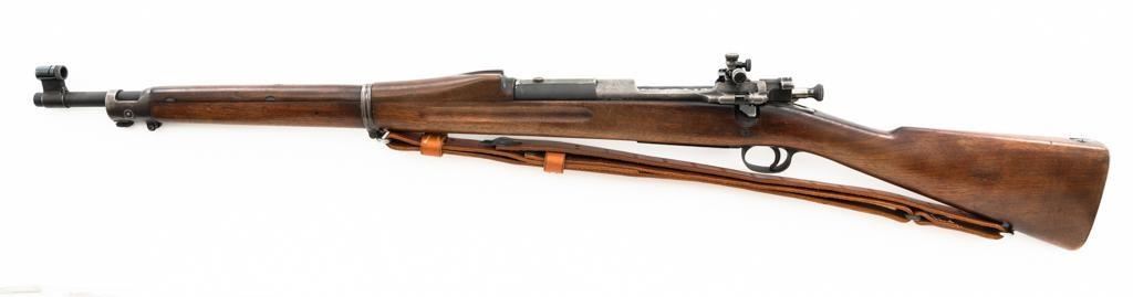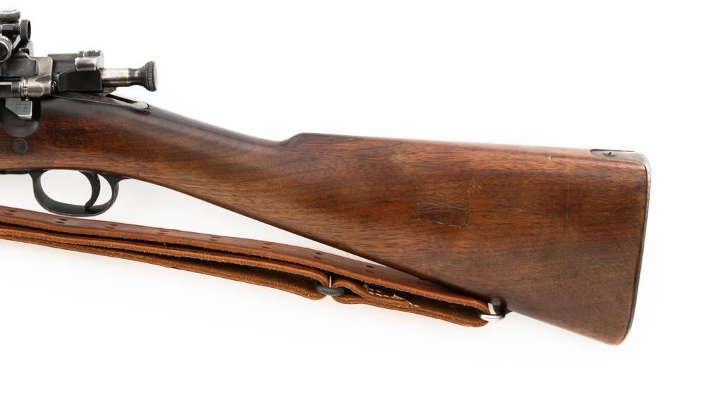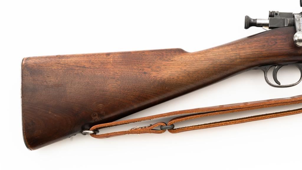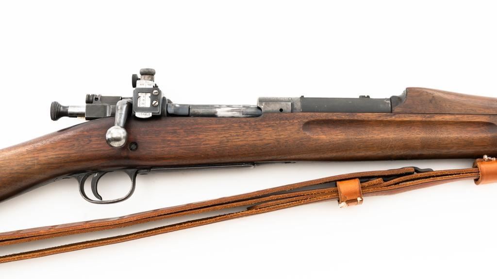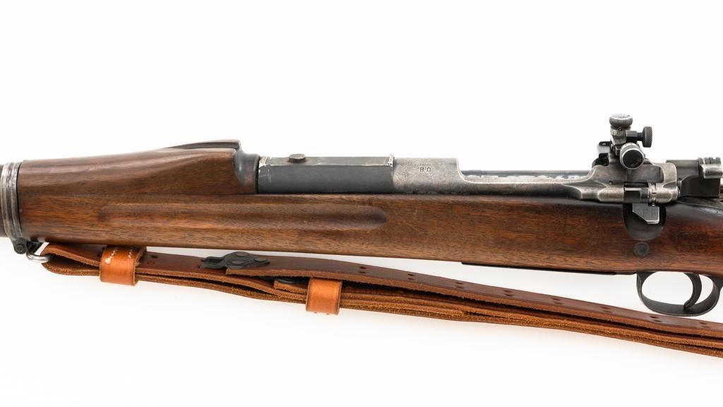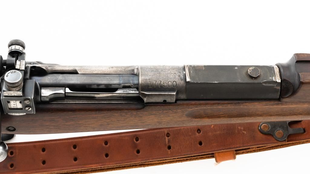 U.S. Rock Island Arsenal Model 1903 Bolt Action Rifle, #177500, .30-06 cal., 24" barrel, parkerized finish, walnut stock, Redfield globe front and rear peep sight. M1905 sight was removed and the sight base filed down. A commercial leather sling is attached. Receiver is marked "U.S./ROCKISLAND/ARSENAL/MODEL 1903/177500". A corner of the cut-off was removed to clear the Redfield sight, and the stacking swivel is missing. Barrel is marked "H S/(Flaming Bomb)/5 44". No import marks. Rifle is in good overall condition, retaining approx. 50% parkerized finish, showing general wear, with a mottled appearance on the receiver, scattered dark spotting on the trigger guard. Finger groove stock is marked with script letters "CN" (Conrad Nelson)/1910" on the left side, circled "P" proof behind the trigger guard, with small rectangular box with punch marks on the left side. Stock is in good condition, with scattered moderate handling marks. Action works properly. Bore is very good with light wear to the rifling. Est.: $750-$1,000. (C&R)