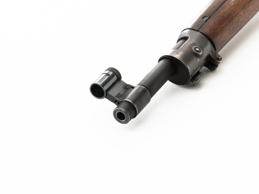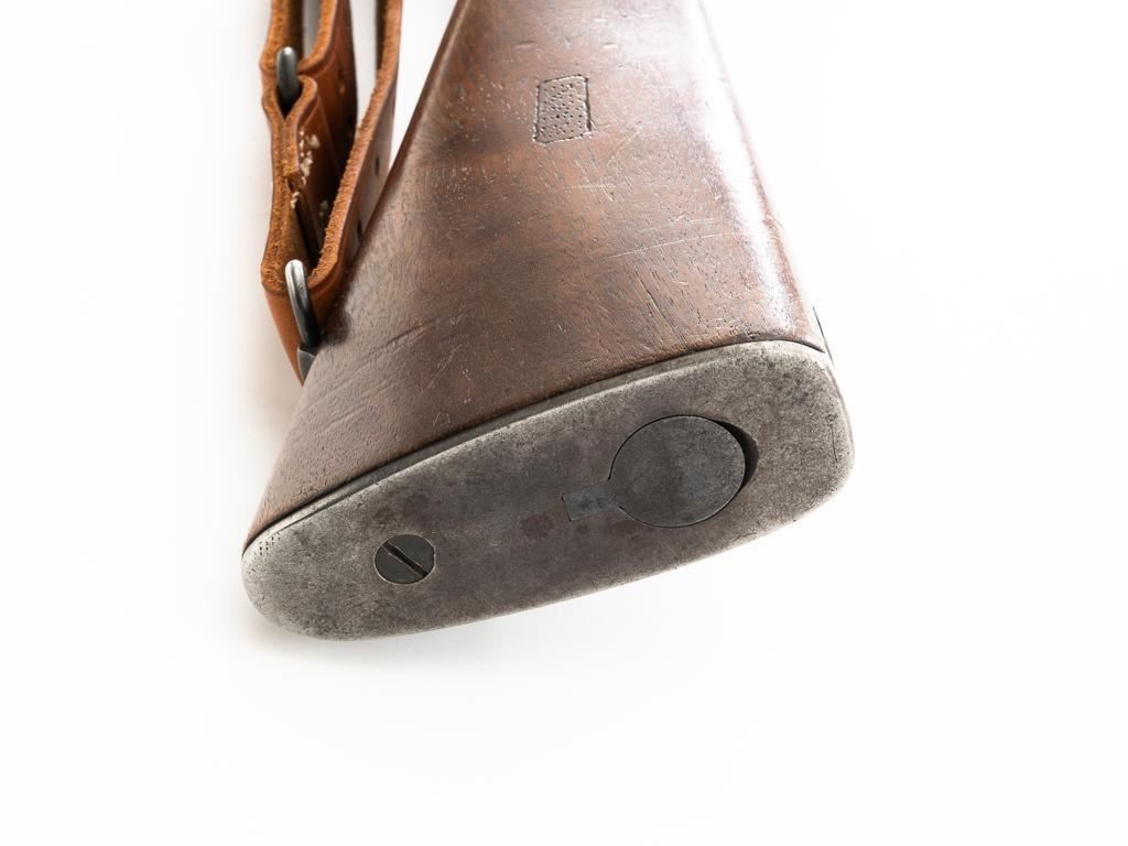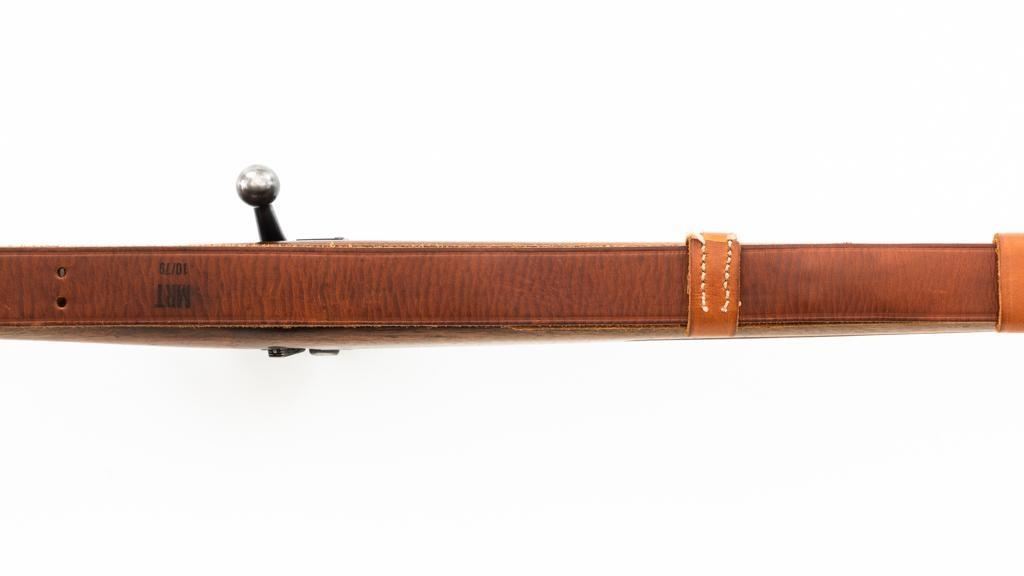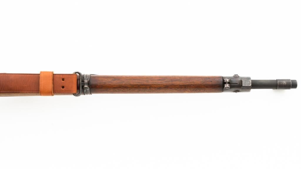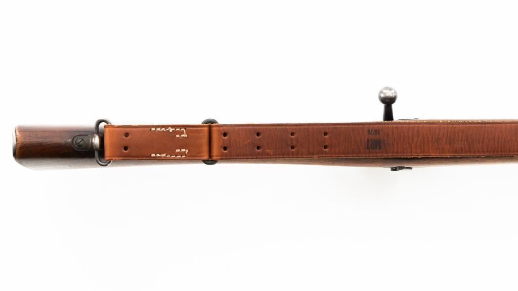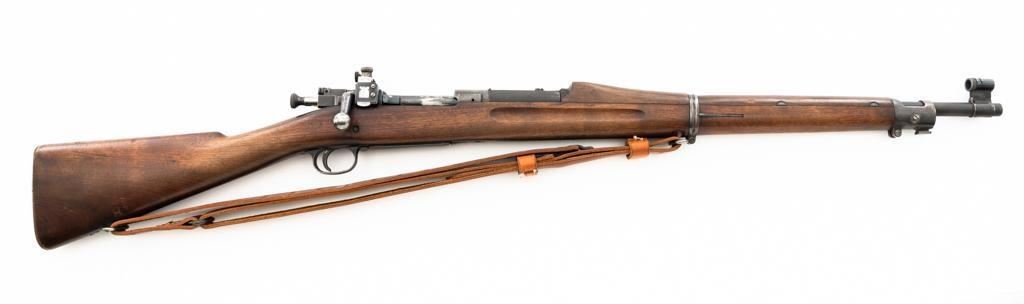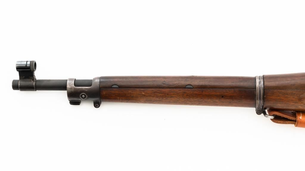 U.S. Rock Island Arsenal Model 1903 Bolt Action Rifle, #177500, .30-06 cal., 24" barrel, parkerized finish, walnut stock, Redfield globe front and rear peep sight. M1905 sight was removed and the sight base filed down. A commercial leather sling is attached. Receiver is marked "U.S./ROCKISLAND/ARSENAL/MODEL 1903/177500". A corner of the cut-off was removed to clear the Redfield sight, and the stacking swivel is missing. Barrel is marked "H S/(Flaming Bomb)/5 44". No import marks. Rifle is in good overall condition, retaining approx. 50% parkerized finish, showing general wear, with a mottled appearance on the receiver, scattered dark spotting on the trigger guard. Finger groove stock is marked with script letters "CN" (Conrad Nelson)/1910" on the left side, circled "P" proof behind the trigger guard, with small rectangular box with punch marks on the left side. Stock is in good condition, with scattered moderate handling marks. Action works properly. Bore is very good with light wear to the rifling. Est.: $750-$1,000. (C&R)