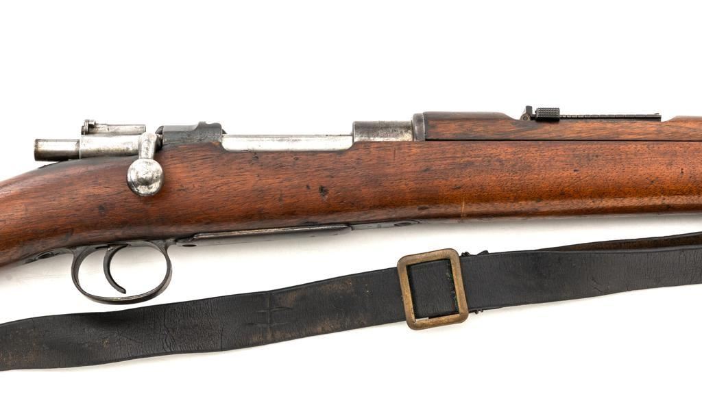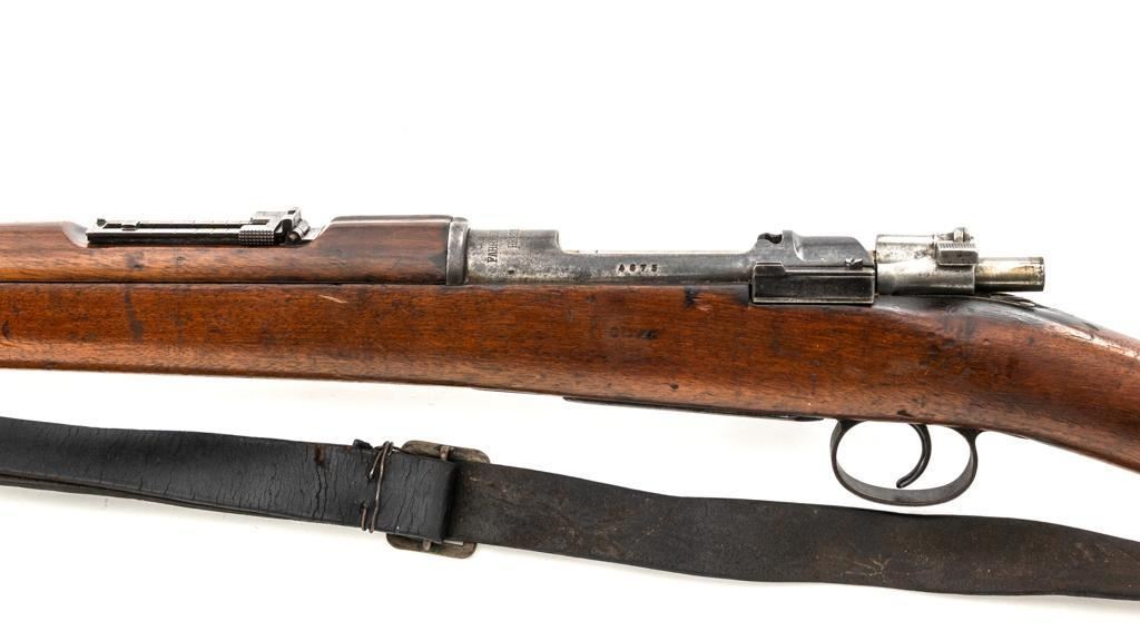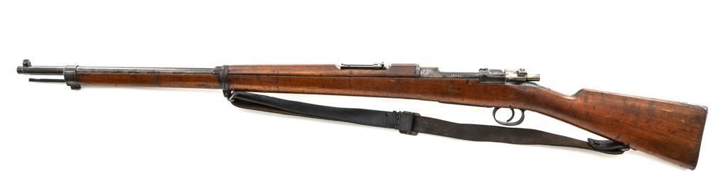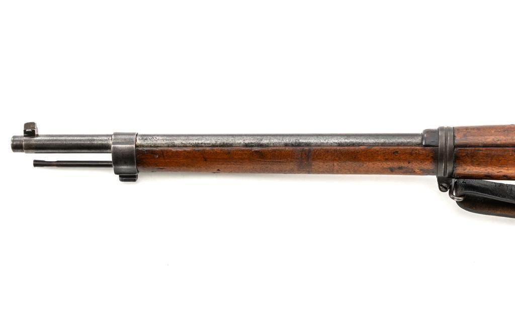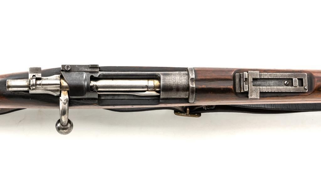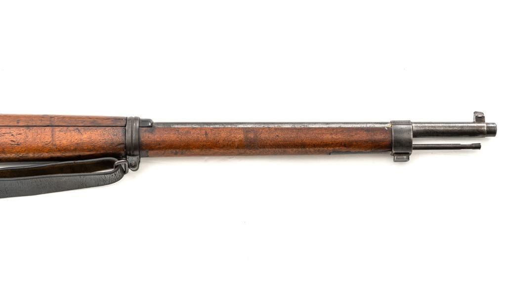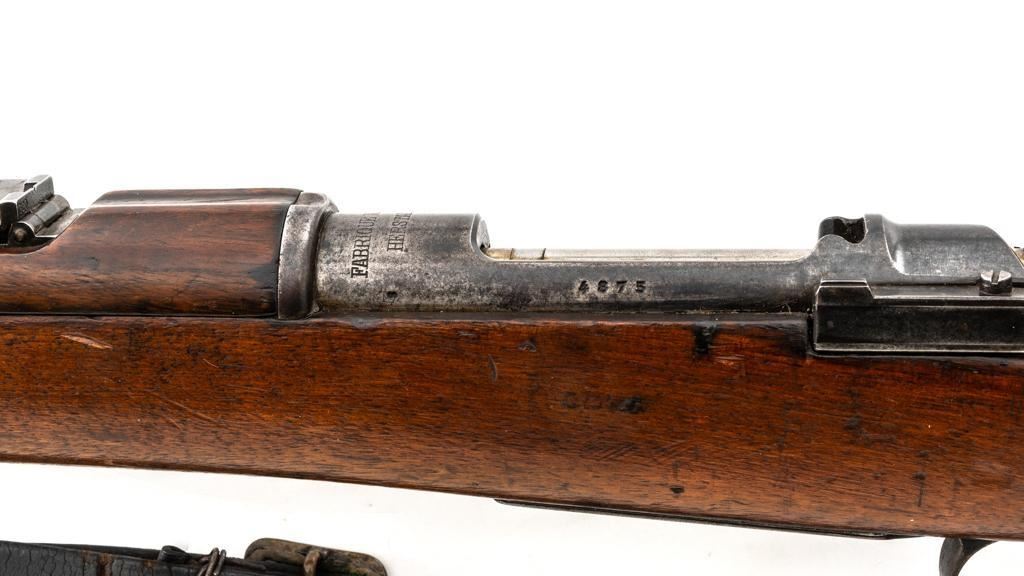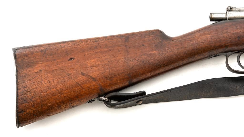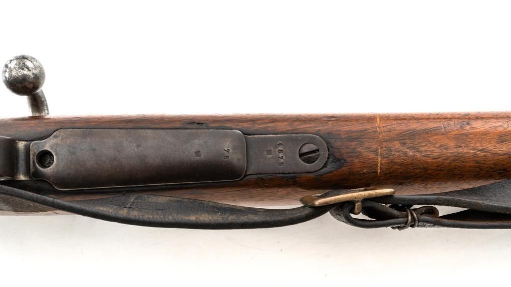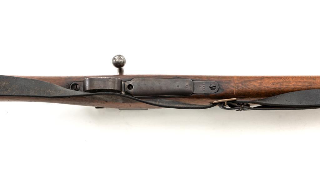 FN M1893 Mauser Bolt Action Rifle, #4875, 7x57mm cal., 29.5" barrel, blued finish, hardwood stock and handguard, dovetailed inverted-"V" front sight, and adjustable folding leaf rear sight with "V"-notch, graduated to 2000 meters. Includes a steel cleaning rod and black leather sling with brass buckle. Sling is in fair condition, showing age and wear. Screw stem tip is broken off the cleaning rod. Top of the receiver ring is marked "FABRIQUE NATIONALE/HERSTAL-LIEGE". Matching numbers on the trigger guard and magazine floorplate. No numbers on bolt assembly. No visible import marks. Condition overall is good, with the metal having a mottled gray/brown appearance. Bright bolt assembly has darkened and shows areas of patina. Wood is good, with scattered impressions and a few more larger gouges. Bolt operates smoothly but the safety lever is jammed into the fire position. Rifling is visible but the bore is dark and pitted. Rifle is possibly one of 14,000 made by FN on contract for Spain without identifying markings. Est.: $500-$800. (C&R)