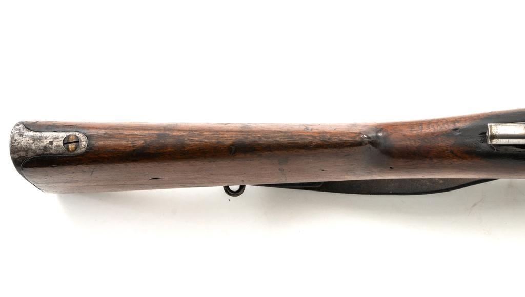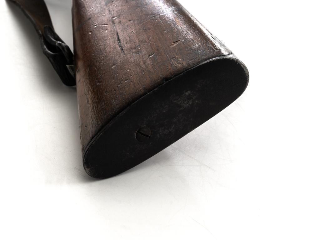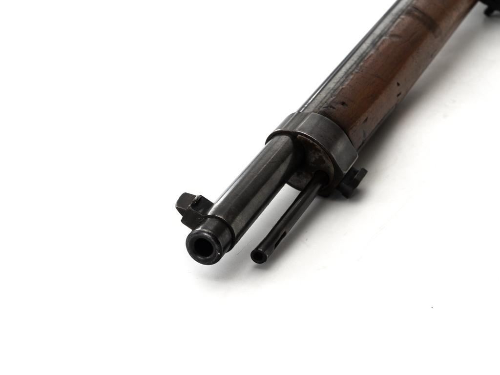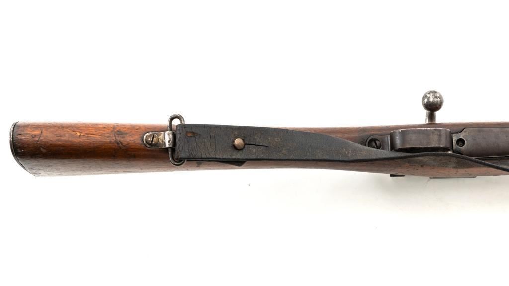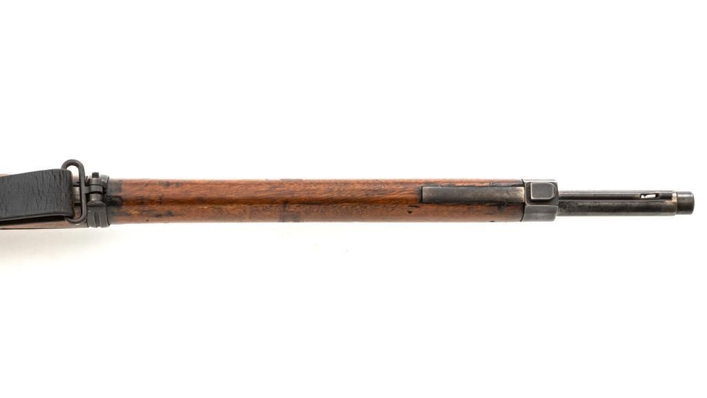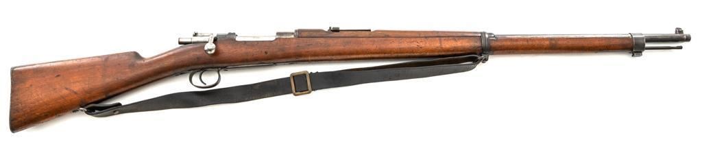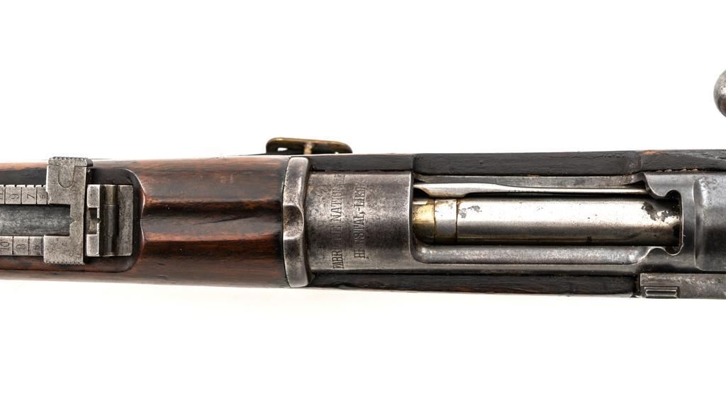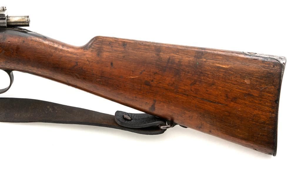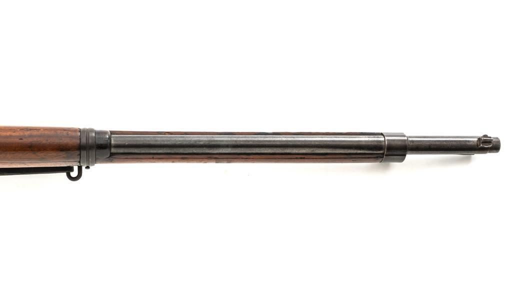 FN M1893 Mauser Bolt Action Rifle, #4875, 7x57mm cal., 29.5" barrel, blued finish, hardwood stock and handguard, dovetailed inverted-"V" front sight, and adjustable folding leaf rear sight with "V"-notch, graduated to 2000 meters. Includes a steel cleaning rod and black leather sling with brass buckle. Sling is in fair condition, showing age and wear. Screw stem tip is broken off the cleaning rod. Top of the receiver ring is marked "FABRIQUE NATIONALE/HERSTAL-LIEGE". Matching numbers on the trigger guard and magazine floorplate. No numbers on bolt assembly. No visible import marks. Condition overall is good, with the metal having a mottled gray/brown appearance. Bright bolt assembly has darkened and shows areas of patina. Wood is good, with scattered impressions and a few more larger gouges. Bolt operates smoothly but the safety lever is jammed into the fire position. Rifling is visible but the bore is dark and pitted. Rifle is possibly one of 14,000 made by FN on contract for Spain without identifying markings. Est.: $500-$800. (C&R)