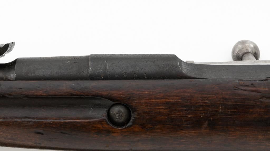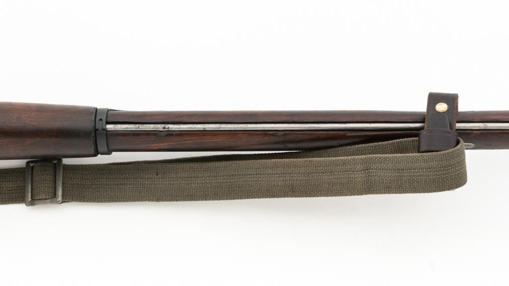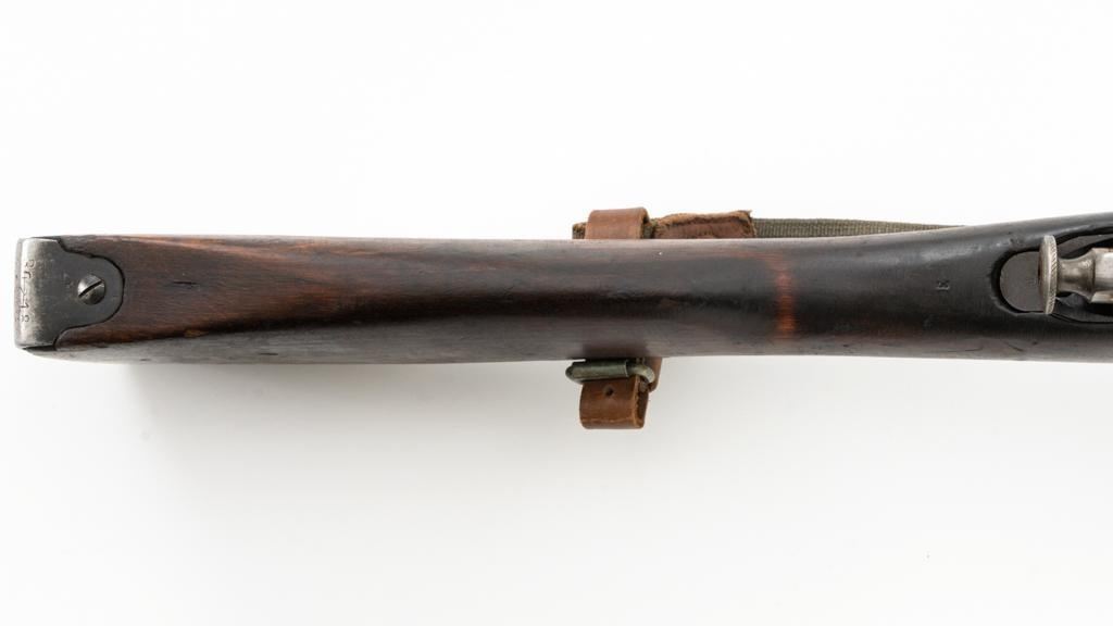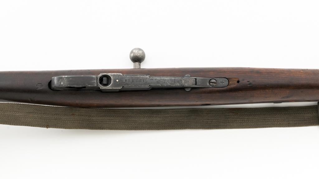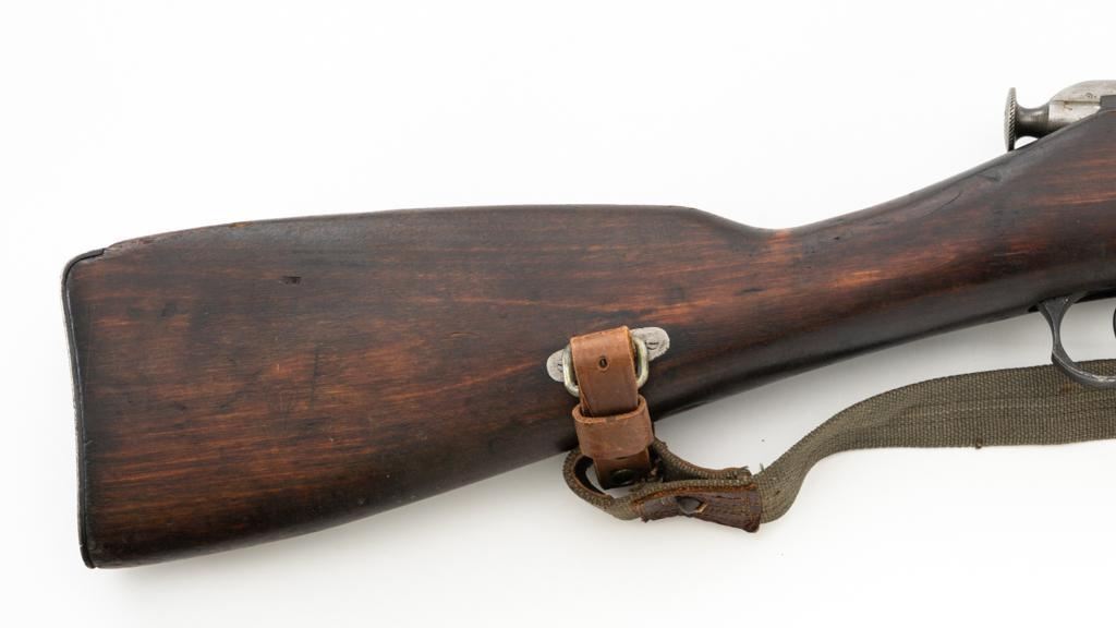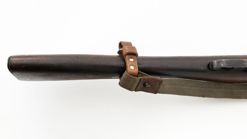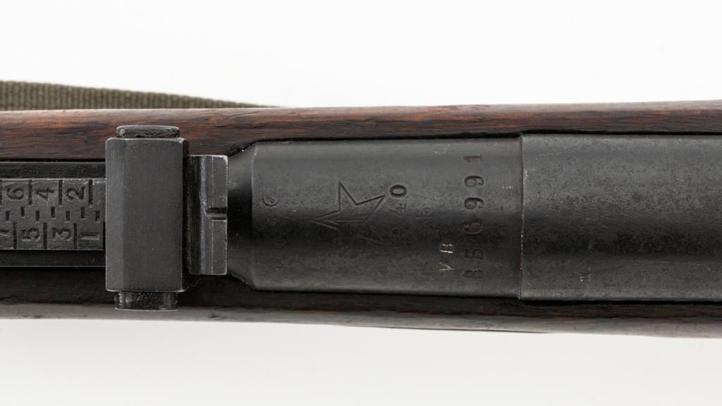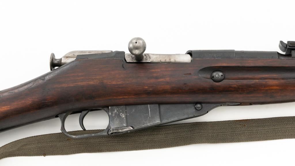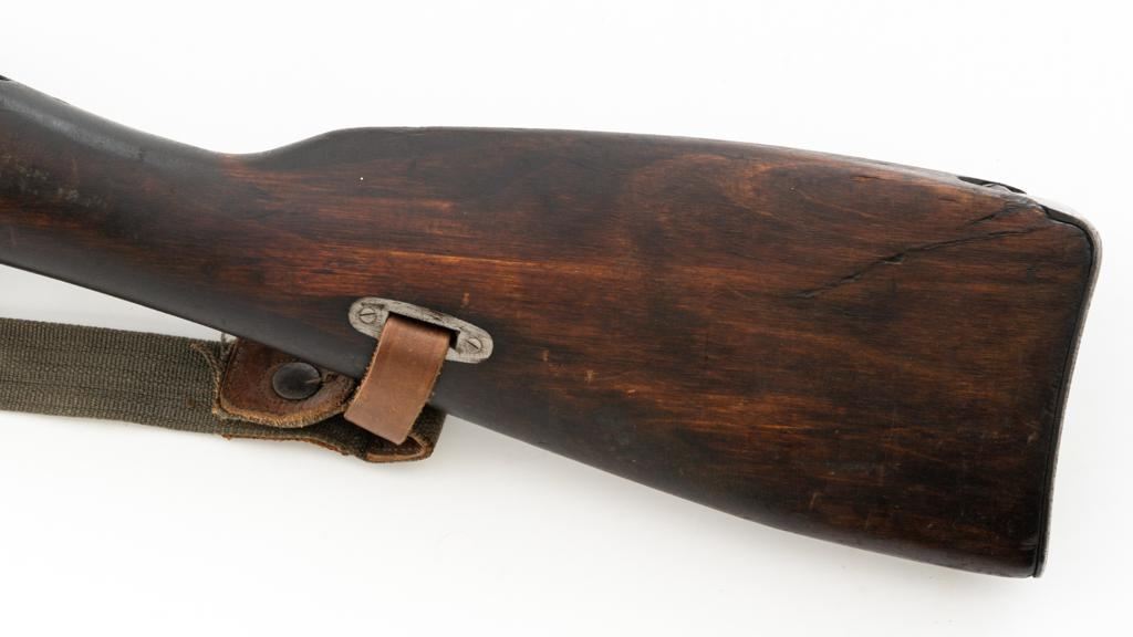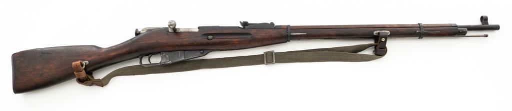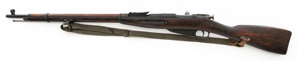Soviet M91/30 Mosin Nagant Bolt Action Rifle, #VB6991, 7.62x54Rmm cal., 29" barrel, blued finish with bright bolt assembly, hardwood stock and handguard, hooded post front sight, and adjustable tangent rear sight with "V"-notched groove, graduated to 2000 meters. Includes a steel cleaning rod and a light green cotton Finnish sling, stamped "SA", with leather collars. Sling is in very good used condition. Top of the barrel shank is marked with Tula Arsenal five-pointed star makers mark over "1940". Matching numbered bolt, other numbers do not match. Import stamped on underside of the barrel with an additional number stamped on left side of the receiver. Condition overall is very good, retaining approx. 80%-85% blue, with light frosting to the receiver and barrel, with wear and patina to the buttplate. Wood is good, with a spliced repair and a crack to the tip of the forend, small chip forward of the triggerguard, and crack to left side of the buttstock. Action operates smoothly but the safety lever will not engage. Muzzle has been counter bored. Bore is dark with good, visible rifling. Est.: $300-$500. (C&R)