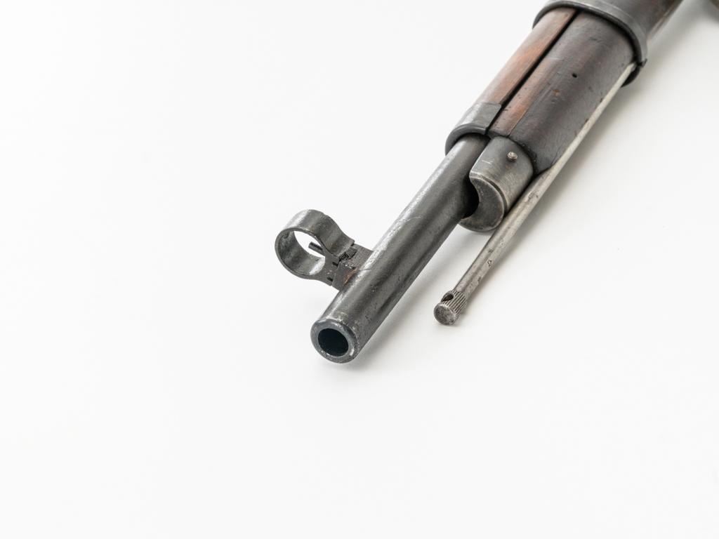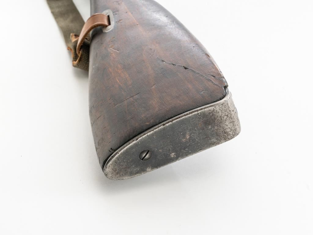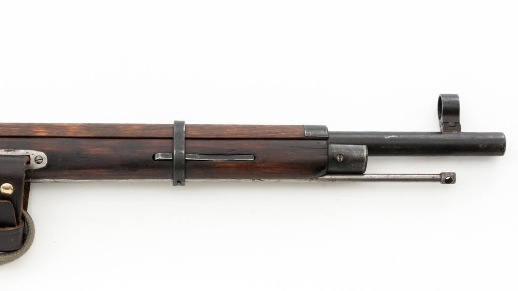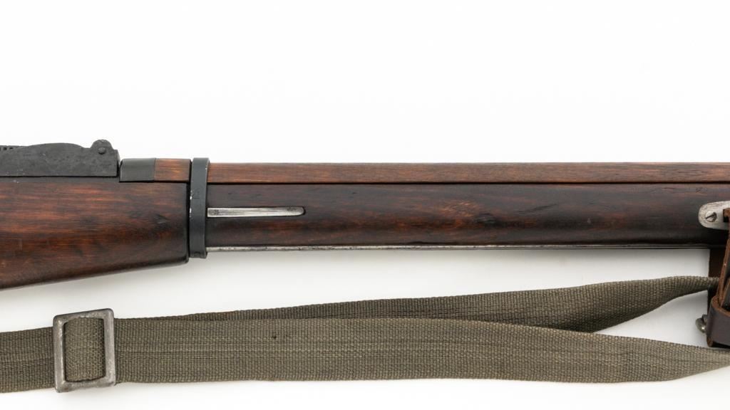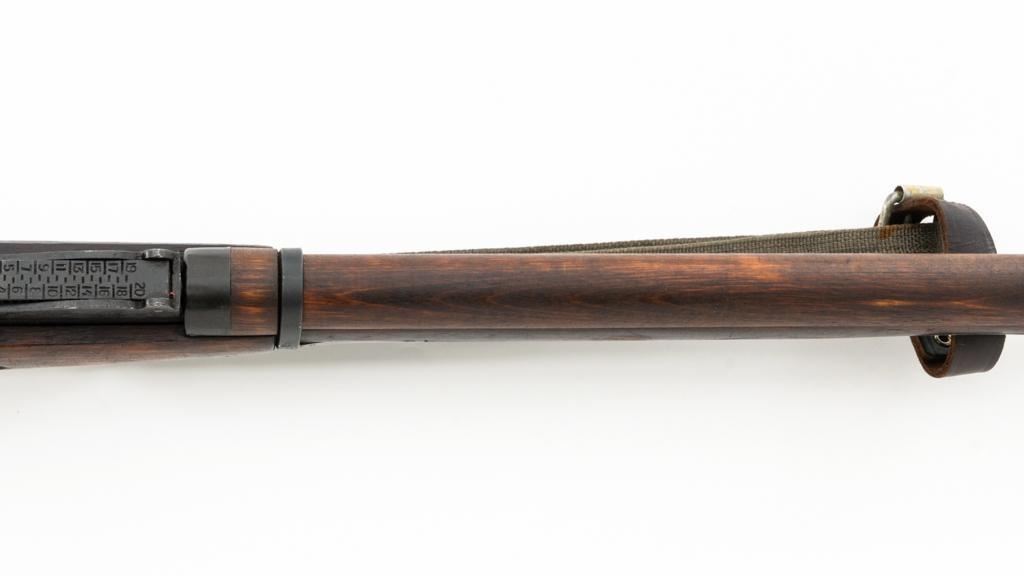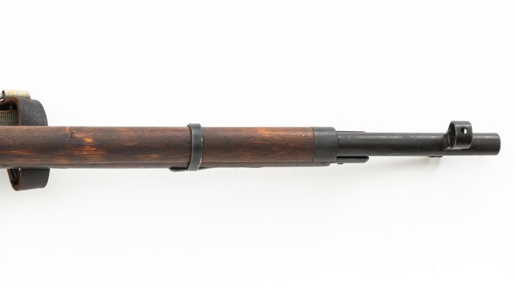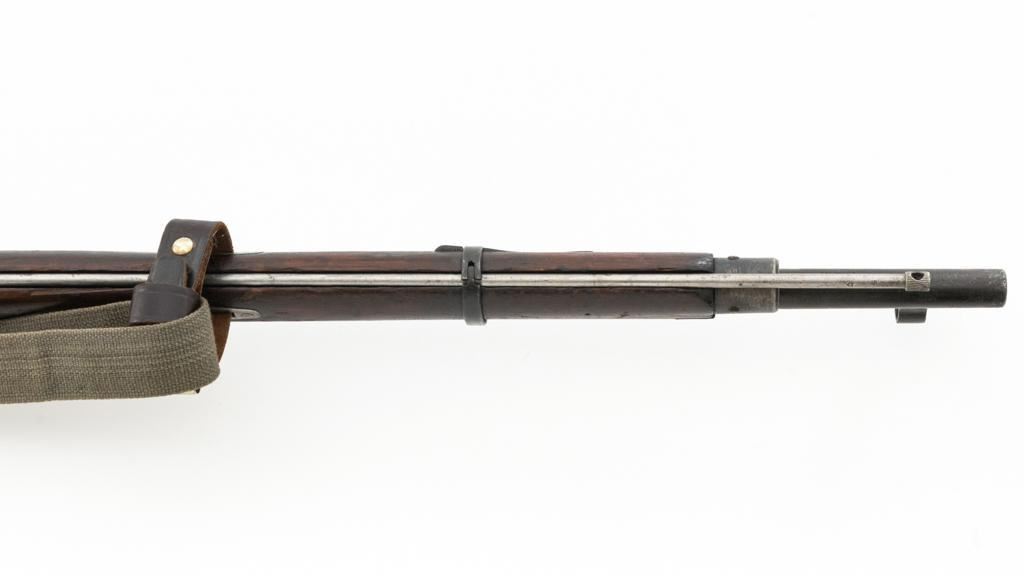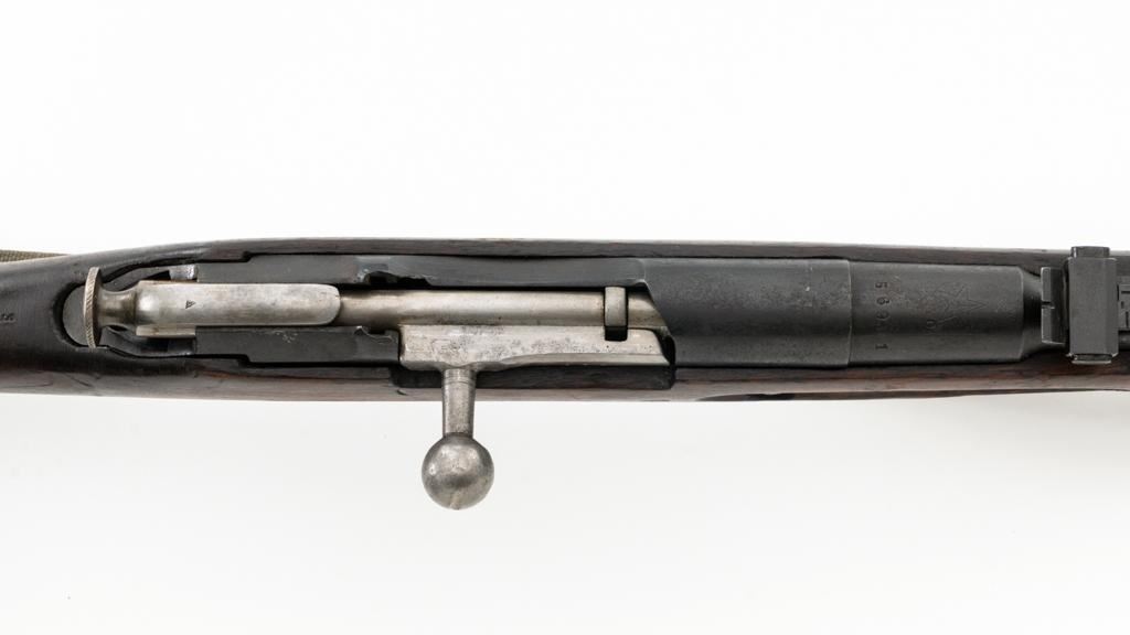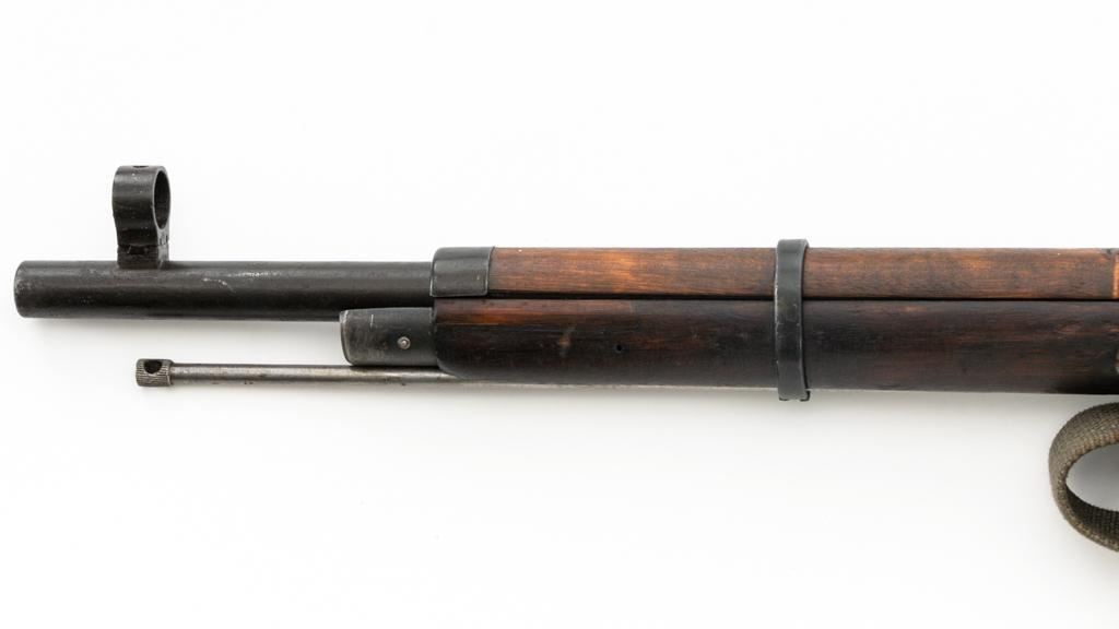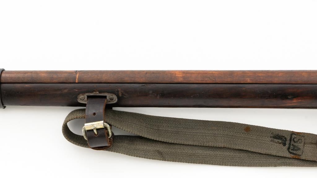 Soviet M91/30 Mosin Nagant Bolt Action Rifle, #VB6991, 7.62x54Rmm cal., 29" barrel, blued finish with bright bolt assembly, hardwood stock and handguard, hooded post front sight, and adjustable tangent rear sight with "V"-notched groove, graduated to 2000 meters. Includes a steel cleaning rod and a light green cotton Finnish sling, stamped "SA", with leather collars. Sling is in very good used condition. Top of the barrel shank is marked with Tula Arsenal five-pointed star makers mark over "1940". Matching numbered bolt, other numbers do not match. Import stamped on underside of the barrel with an additional number stamped on left side of the receiver. Condition overall is very good, retaining approx. 80%-85% blue, with light frosting to the receiver and barrel, with wear and patina to the buttplate. Wood is good, with a spliced repair and a crack to the tip of the forend, small chip forward of the triggerguard, and crack to left side of the buttstock. Action operates smoothly but the safety lever will not engage. Muzzle has been counter bored. Bore is dark with good, visible rifling. Est.: $300-$500. (C&R)