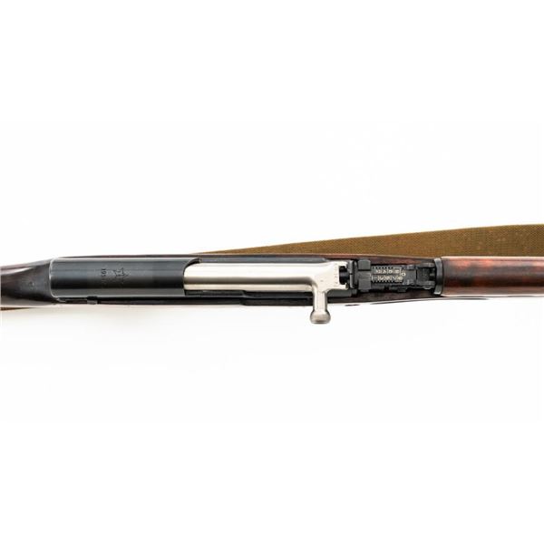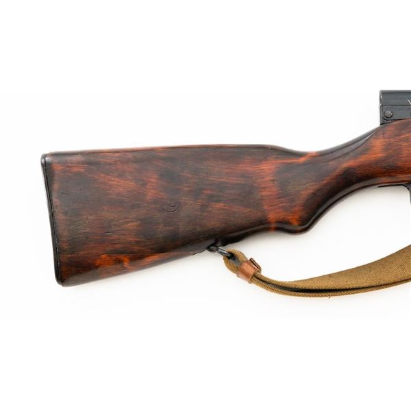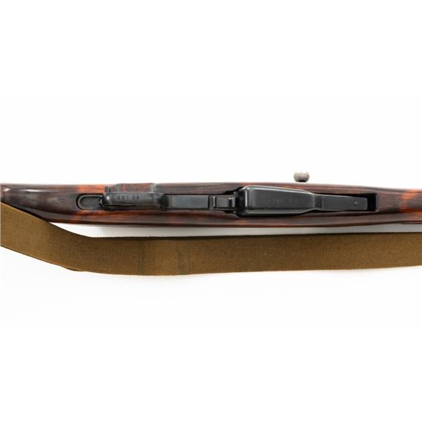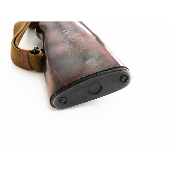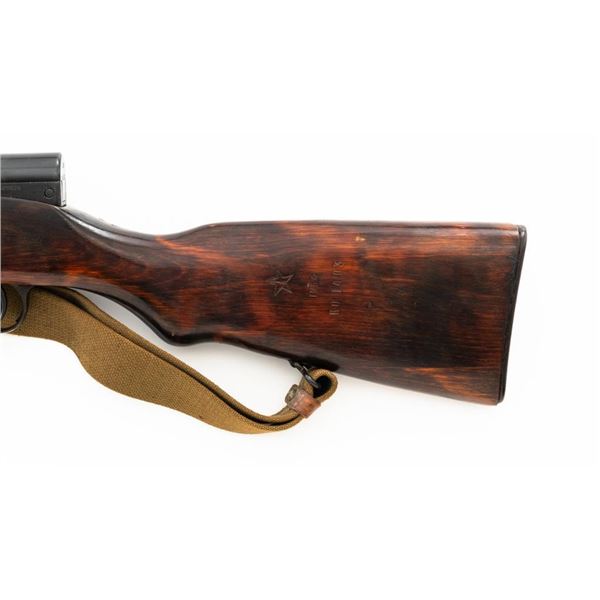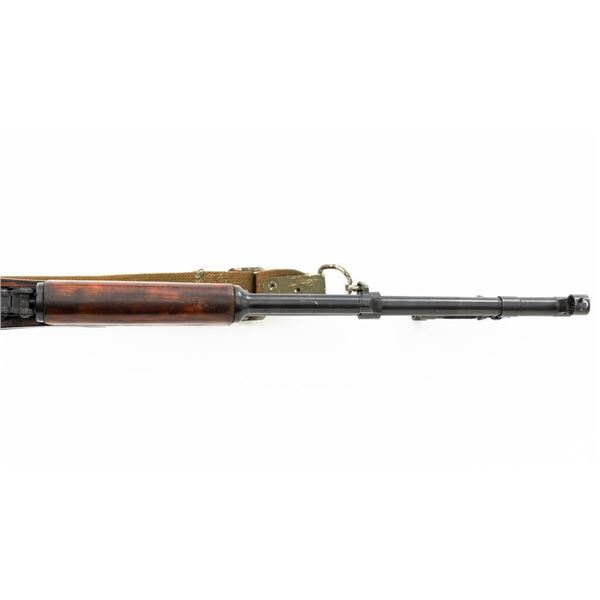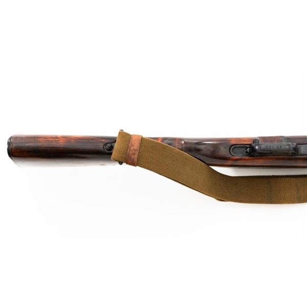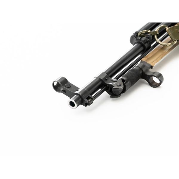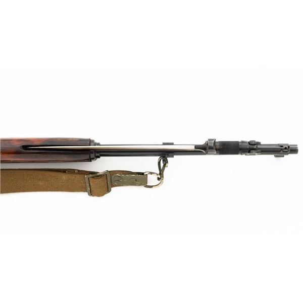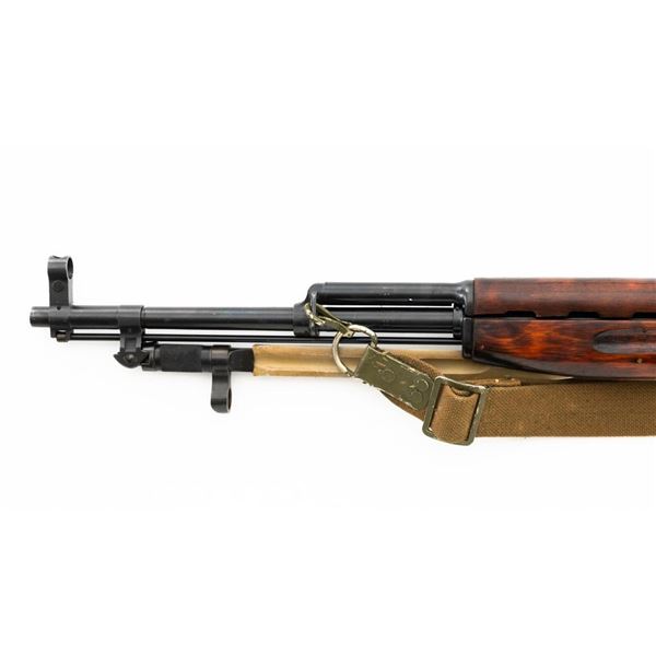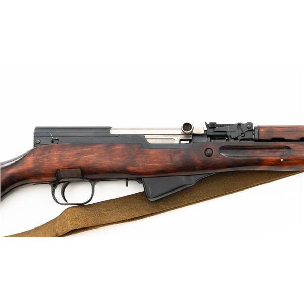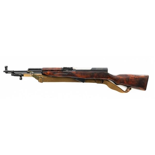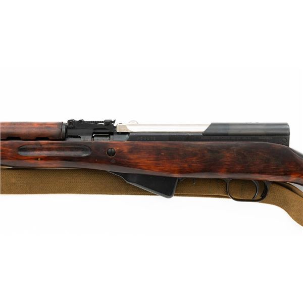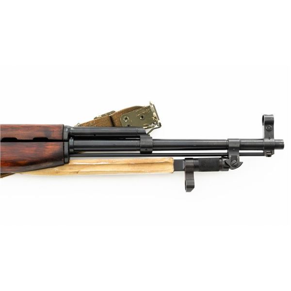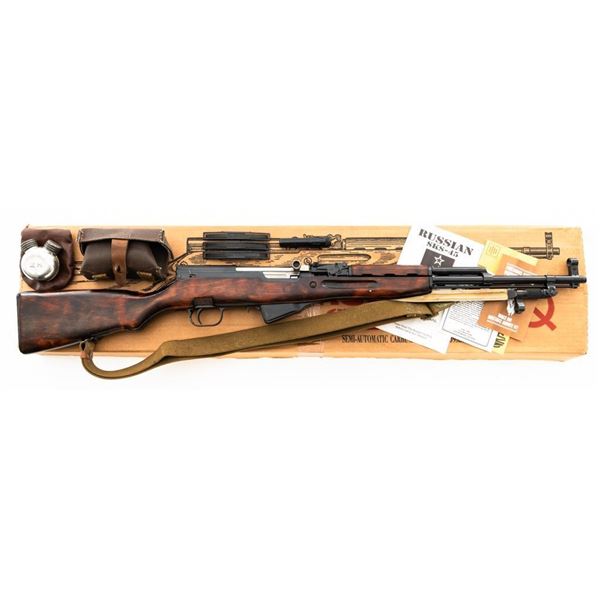 Soviet SKS Semi-Automatic Carbine with Folding Bayonet and Accessories, #RH609824, 7.62x39mm cal., 20.5" barrel, blackened finish, hardwood stock and handguard, hooded post front sight and adjustable tangent "U"-notched rear sight, graduated to 1000 meters. Bright bolt and bolt carrier. Bayonet assembly is in excellent condition and operates smoothly, blade has toned to a golden color. Includes a brown cotton Soviet sling, steel cleaning rod, buttstock cleaning kit, two-cell oil/solvent bottle and carrier, pouch with three (3) stripper clips, owners manual, and cardboard shipping box with matching numbered labels. All the accessories are in very good condition. Top of the receiver cover and left side of the buttstock are marked with the Tula Arsenal makers marks and "1954r". There are inspection stamps on left side of the forend and right side of the buttstock. Matching visible original numbers (KO1403). Importer information and serial number on left side of the receiver. Condition overall is very good+, retaining approx. 90%-92% metal finish, with light wear and handling marks to the barrel and gas cylinder. There is an arsenal spliced repair to the buttstock toe. Otherwise, wood has scattered light handling marks. Action operates smoothly. Bore is bright with excellent, well-defined rifling. Est.: $700-$900. (C&R)