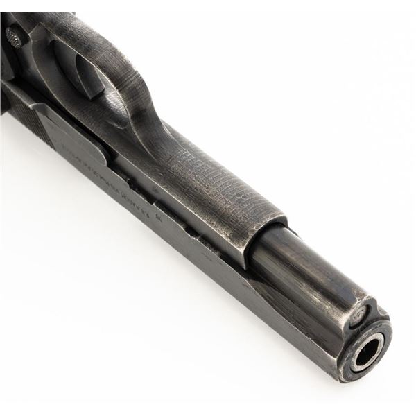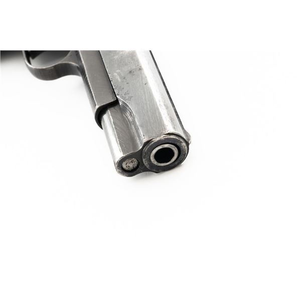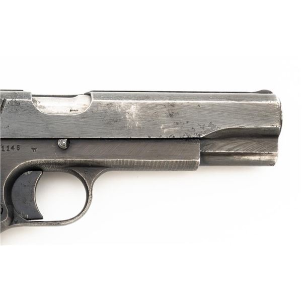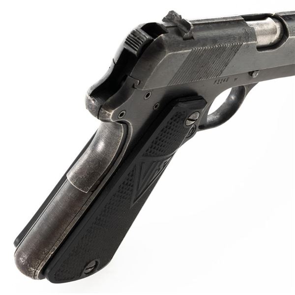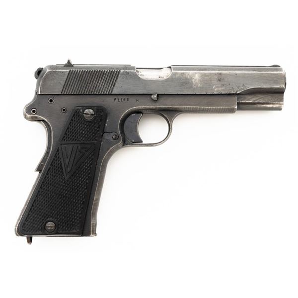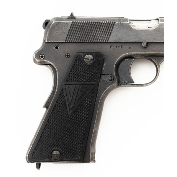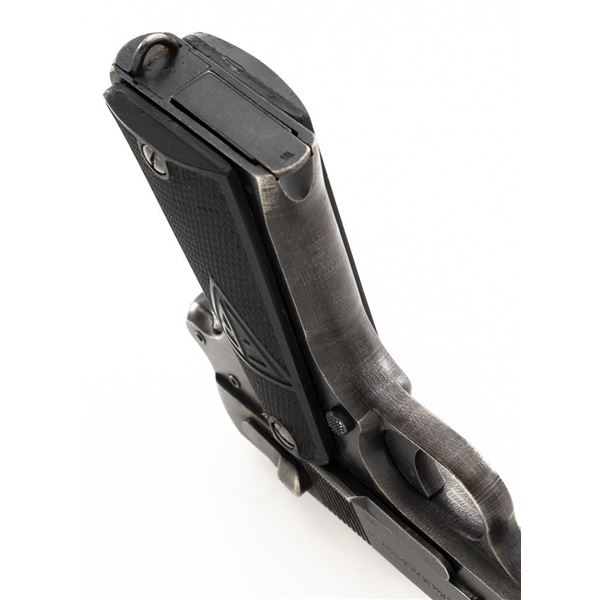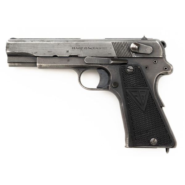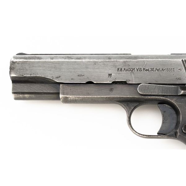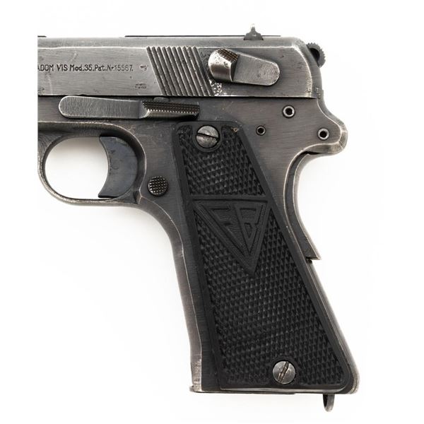German Occupation P35 Radom VIS Semi-Automatic Pistol, #F1146, 9mm cal., 4.6" barrel, blued finish, modern replacement checkered black plastic grips embossed with "FB" and "VIS", blade front sight, and fixed rear sight with "V"- notched groove. Includes one blued steel magazine, stamped "(eagle)189" on the floorplate. Pistol is a Type 3 with single lever and no stock slot. Marked "(eagle)77", "F.B.RADOM VIS Mod.35.Pat.Nr15567", with a Nazi eagle firing proof and "(eagle)WaA625" on the left side slide. There are "(eagle)77" proofs on both sides of the frame. No visible import marks. Condition overall is very good, retaining approx. 70% blue, with flaking along the top of the slide, edge wear, and patina to the grip straps. Grips are excellent. Action operates smoothly. Bore is bright with very good rifling. Est.: $800-$1,000. (C&R/PPT)