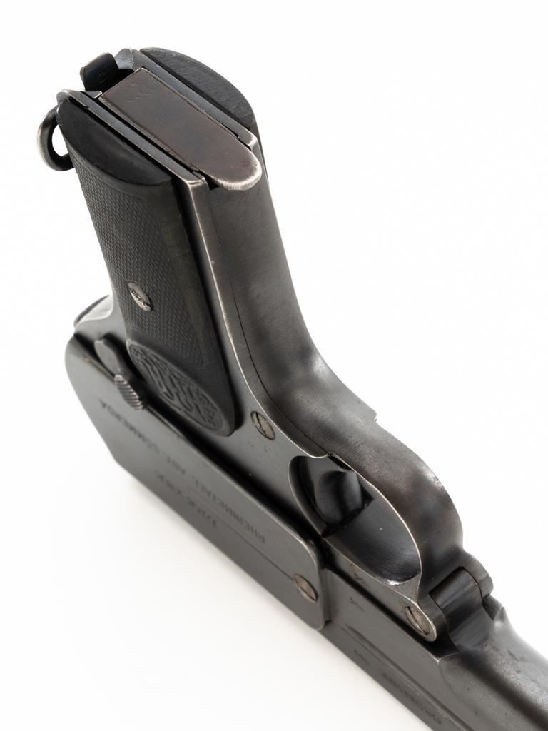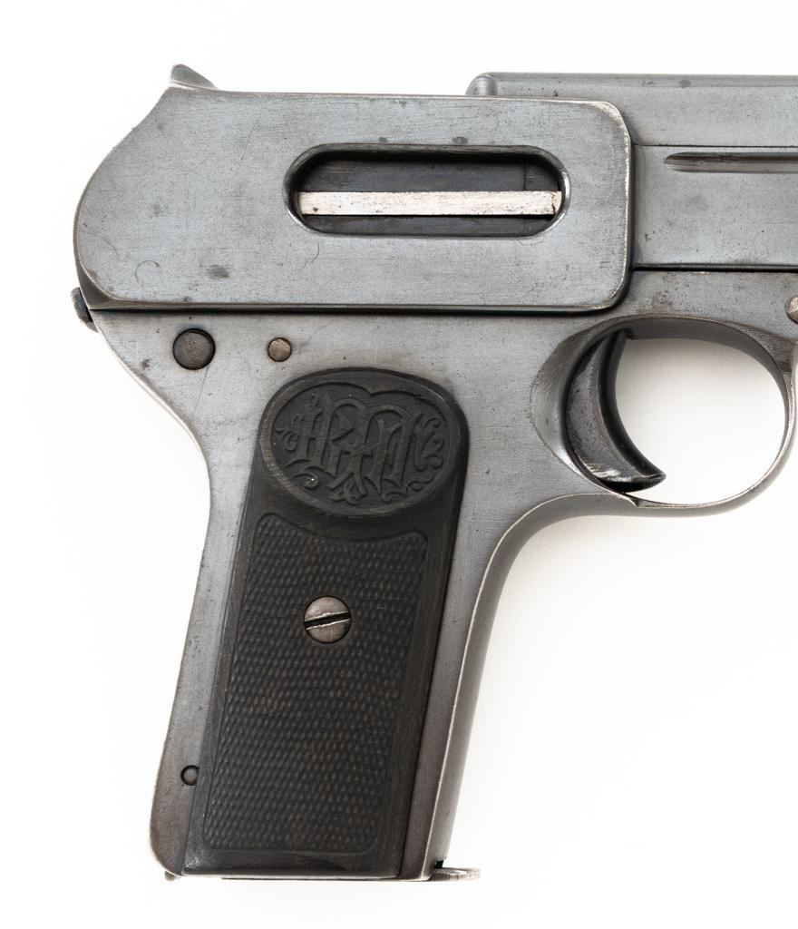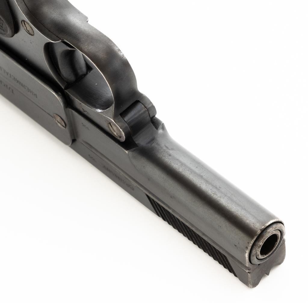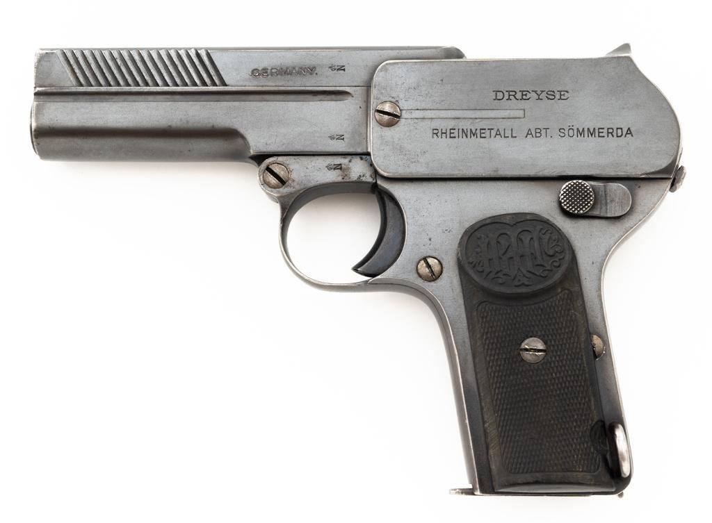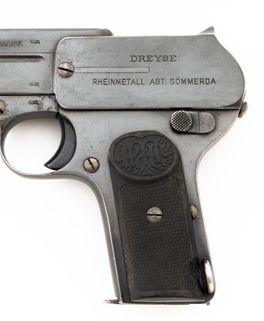 German Dreyse Model 1907 Semi-Automatic Pistol, #234212, .32 ACP cal., 3.5" barrel, blue finish, checkered hard rubber two-piece grips with Dreyse "RMF" monogram, low profile blade front sight, and fixed "V"-notch rear sight, with one 8-round blue steel magazine. Factory markings are clear, with "(crown)/N" proofs twice on the left side of the slide, and once on the frame. There are no visible import marks. Mfgd from 1907-1914. Pistol is in fine overall condition, retaining approx. 93%-94% thinning factory finish, with wear at the muzzle, high point edgewear, and handling marks. There is fine pin prick pitting on the left side of the frame, just above the trigger. Grips are in fine condition, with subtle smoothing of the checkering and minor marks. Action functions well. Bore is very good with defined rifling. Designed by Louis Schmeisser before the First World War, the pistol was still in service in WWII with the Volkssturm and Volksgrenadiers troops. Est.: $300-$500. (C&R/PPT)
