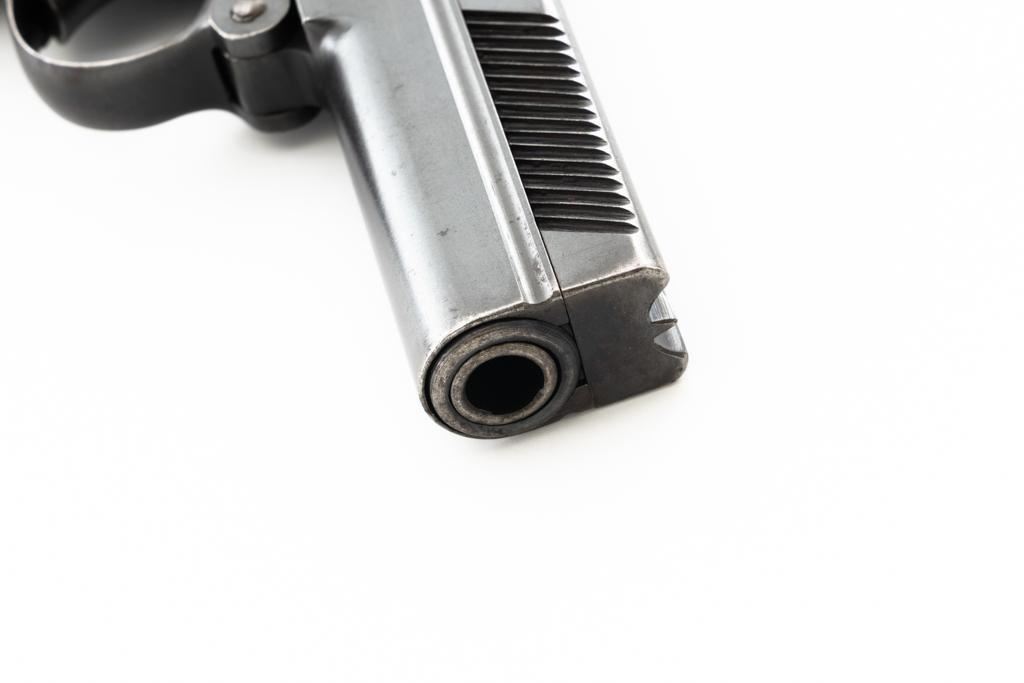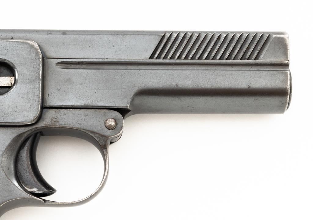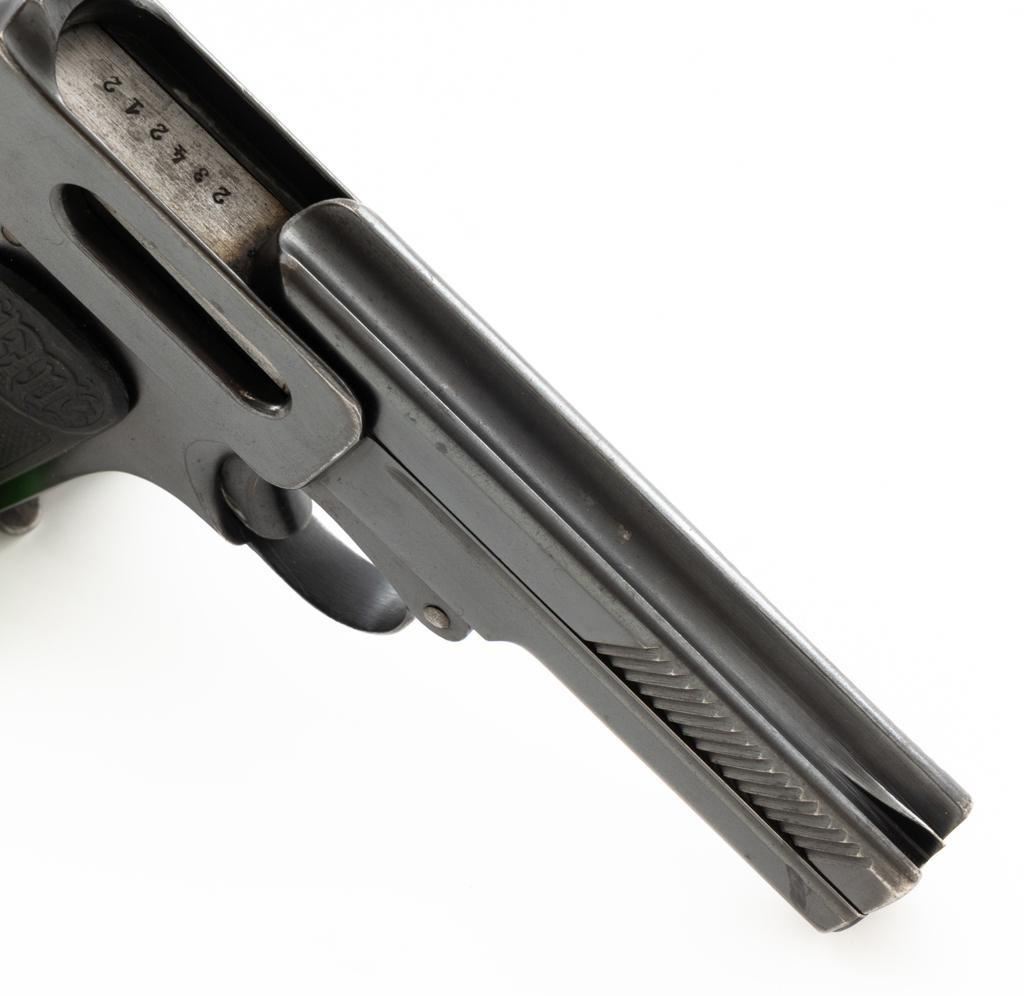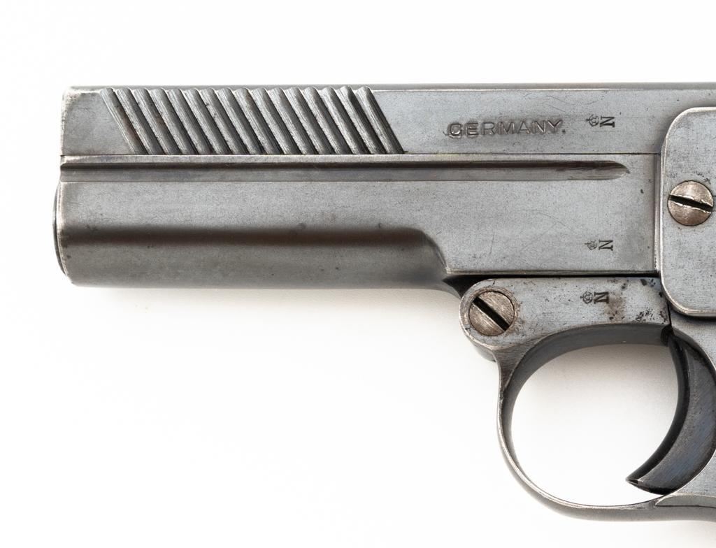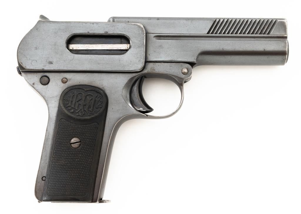 German Dreyse Model 1907 Semi-Automatic Pistol, #234212, .32 ACP cal., 3.5" barrel, blue finish, checkered hard rubber two-piece grips with Dreyse "RMF" monogram, low profile blade front sight, and fixed "V"-notch rear sight, with one 8-round blue steel magazine. Factory markings are clear, with "(crown)/N" proofs twice on the left side of the slide, and once on the frame. There are no visible import marks. Mfgd from 1907-1914. Pistol is in fine overall condition, retaining approx. 93%-94% thinning factory finish, with wear at the muzzle, high point edgewear, and handling marks. There is fine pin prick pitting on the left side of the frame, just above the trigger. Grips are in fine condition, with subtle smoothing of the checkering and minor marks. Action functions well. Bore is very good with defined rifling. Designed by Louis Schmeisser before the First World War, the pistol was still in service in WWII with the Volkssturm and Volksgrenadiers troops. Est.: $300-$500. (C&R/PPT)