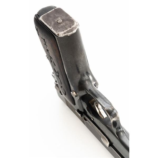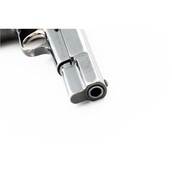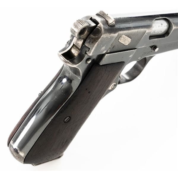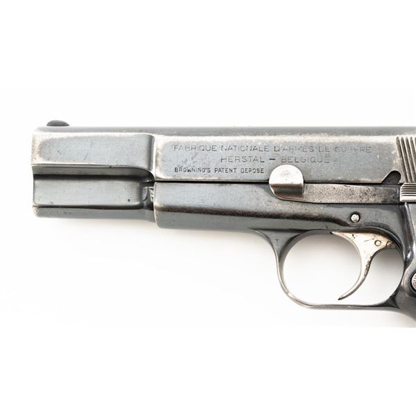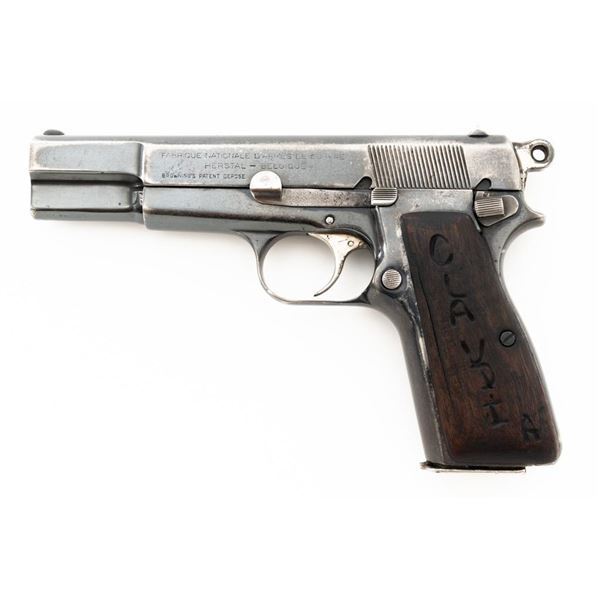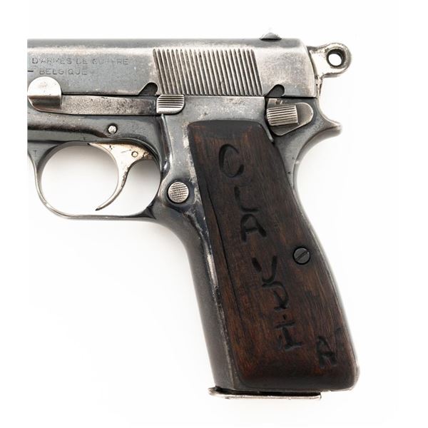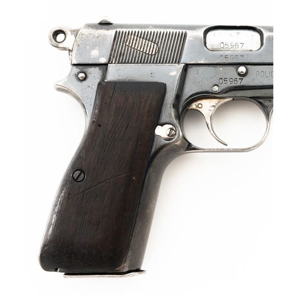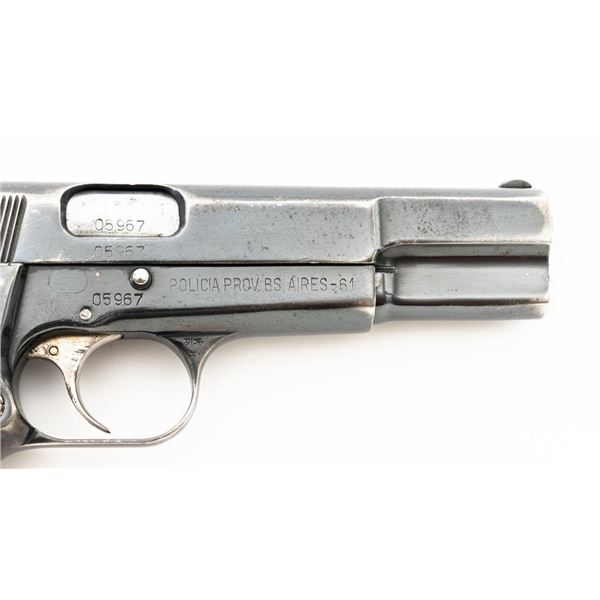 Buenos Aires PD Marked Belgian FN Hi-Power Semi-Automatic Pistol, #05967, 9mm cal., 4.6" barrel, blue finish, smooth walnut grips, blade front sight, drift adjustable "V"-notch rear sight, ringed hammer, internal extractor, with one blue steel 10-round magazine with mis-matched serial number. All-matching visible serial numbers on the pistol. Factory markings are partially legible, with Belgian proofs on the right side of the trigger guard and barrel, marked "POLICIA PROV. B.S. AIRES-61" on the right side of the frame, no visible import marks. Part of Argentinas purchase of 1950s era FN Hi-Power pistols for their police services. Pistol is in very good overall condition, retaining approx. 80%-85% of an old reblued finish that shows thinning and holster wear along the slide and frame. Additionally, there are some areas of light surface erosion and smoothing of the edges. Hammer and trigger show remnants of thinning nickel finish. There are traces of the Argentine Crest on top of the slide. Grips are worn smooth with general indentations. Left panel is deeply carved "CLAUDIA" in a vertical pattern. Action functions smoothly. Bore is good, showing moderate erosion and shallow but visible rifling. Est.: $600-$800. (C&R)