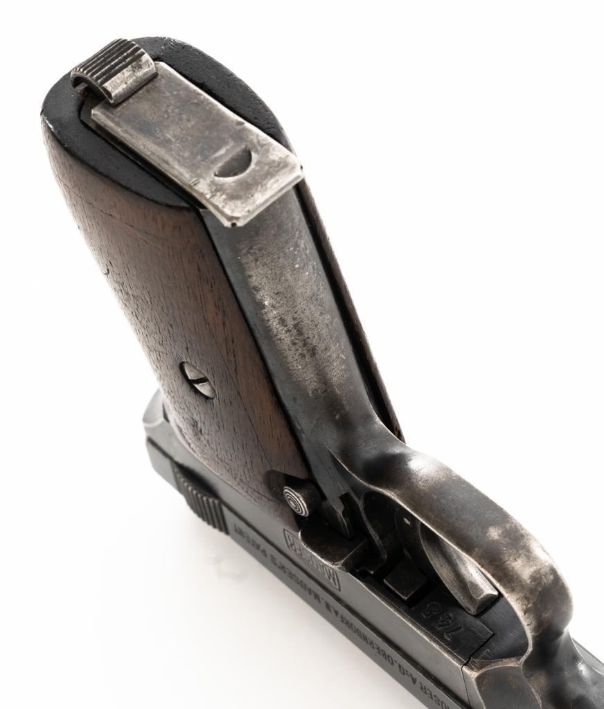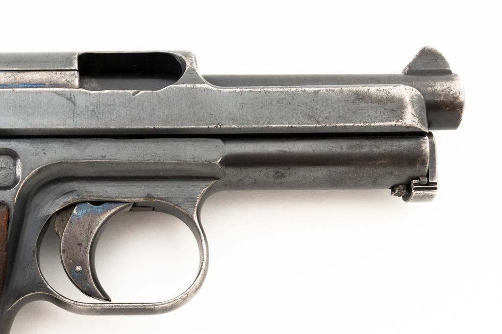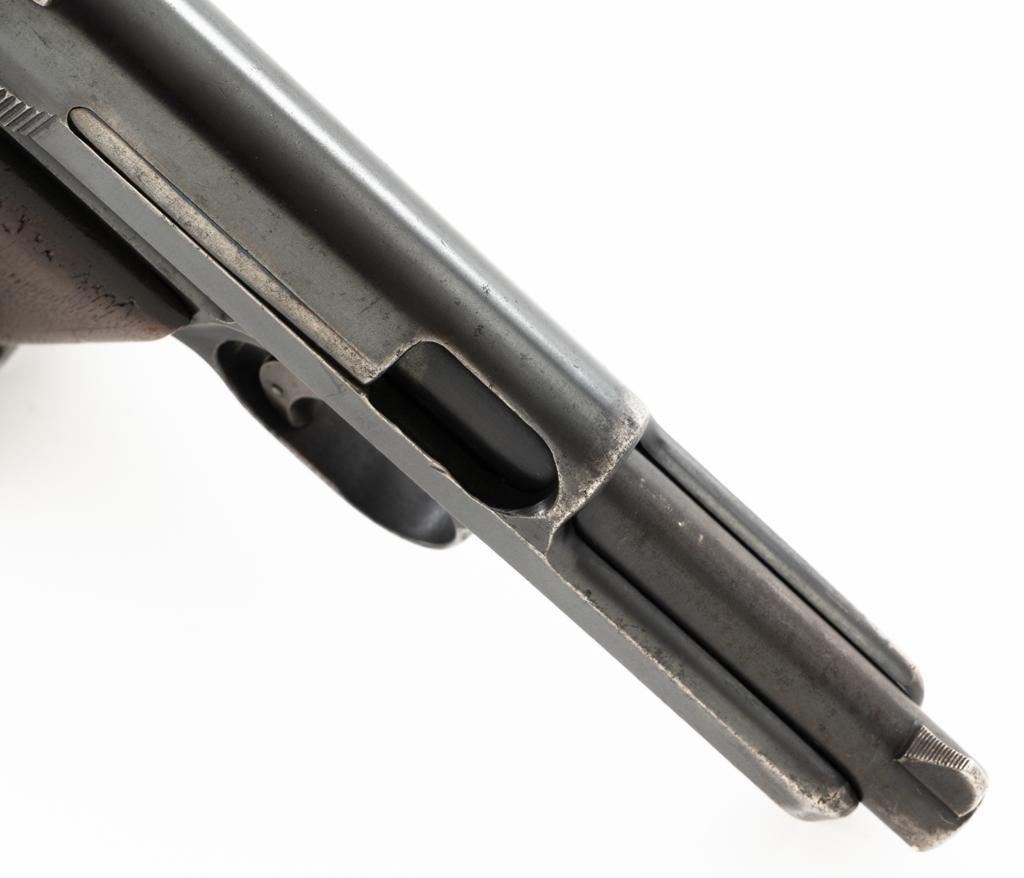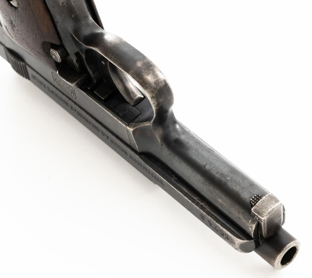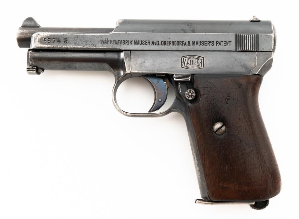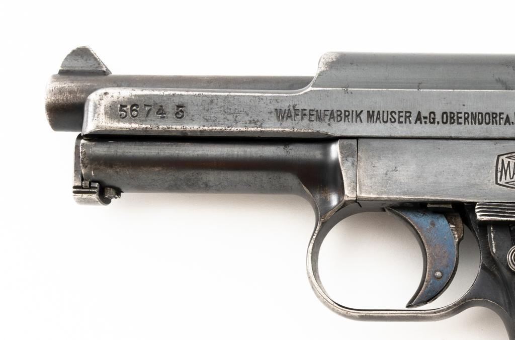 Mauser Model 1914 Pocket Semi-Automatic Pistol, #56743, .32 ACP cal., 3.4" barrel, blue finish, checkered walnut two-piece grips, blade front sight, fixed "U"-notch rear sight, includes one 8-round blue steel magazine. Factory markings are clear, with Mauser banner on the left side of the frame. No visible import marks. Pistol is in fine overall condition, retaining approx. 90%-95% thinning factory finish, showing some areas of thinning, holster wear at the muzzle and along the slide. Right side of the slide shows heavier edgewear and indentations. Trigger displays traces of bright nitre blue finish. Grips are in good condition, worn nearly smooth from use, with indentations and other marks from handling. Action functions smoothly. Bore is good with moderate frosting, and a spot of light pitting midway down the barrel, displaying defined rifling. $250-$350. (C&R)