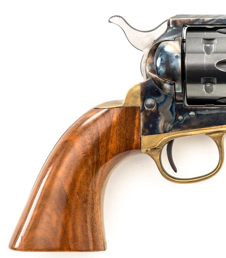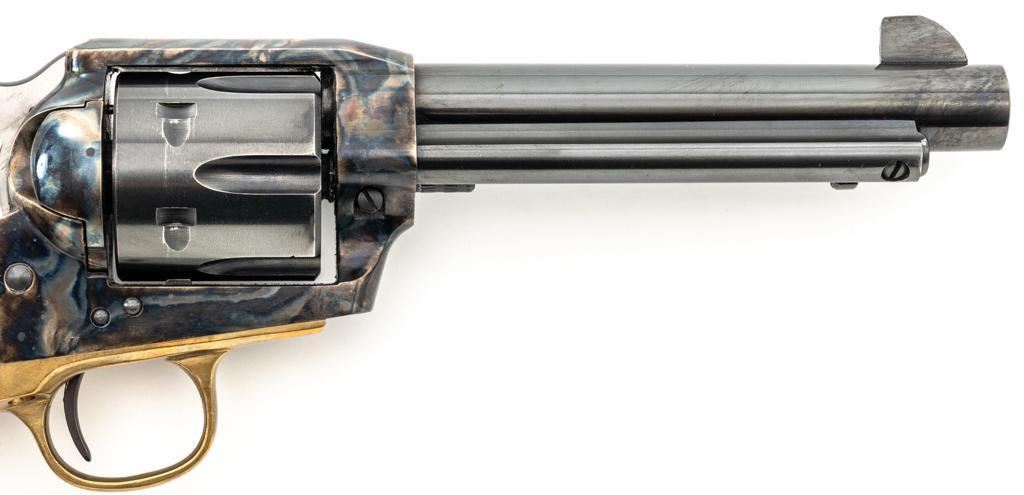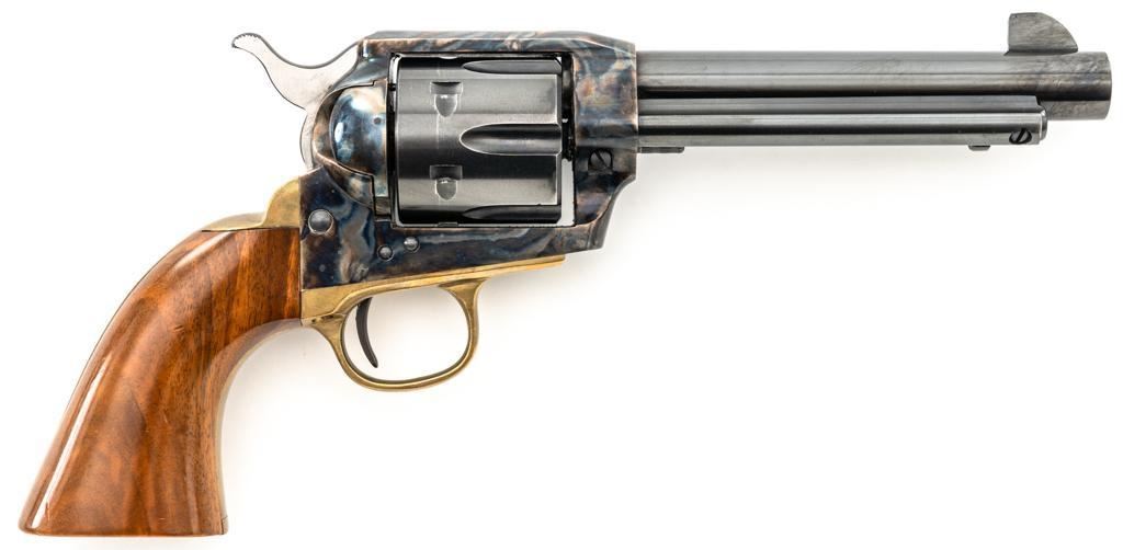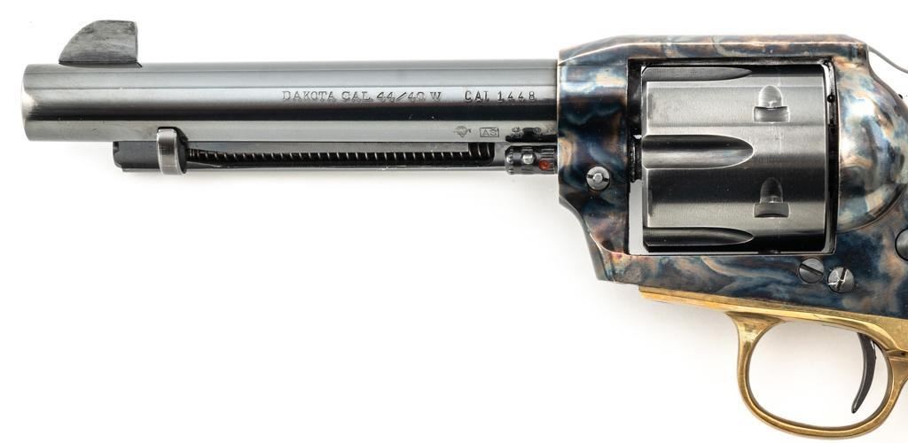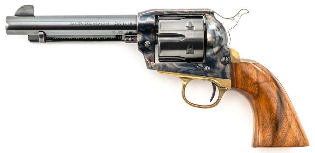 Dakota Model 1873 Single Action Army Revolver with Extra Cylinder, #84058, .44-40 cal., 5.5" barrel, blue and color case hardened finish, smooth walnut two-piece grips, blade front and fixed square notch rear sights, brass straps and trigger guard. Factory markings are clear, with Italian proofs, marked "JAGER ITALY" on top of the barrel and import marked on the underside. Includes an extra .44 cal. blue cylinder with the matching serial number. Revolver is in near excellent overall condition, retaining approx. 96%-97% factory finish, with holster wear at the muzzle. Cylinder shows light leading edgewear and index line. Frame displays vivid color case hardened finish. Grips are near excellent with flea bite indentations and a scratch on the base of the right panel. Action is crisp with good timing. Bright bore rates near excellent with well-defined rifling. Est.: $300-$500. (Modern/PPT)