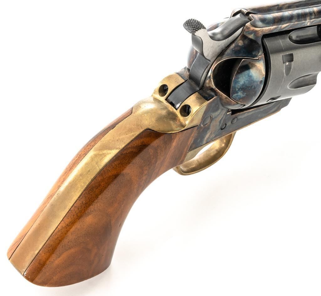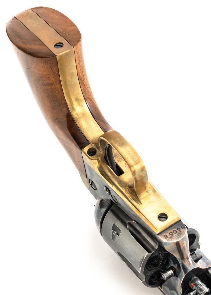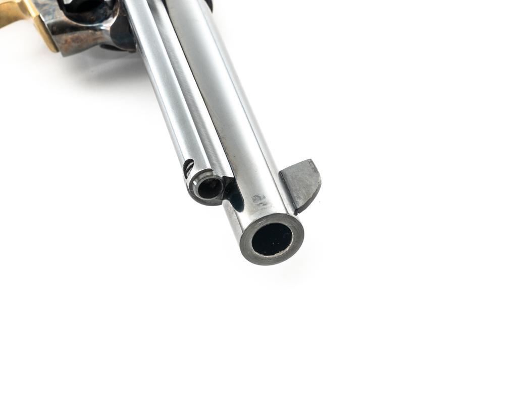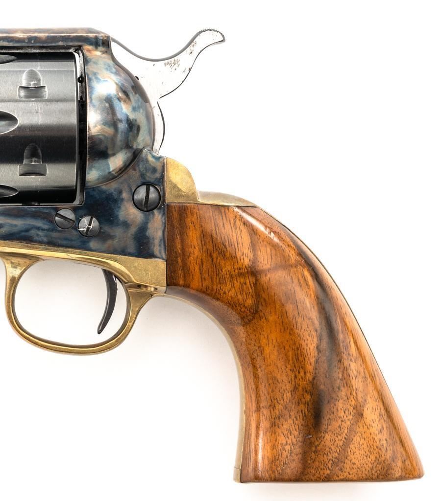 Dakota Model 1873 Single Action Army Revolver with Extra Cylinder, #84058, .44-40 cal., 5.5" barrel, blue and color case hardened finish, smooth walnut two-piece grips, blade front and fixed square notch rear sights, brass straps and trigger guard. Factory markings are clear, with Italian proofs, marked "JAGER ITALY" on top of the barrel and import marked on the underside. Includes an extra .44 cal. blue cylinder with the matching serial number. Revolver is in near excellent overall condition, retaining approx. 96%-97% factory finish, with holster wear at the muzzle. Cylinder shows light leading edgewear and index line. Frame displays vivid color case hardened finish. Grips are near excellent with flea bite indentations and a scratch on the base of the right panel. Action is crisp with good timing. Bright bore rates near excellent with well-defined rifling. Est.: $300-$500. (Modern/PPT)