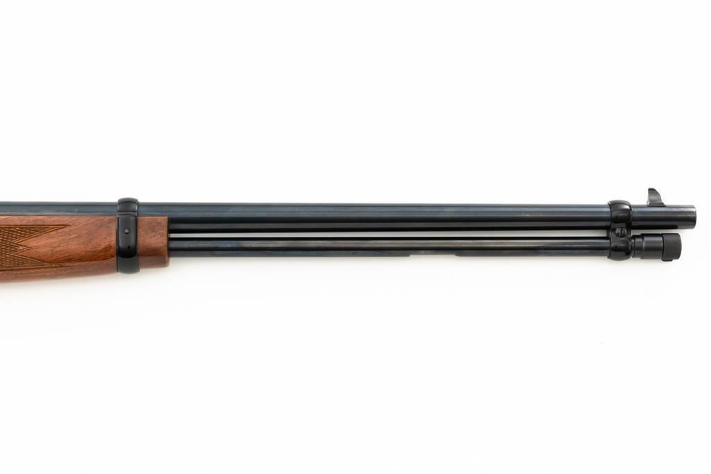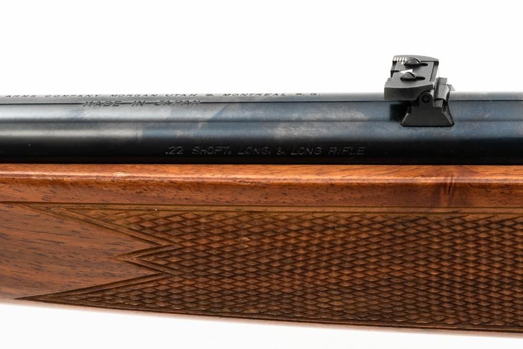 Browning BL-22 Grade II Lever Action Rifle, #70B80133, .22 S-L-LR cal., 20" barrel, blue finish with factory scroll engraving on the receiver, gloss-finished checkered American walnut stock and forend, with dovetailed blade front and folding semi-buckhorn rear sight. Stock ends with a plastic Browning buttplate, providing a 13.5" LOP. Barrel is marked "BROWNING ARMS COMPANY ST LOUIS Mo. & MONTREAL P.Q. / MADE IN JAPAN". Mfgd 1970. Rifle is in excellent overall condition, showing little use, with only light handling marks, retaining approx. 99% factory blue. Stock is in near excellent condition, with light impressions and storage marks. Action is crisp and functions smoothly. Bore is mirror bright with excellent rifling. Est.: $600-$800. (C&R)