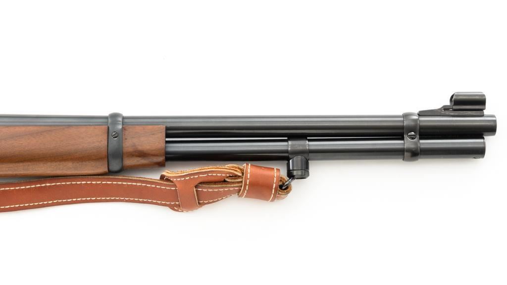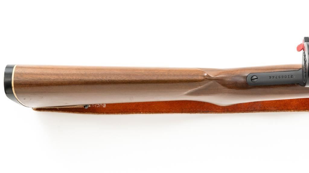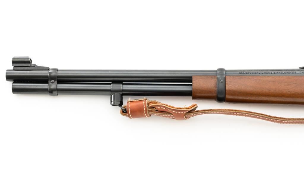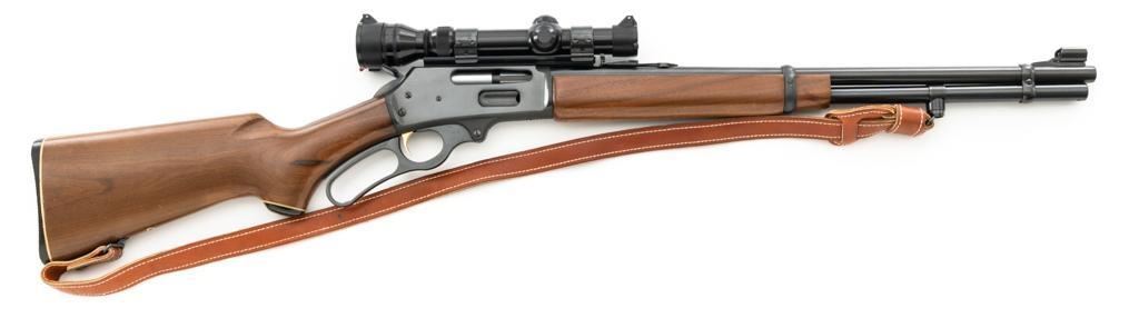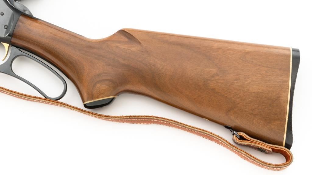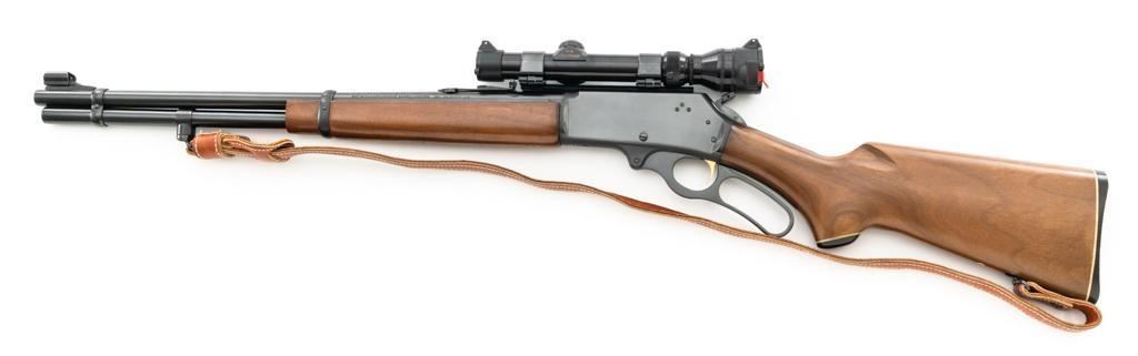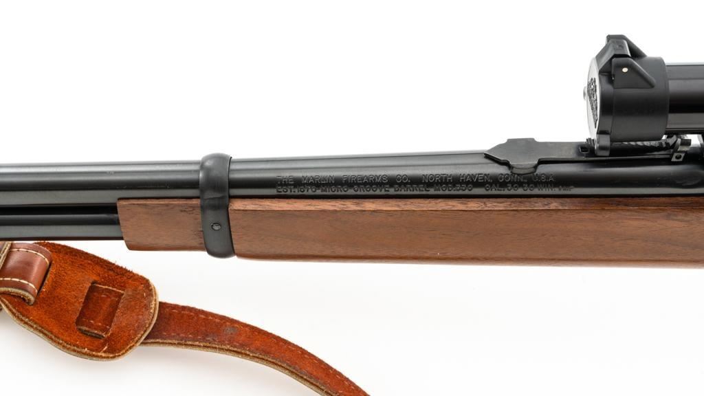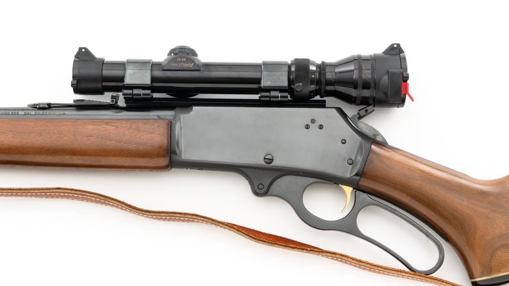 Marlin Model 336 Lever Action Rifle, #21069744, .30-30 Win. cal., 20" "JM" marked barrel, blue finish. Smooth walnut pistol grip stock and forend with sling swivels, Marlin "Bullseye", ending with a checkered plastic Marlin buttplate, providing a 13.4" LOP. Rifle also features a hooded brass beaded blade front sight, notched folding rear sight, gold colored trigger, and added hammer extension. Topped with Weaver one-piece base, rings, and Redfield 1-4x scope, with gloss black finish, duplex reticle. Exterior of the scope shows some light marks, optics are clear and bright. Includes a set of Butler Creek flip-up lens covers and leather Bucheimer sling. Mfgd 1979. Rifle is in near excellent overall condition, retaining approx. 97%-98% blue, with light wear at the muzzle, and a dent on the exterior of the barrel at the left side near the breech. Receiver shows modest edgewear and light handling marks. Stock is in excellent condition with only minor storage marks. Action functions well and locks up securely. Bore is near excellent with crisp rifling. Est.: $500-$700. (Modern)