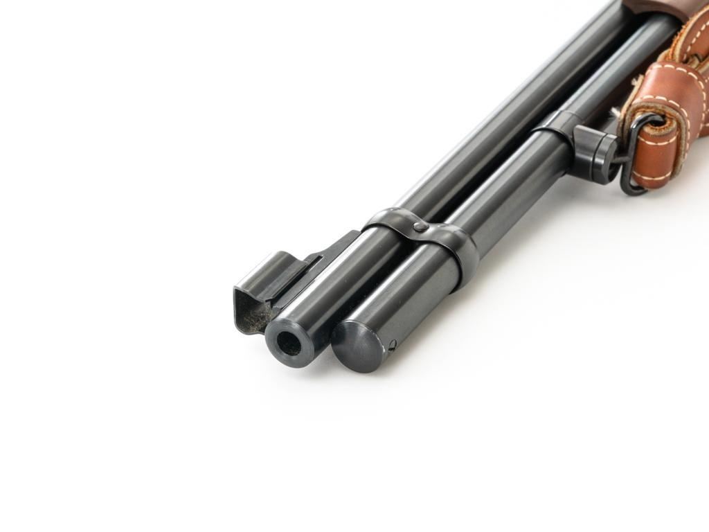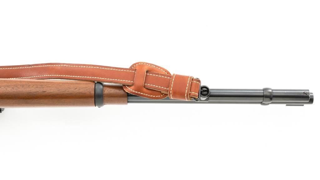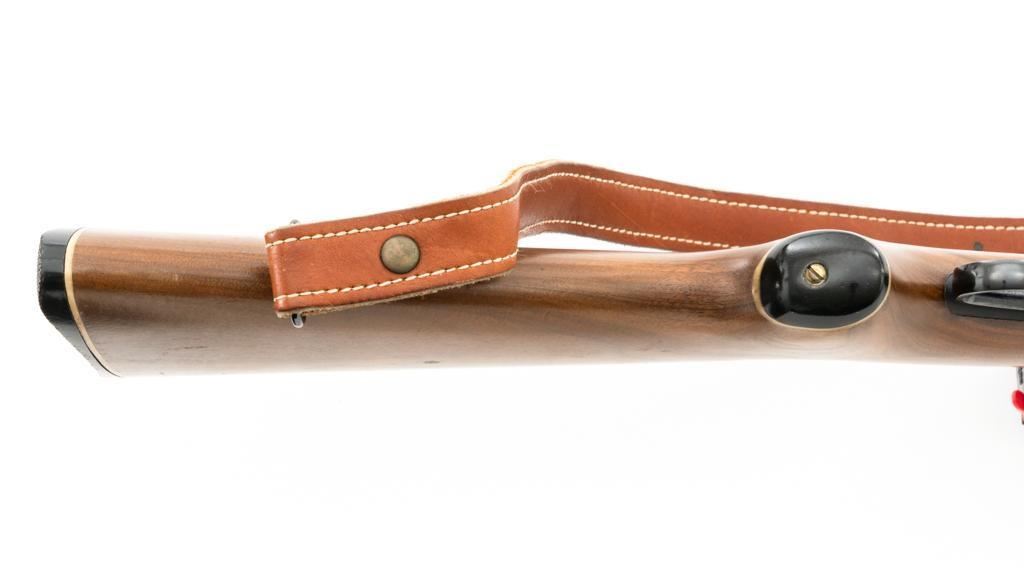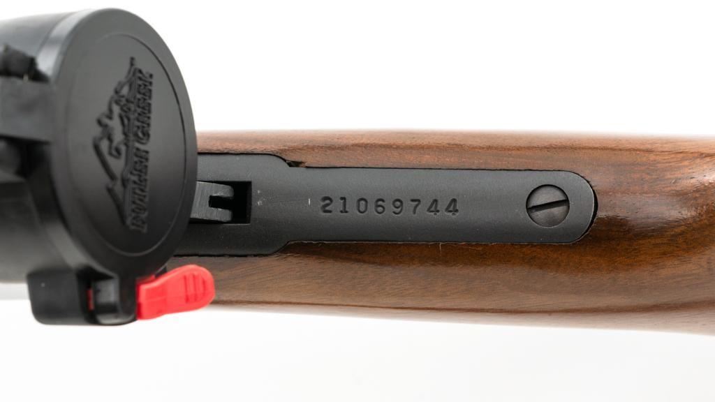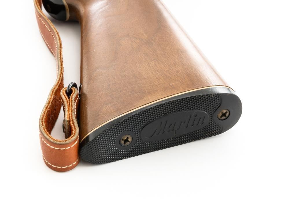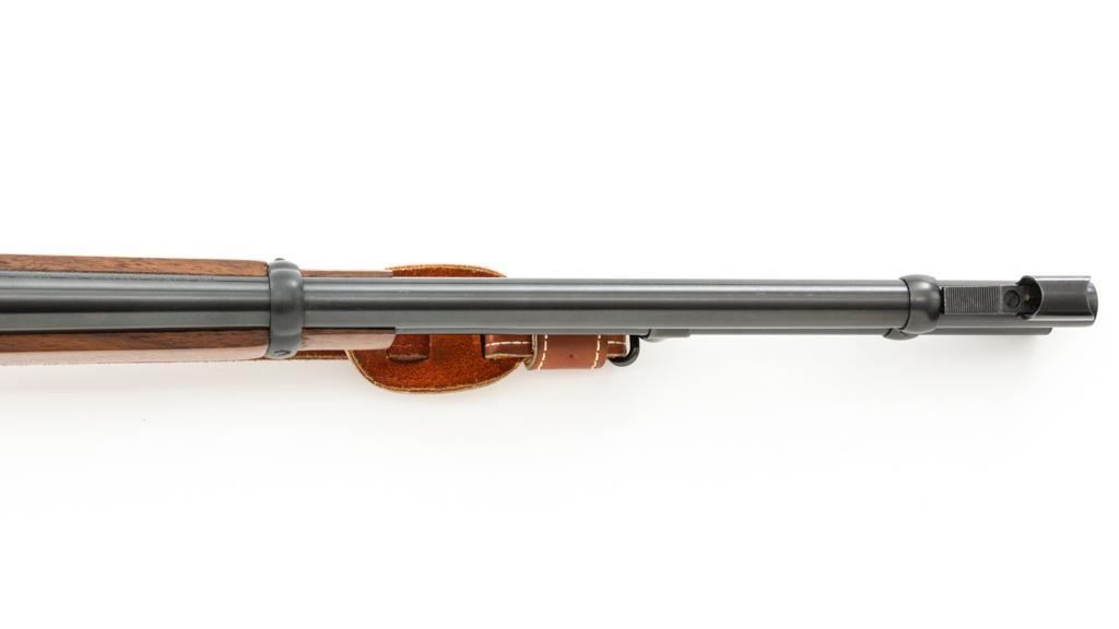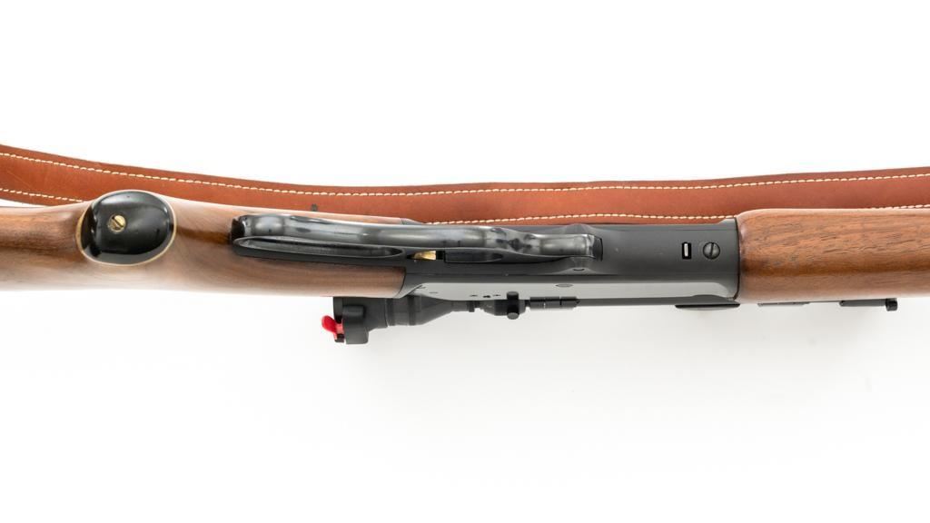 Marlin Model 336 Lever Action Rifle, #21069744, .30-30 Win. cal., 20" "JM" marked barrel, blue finish. Smooth walnut pistol grip stock and forend with sling swivels, Marlin "Bullseye", ending with a checkered plastic Marlin buttplate, providing a 13.4" LOP. Rifle also features a hooded brass beaded blade front sight, notched folding rear sight, gold colored trigger, and added hammer extension. Topped with Weaver one-piece base, rings, and Redfield 1-4x scope, with gloss black finish, duplex reticle. Exterior of the scope shows some light marks, optics are clear and bright. Includes a set of Butler Creek flip-up lens covers and leather Bucheimer sling. Mfgd 1979. Rifle is in near excellent overall condition, retaining approx. 97%-98% blue, with light wear at the muzzle, and a dent on the exterior of the barrel at the left side near the breech. Receiver shows modest edgewear and light handling marks. Stock is in excellent condition with only minor storage marks. Action functions well and locks up securely. Bore is near excellent with crisp rifling. Est.: $500-$700. (Modern)