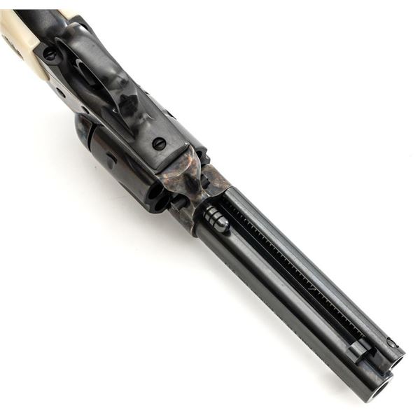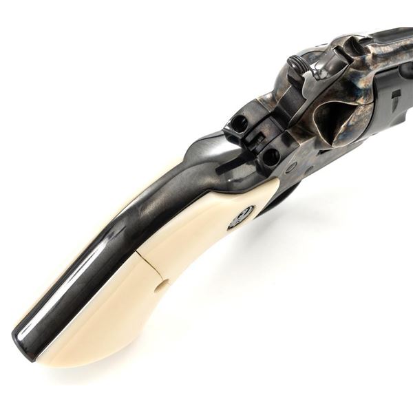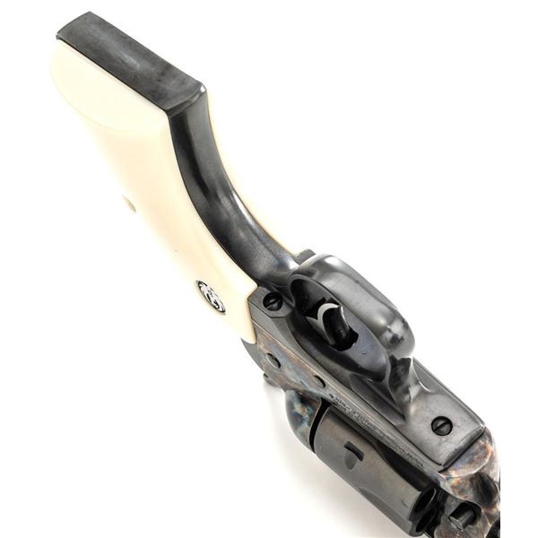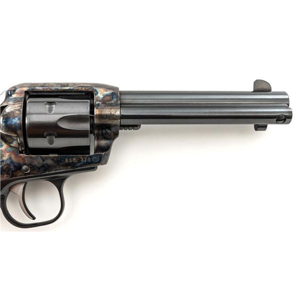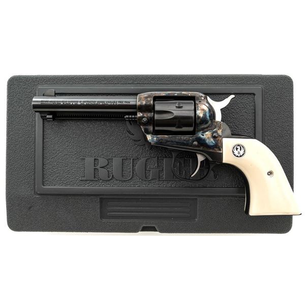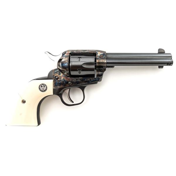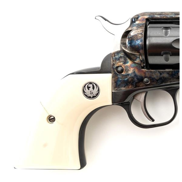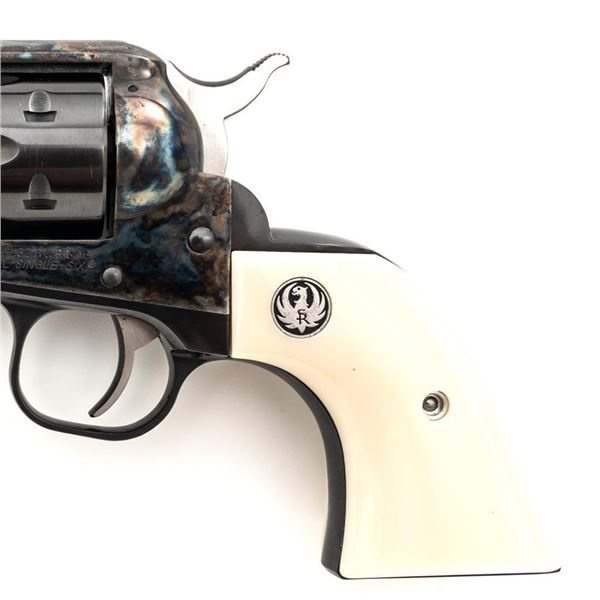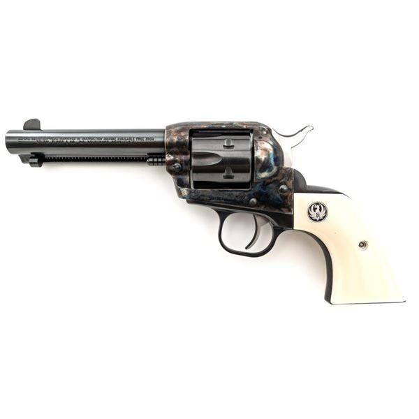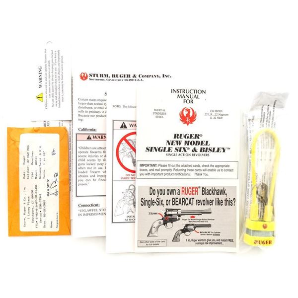 Ruger New Model Single-Six Revolver, #650-37941, .32 H&R Mag. cal., 4.6" barrel, blue finish, color case hardened frame, smooth simulated ivory grips with inlaid Ruger medallions, fixed blade front sight, and fixed notched rear sight. Mfgd 2001. In original Ruger hard plastic case with matching end label, paperwork, cable lock, and fired case. Condition is excellent with light handling marks and an extremely light index line to cylinder. Action is smooth. Bore is bright with excellent rifling. Est.: $500-$700. (Modern/PPT)