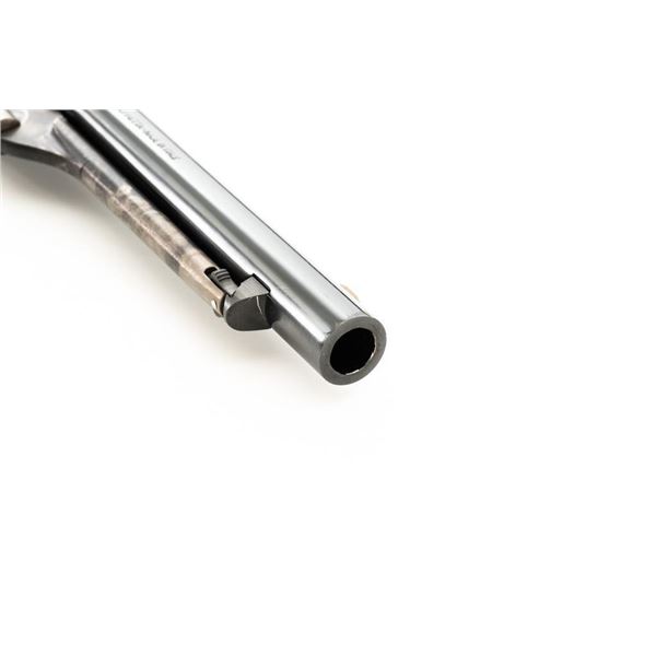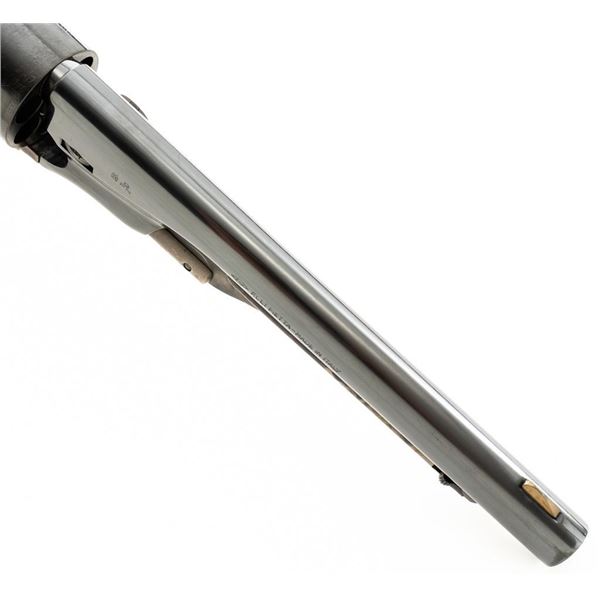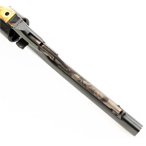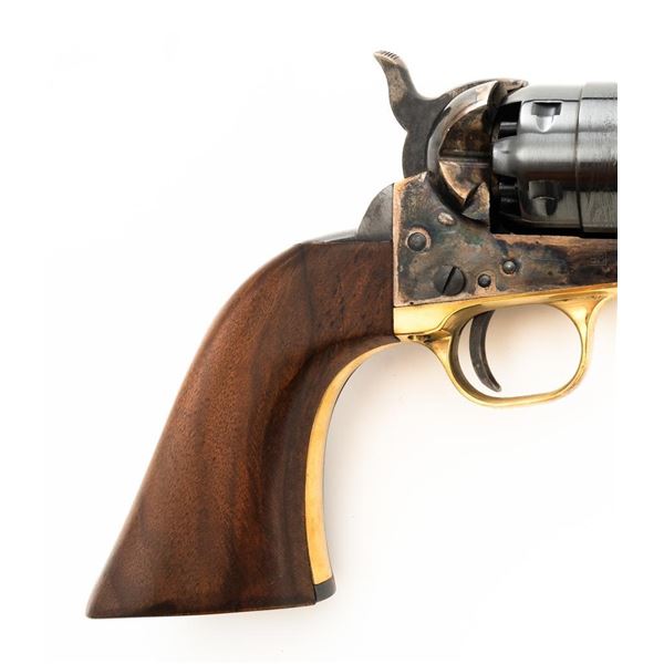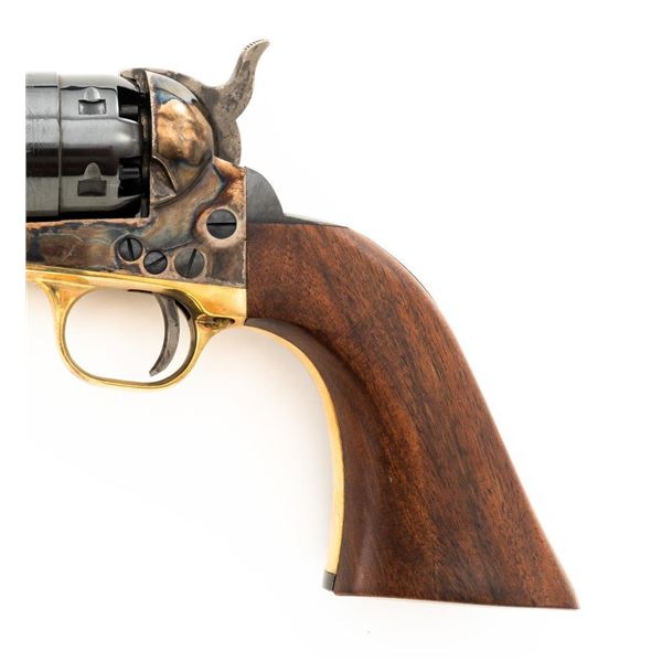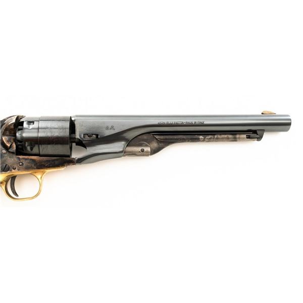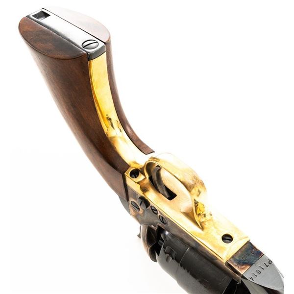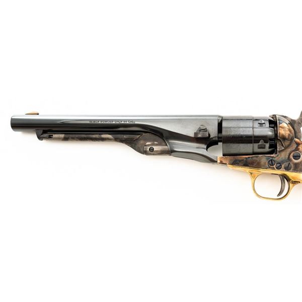 Italian Pietta 1860 Army Steel Frame Single Action Black Powder Percussion Revolver, #P71014, .44 Cal., 8" round barrel, blue and color case hardened finish with a steel frame, brass trigger guard, smooth hardwood one-piece grip, brass blade front sight, "V"-notch rear sight located on the hammer, 6-shot rebated roll engraved cylinder. Marked "MADE IN ITALY" on the right side of the barrel. Revolver is in excellent overall condition, retaining approx. 99%+ blue finish on the barrel and steel backstrap. Nipples and hammer face show no use with all safety pins intact. Grips are in excellent condition with attractive figure. Action is crisp. Bore is bright with excellent rifling. Est.: $200-$400. (No FFL Required)