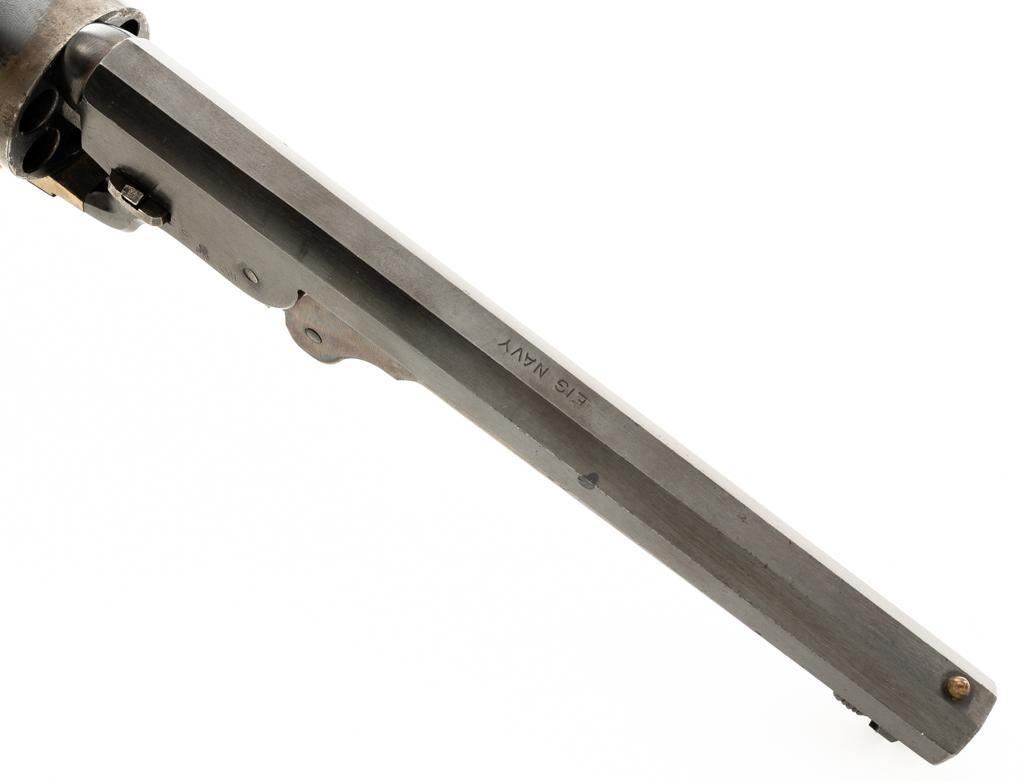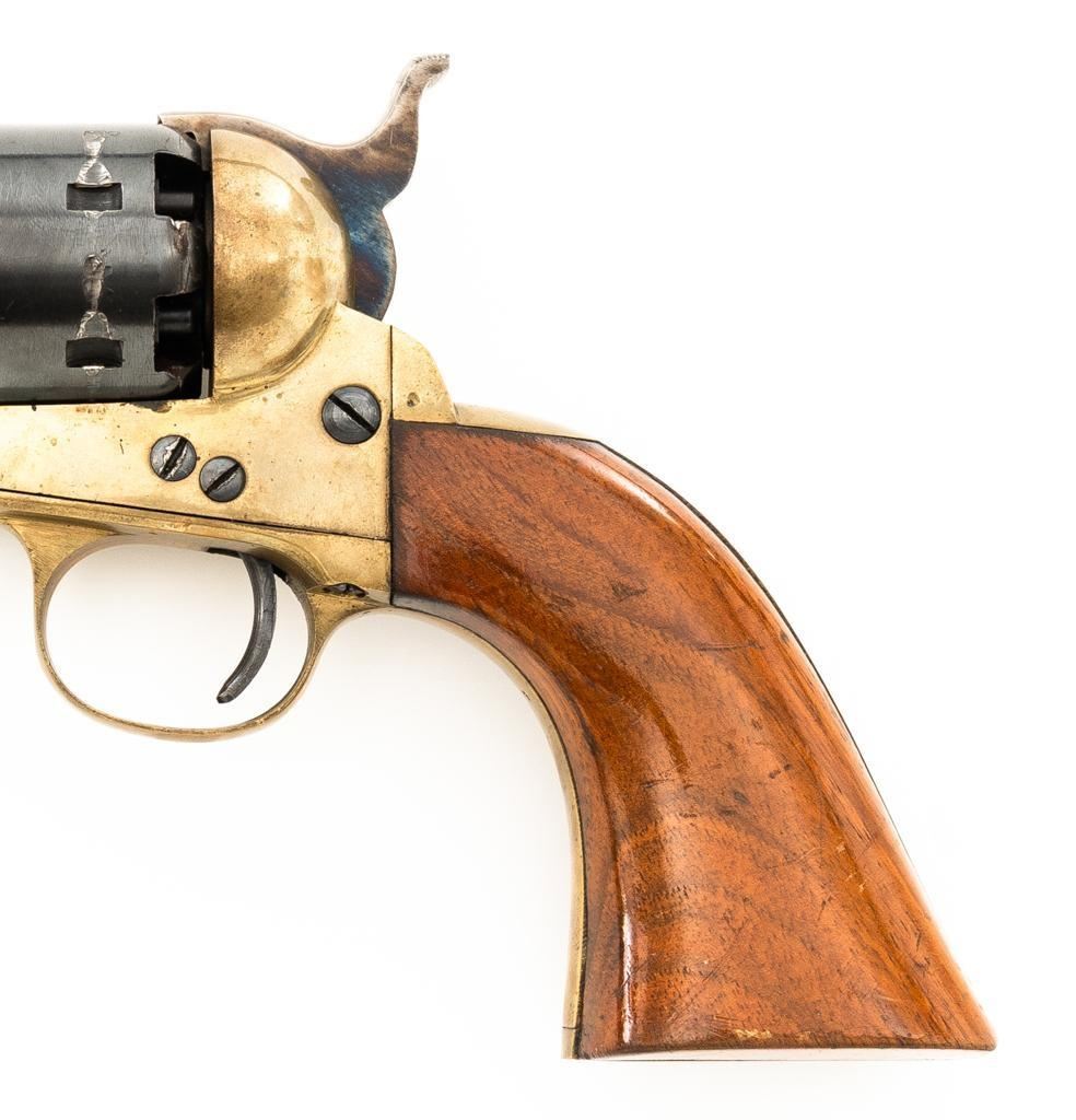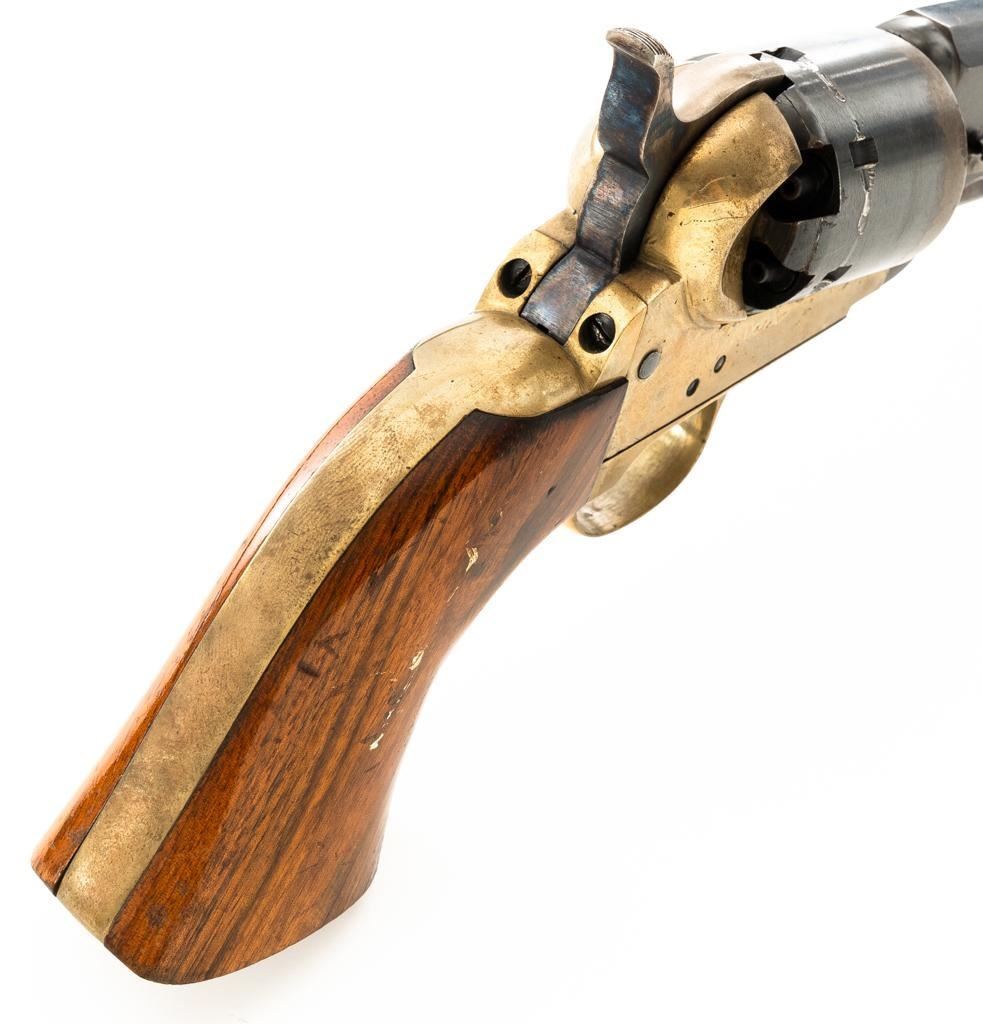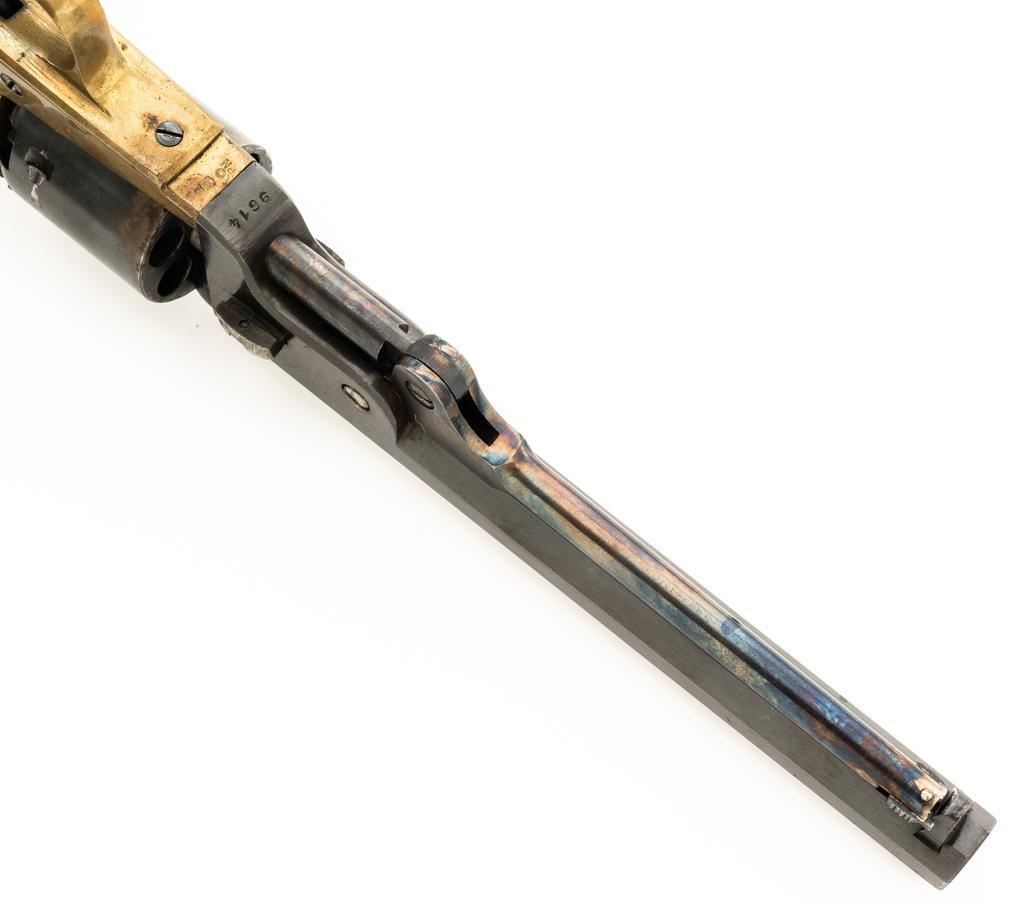 Italian EIG 1851 Navy Black Powder Percussion Revolver, #9614, .36 cal., 7.5" octagon barrel, blue finish, smooth walnut two-piece grips, color case hardened lever and hammer, brass pin front sight, and "V"-notched rear sight located on the hammer face; brass frame, trigger guard, and back strap. Revolver is in very good condition, retaining approx. 90%-95% finish, with minor marks along the barrel. Cylinder shows moderate loss of finish at the leading edge, with light erosion and index line at the rear. Grips with scattered scratches and minor indentations. Action functions well and locks up securely. Bore is near excellent with sharp rifling. Est.: $200-$300. (No FFL Required)