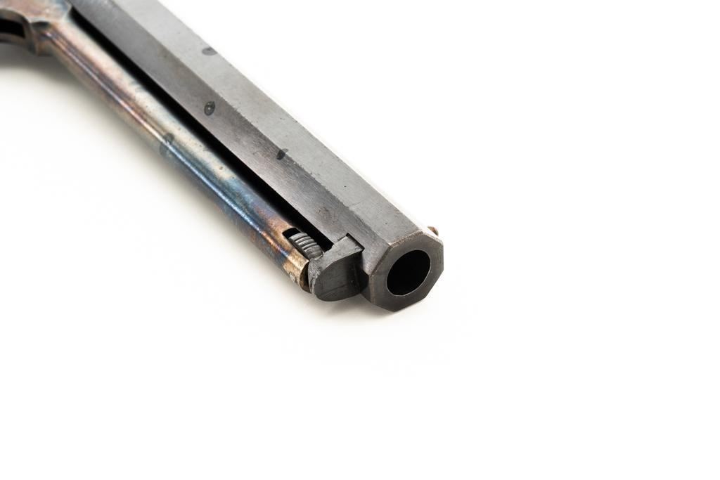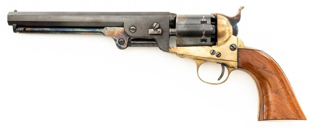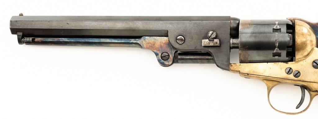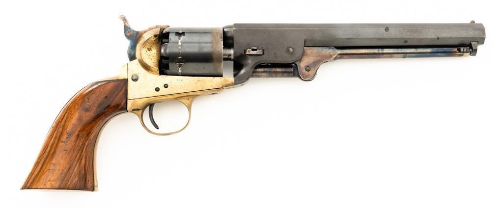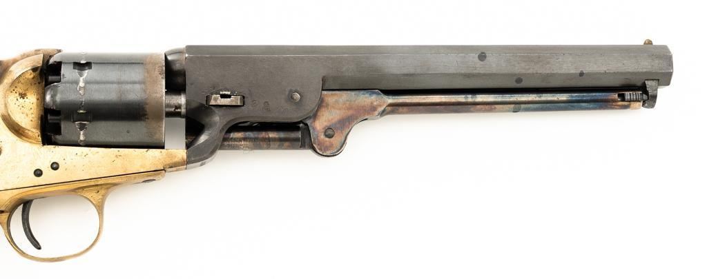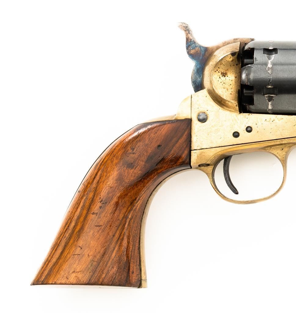 Italian EIG 1851 Navy Black Powder Percussion Revolver, #9614, .36 cal., 7.5" octagon barrel, blue finish, smooth walnut two-piece grips, color case hardened lever and hammer, brass pin front sight, and "V"-notched rear sight located on the hammer face; brass frame, trigger guard, and back strap. Revolver is in very good condition, retaining approx. 90%-95% finish, with minor marks along the barrel. Cylinder shows moderate loss of finish at the leading edge, with light erosion and index line at the rear. Grips with scattered scratches and minor indentations. Action functions well and locks up securely. Bore is near excellent with sharp rifling. Est.: $200-$300. (No FFL Required)