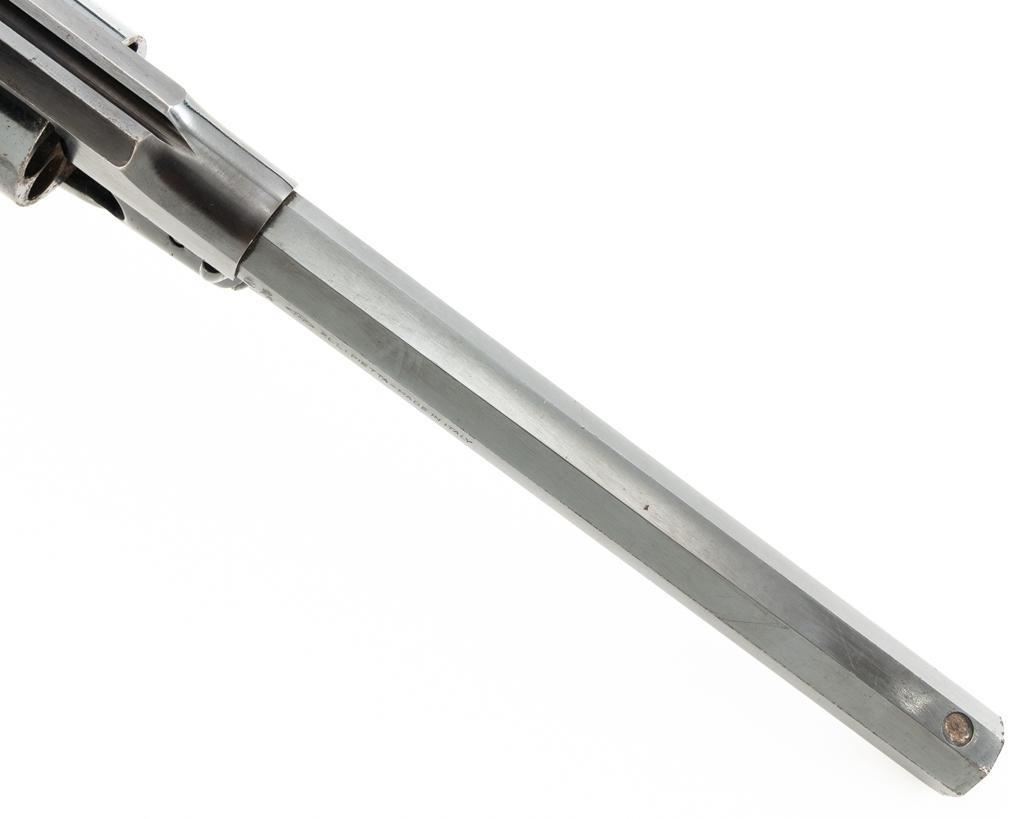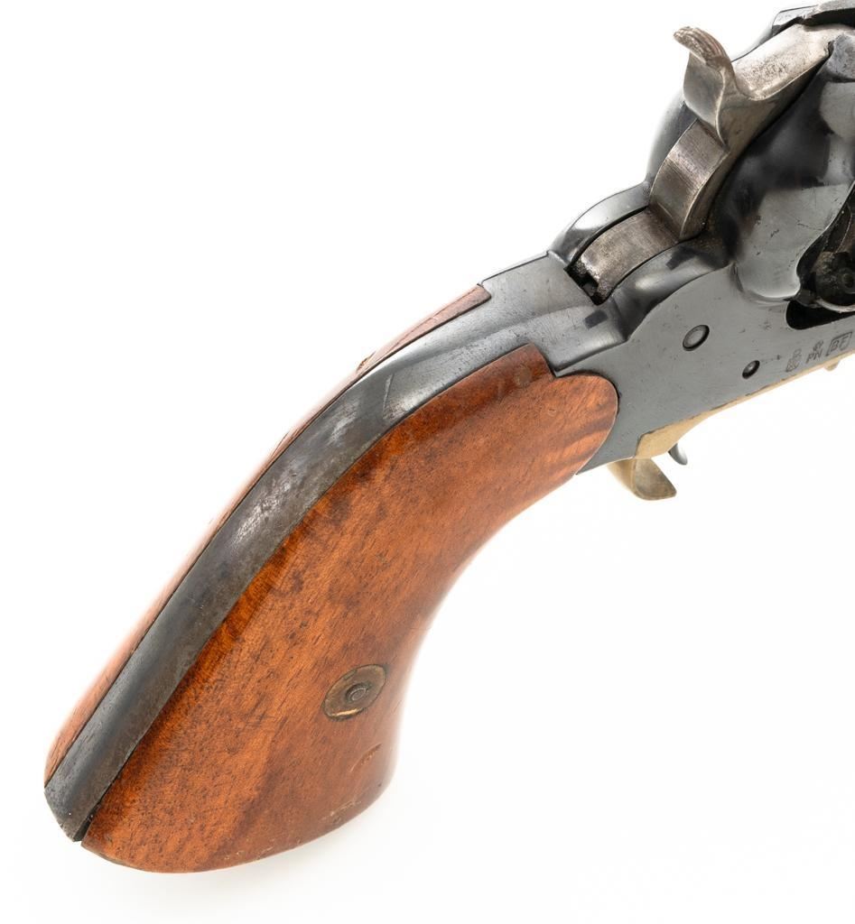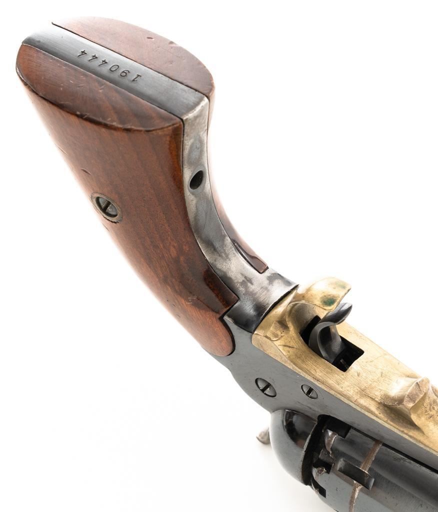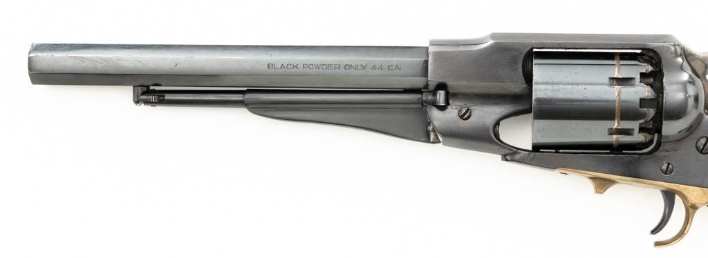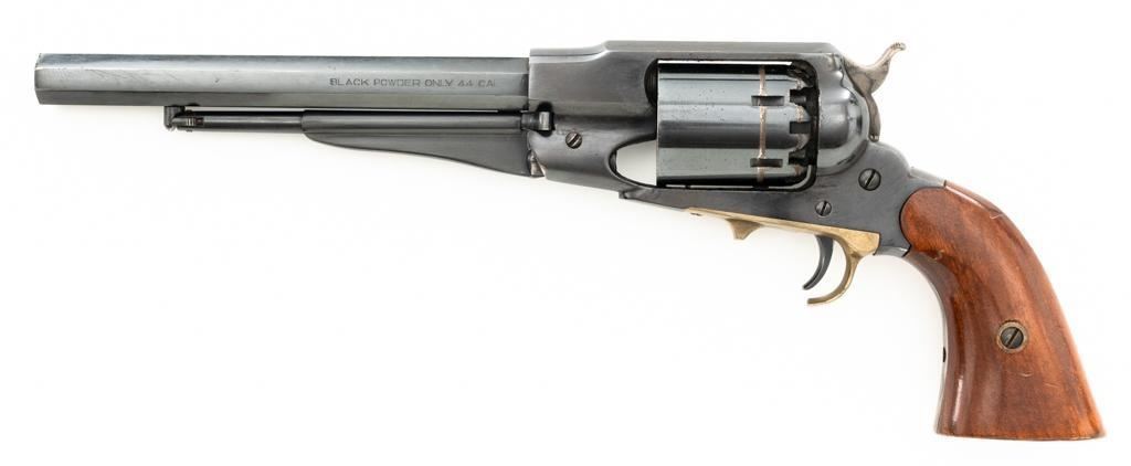Italian Pietta Remington Model 1858 Percussion Revolver, #190444, .44 BP cal., 8" octagon barrel, blue finish, smooth hardwood two-piece grips, front sight removed, with a fixed square-notch rear sight, brass trigger guard cut "Fitz" style, color case hardened hammer, with iron straps. Marked "MADE IN ITALY" on the right side of the barrel. Includes a black leather open-top right hand belt holster in near excellent condition. Holster is stamped "EL PASO SADDLERY CO. / MAKERS / EL PASO, TEX." across the front. Revolver is in very good overall condition, retaining approx. 85%-90% thinning factory finish, with wear at the muzzle, scratches and edgewear. Unfluted cylinder shows leading edgewear, scratches, and a pronounced index line. Nipples show wear, with one damaged and in need of replacement. Grips are in fine condition with scattered light indentations and scratches. Action function well. Bore is good, with surface rust at the muzzle, rifling is well-defined. Est.: $200-$300. (No FFL Required) (Michael Strietbeck Collection)