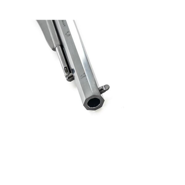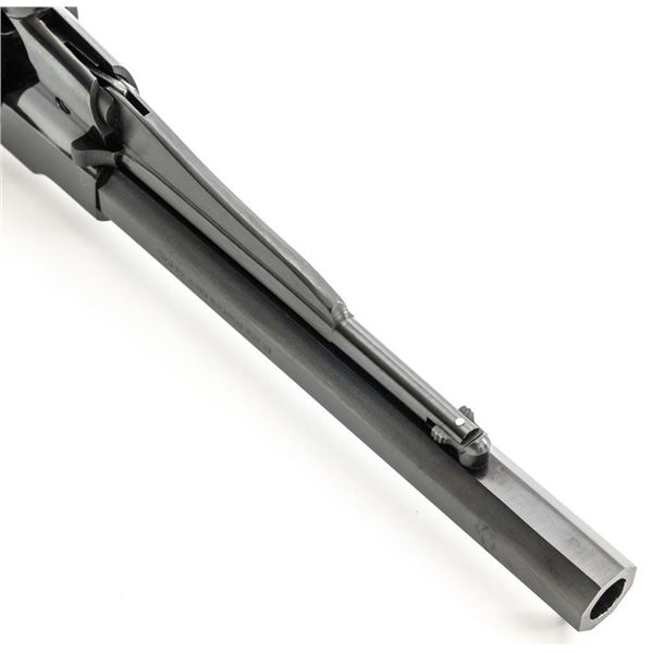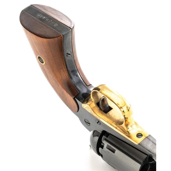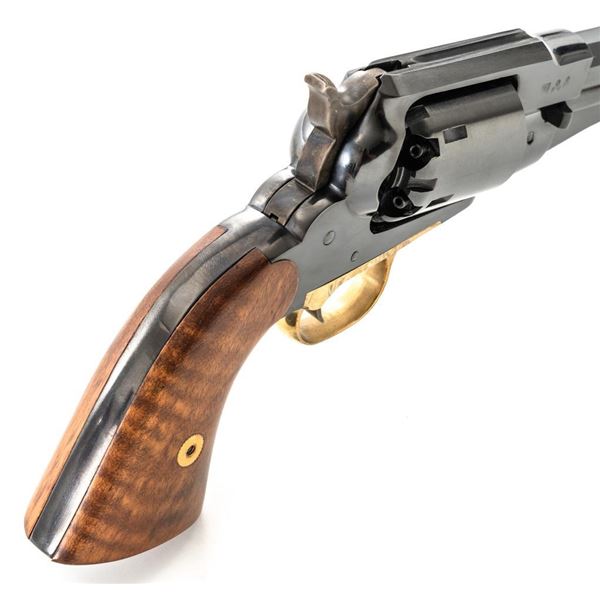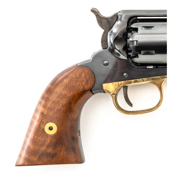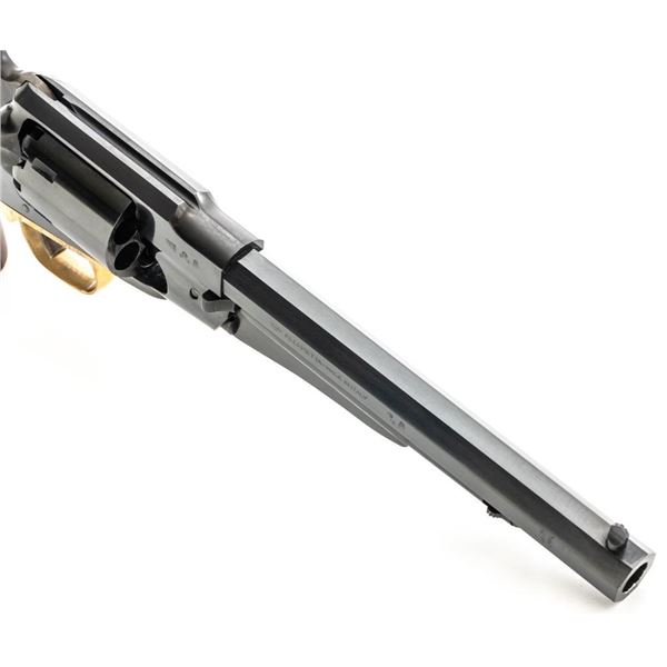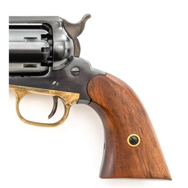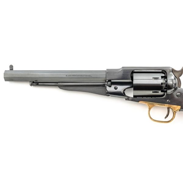 Italian Pietta Remington Model 1858 Black Powder Percussion Revolver, #R335369, .44 cal., unfluted 6-shot cylinder, 8" octagon barrel, blue finish, brass trigger guard, color case hardened hammer and trigger, smooth hardwood two-piece grips, flattened pin front sight, and fixed square-notch rear sight. Marked "MADE IN ITALY" on right side of the barrel. Revolver is in excellent overall condition, retaining approx. 98%-99% factory finish showing little use. Factory markings are clear. Grips are in excellent condition with attractive figure and an excellent fit. Action is crisp. Bore is mirror bright with excellent rifling. Est.: $200-$400. (No FFL Required). (Consecutive to the previous lot.)