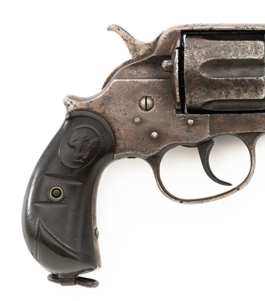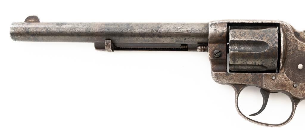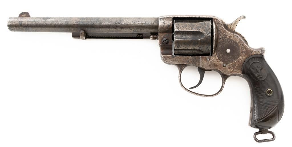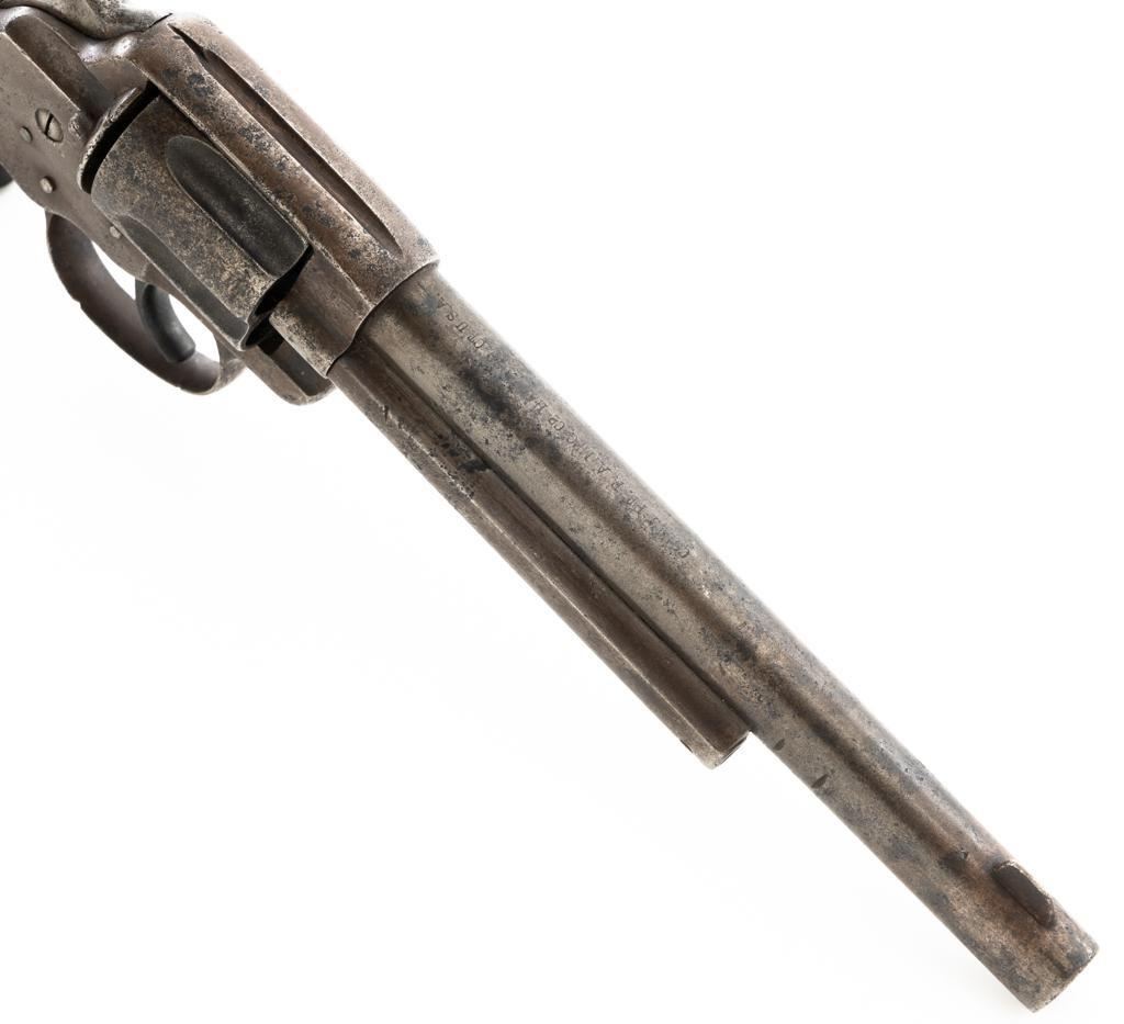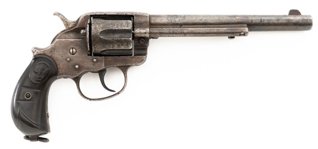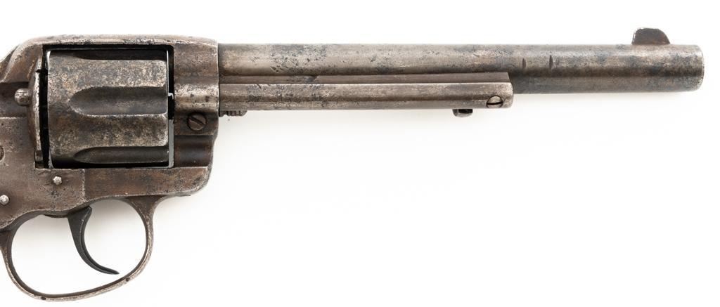 Colt Model 1878 Frontier Six Shooter Double Action Revolver, #42957, .44-40 cal., 7.5" barrel, blue finish, checkered hard rubber two-piece Colt grips, lanyard ring, blade front sight, and fixed "V"-notch rear sight. Factory markings are partially legible, with roll stamped "COLT FRONTIER SIX SHOOTER" on the left side of the barrel. Mfgd 1899. Revolver is in good overall condition, with the metal surfaces worn to a mottled gray color, with moderate to heavy surface erosion, scattered spots of pin prick pitting, and a couple of hash marks cut in to the right side of the barrel. Cylinder shows heavy wear with light pitting and erosion. Grips with smoothing to the checkering detail. Right panel has a few horizontal hash marks carved into it. Action is loose and does not function, holding at full-cock and will require service. Bore is poor, with moderate to heavy erosion, rifling is visible. Est.: $800-$1,200. (C&R)