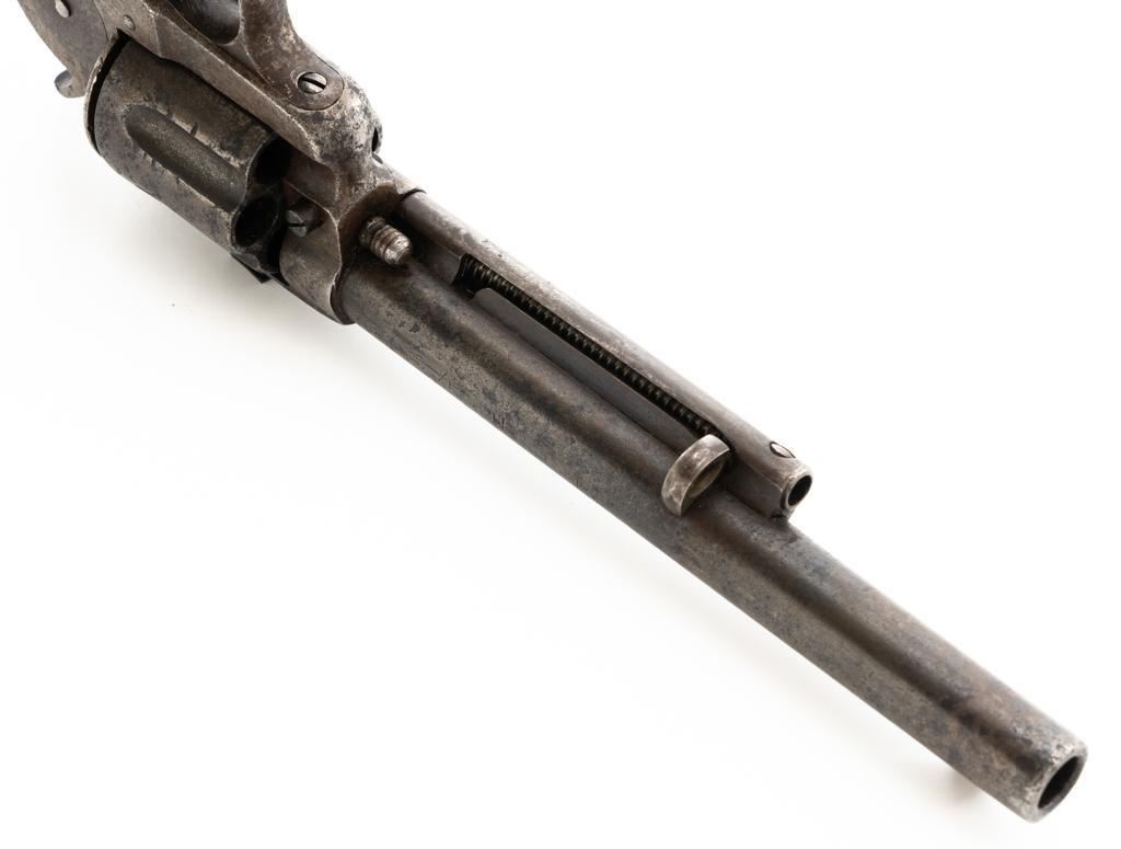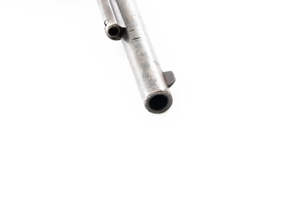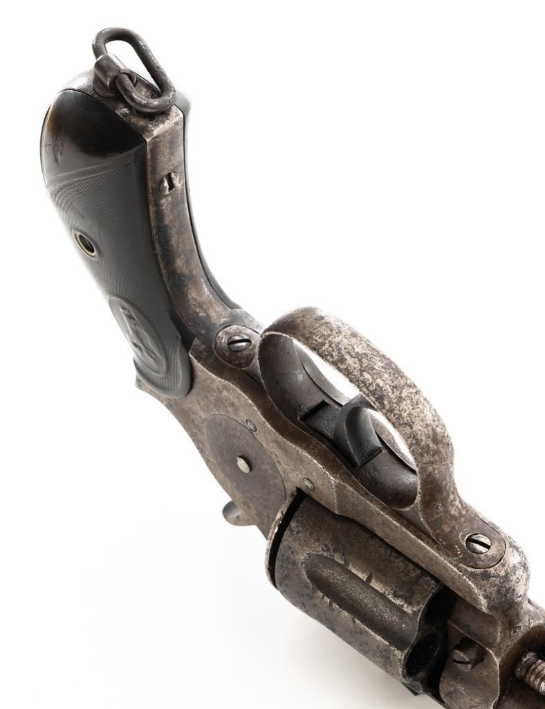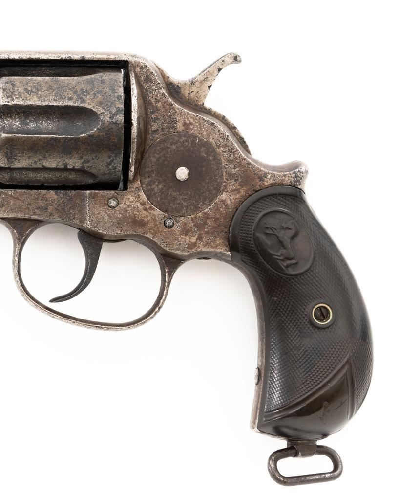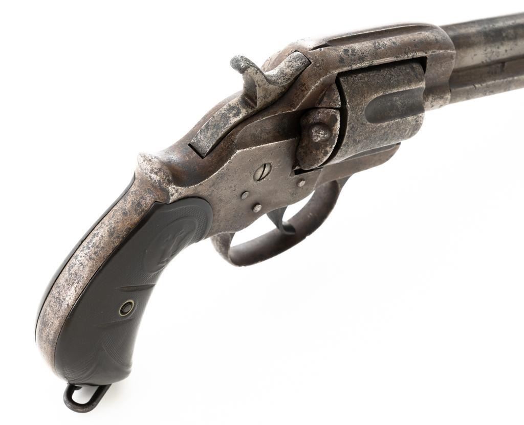 Colt Model 1878 Frontier Six Shooter Double Action Revolver, #42957, .44-40 cal., 7.5" barrel, blue finish, checkered hard rubber two-piece Colt grips, lanyard ring, blade front sight, and fixed "V"-notch rear sight. Factory markings are partially legible, with roll stamped "COLT FRONTIER SIX SHOOTER" on the left side of the barrel. Mfgd 1899. Revolver is in good overall condition, with the metal surfaces worn to a mottled gray color, with moderate to heavy surface erosion, scattered spots of pin prick pitting, and a couple of hash marks cut in to the right side of the barrel. Cylinder shows heavy wear with light pitting and erosion. Grips with smoothing to the checkering detail. Right panel has a few horizontal hash marks carved into it. Action is loose and does not function, holding at full-cock and will require service. Bore is poor, with moderate to heavy erosion, rifling is visible. Est.: $800-$1,200. (C&R)
