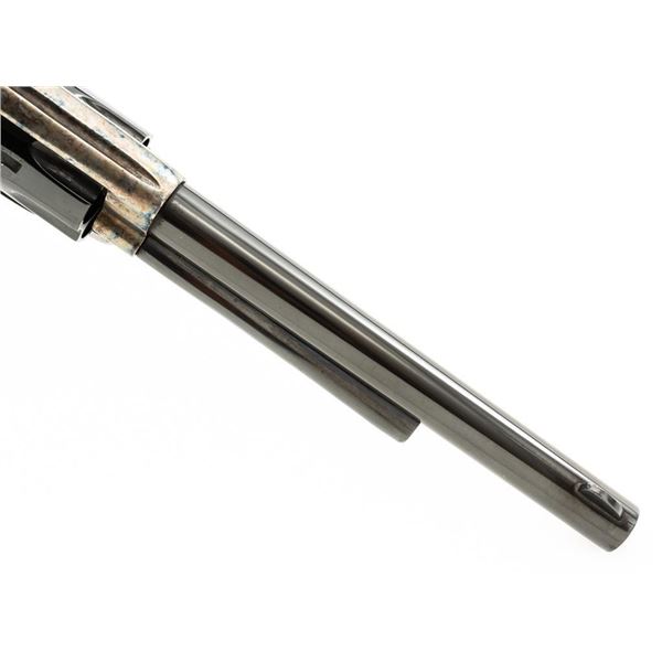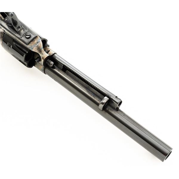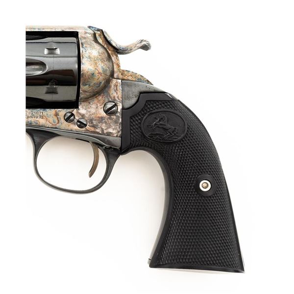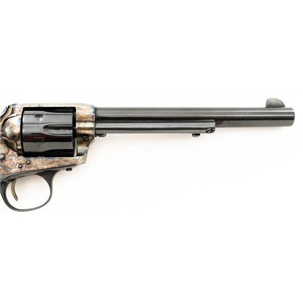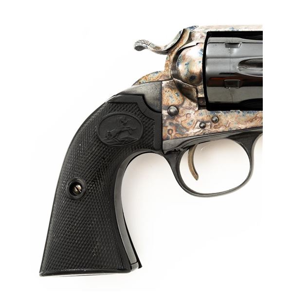 Colt Bisley Single Action Revolver, #196909, .45 Colt cal., 7.5" barrel, blue and color case hardened finish, checkered hard rubber two-piece grips with Colt monogram, blade front sight, and fixed "V"-notch rear sight. Inside of the loading gate is marked "1521". Frame shows clear factory markings but the barrel address and Bisley markings have been removed. Left side of the barrel is marked ".45 COLT". Mfgd 1899. Revolver is in near excellent condition as refinished, retaining approx. 97%-98% of an old reblued finish, with light scratches and handling marks along the barrel. Backstrap shows scratches and the serial number at the butt is faint, having been over polished. Case colors on the frame are vivid. Grips are near excellent with the interior of the right panel marked "VICTOR PABST / TACOMA, WA" and "BORNE / AUG. 5, 1891". It is unfortunate that the grips fit poorly. Action will require service as it only functions intermittently and will not hold at full-cock. Bore is good, with some areas of light erosion and well-defined rifling. Est.: $900-$1,200. (C&R)