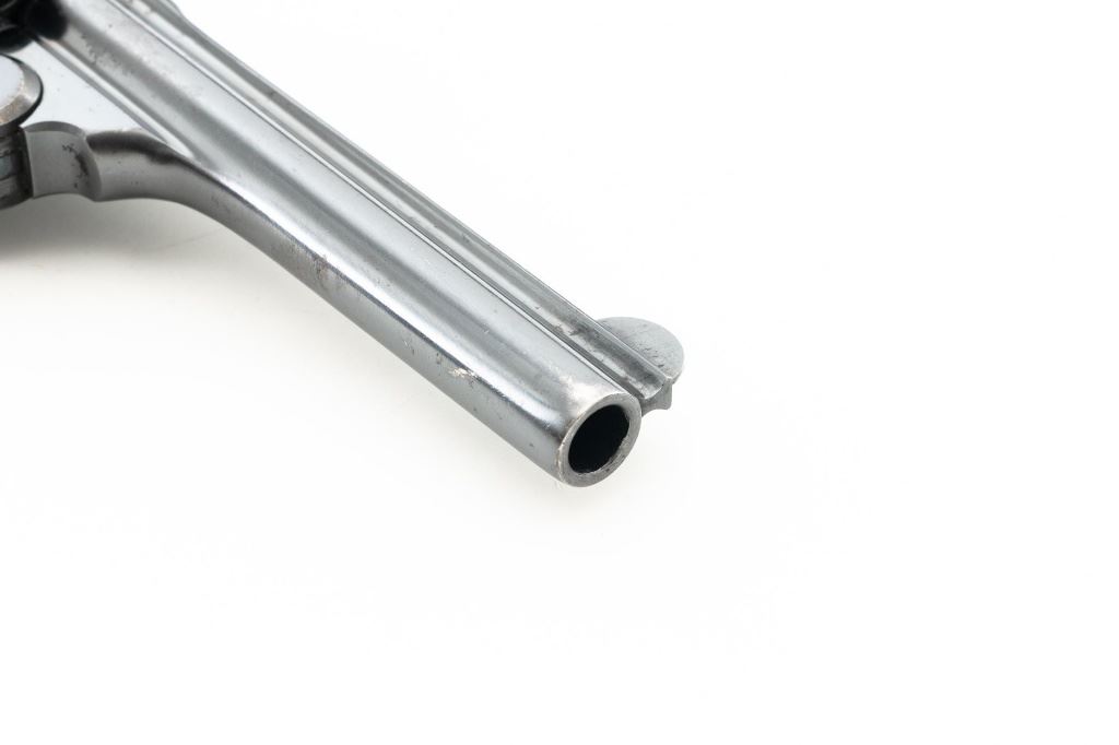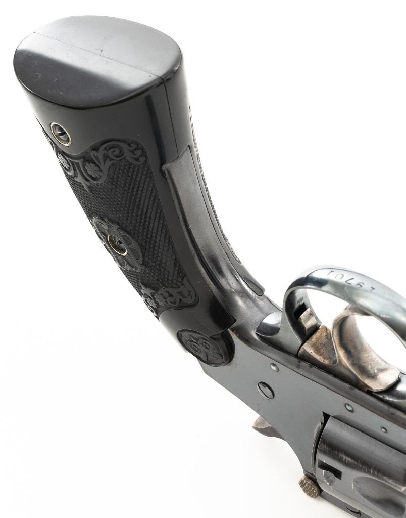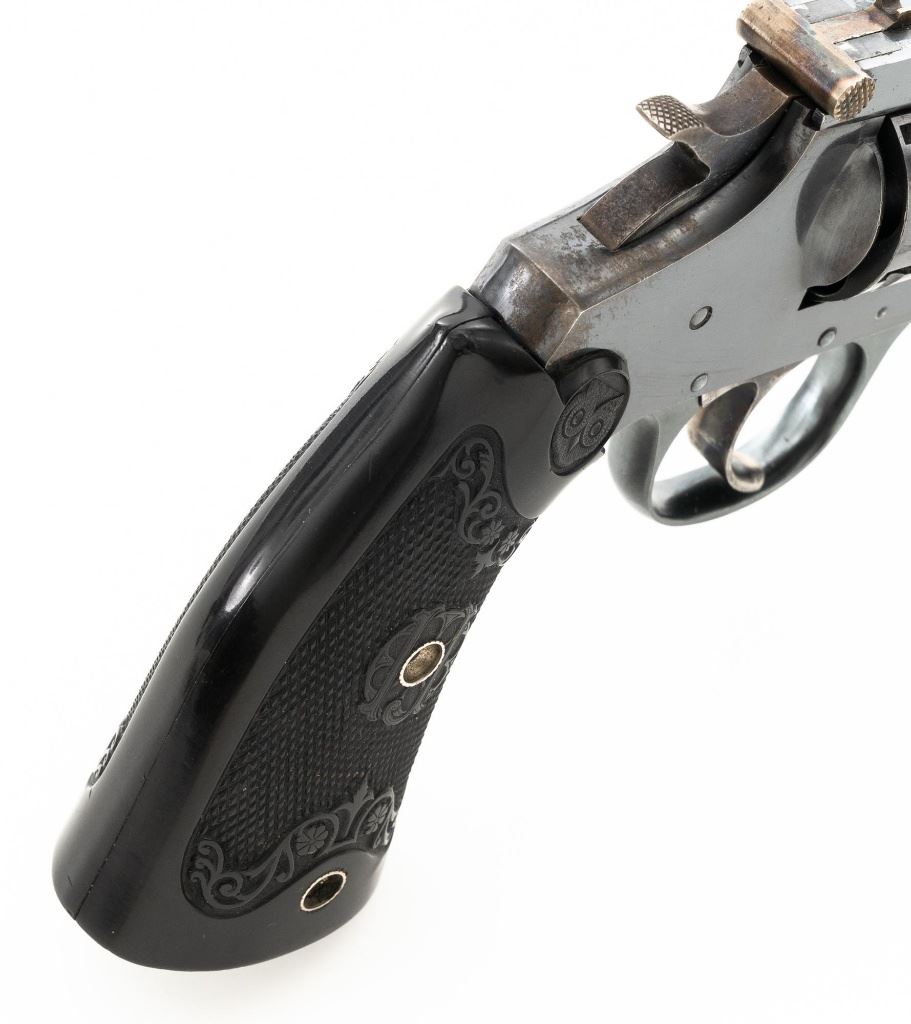 Iver Johnson 3rd Model Safety Automatic 5-Shot Top Break Revolver, #19701, .32 CF cal., 4" ribbed barrel, blue finish, checkered hard rubber two-piece Iver Johnson grips, half-round blade front sight, fixed "U"-notch rear sight, with color case hardened hammer and trigger. Mfgd circa 1909-1941. Revolver is in very good overall condition, retaining approx. 93%-94% thinning factory finish, with wear at the muzzle, on the frame, and light scattered surface rust along the barrel. Grips are near excellent with fine checkering detail and scattered small handling marks. Action functions well. Bore is very good with well-defined rifling. Est.: $150-$200. (C&R/PPT)
