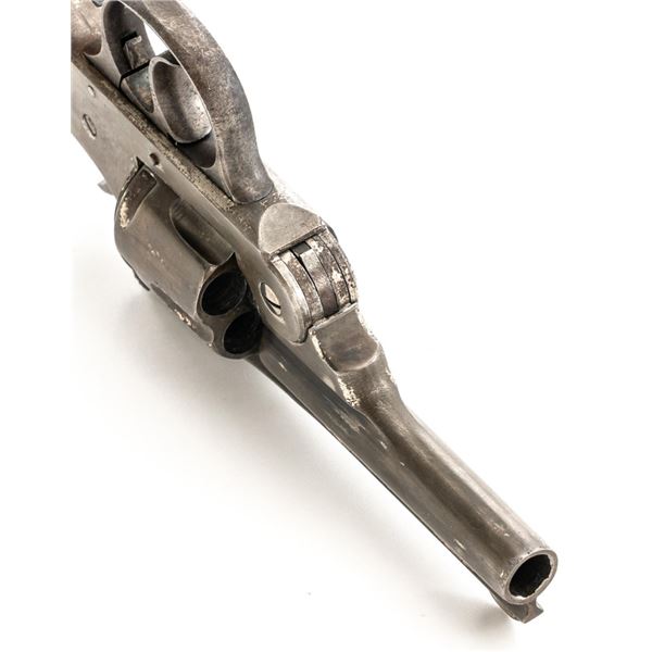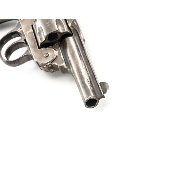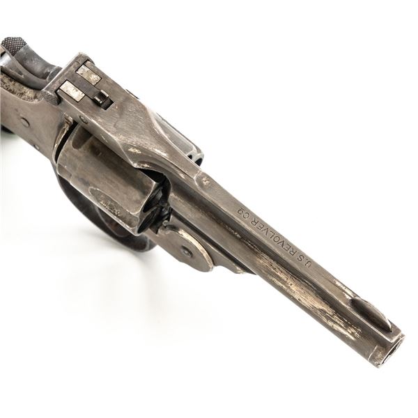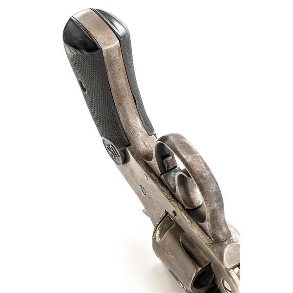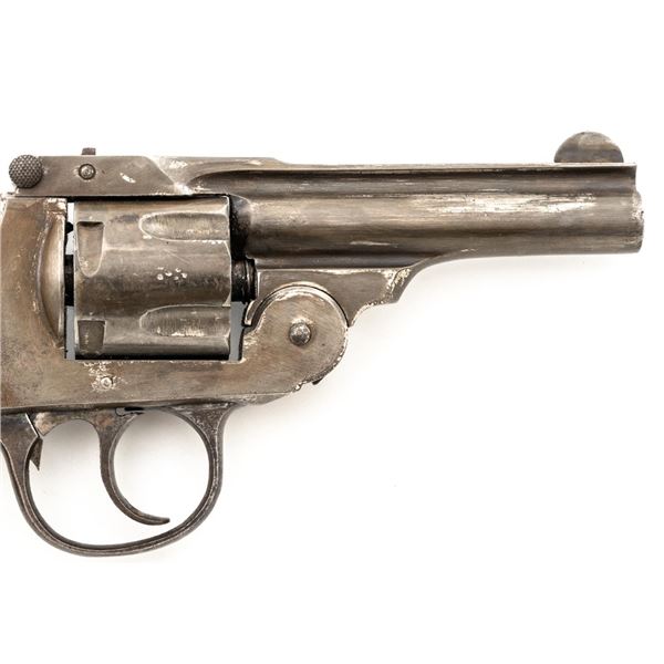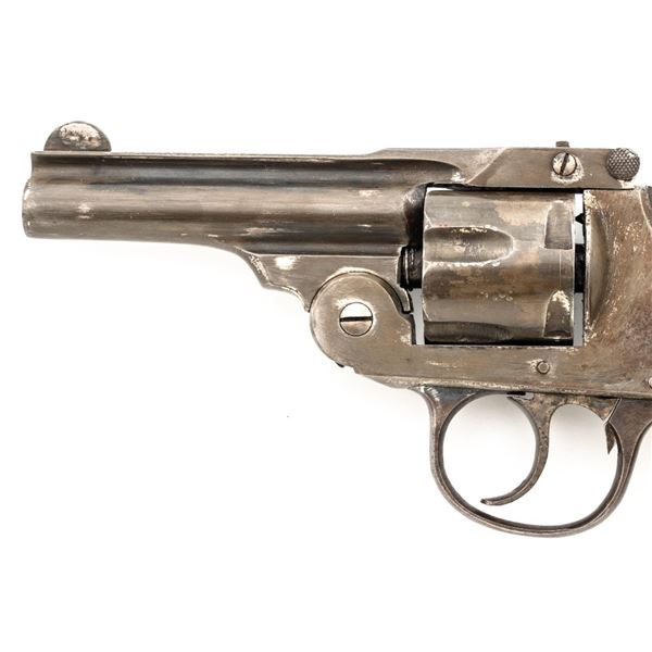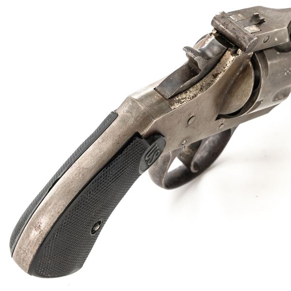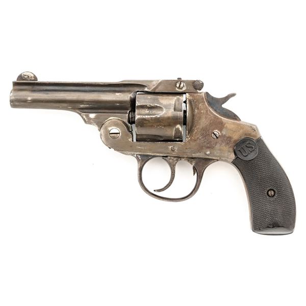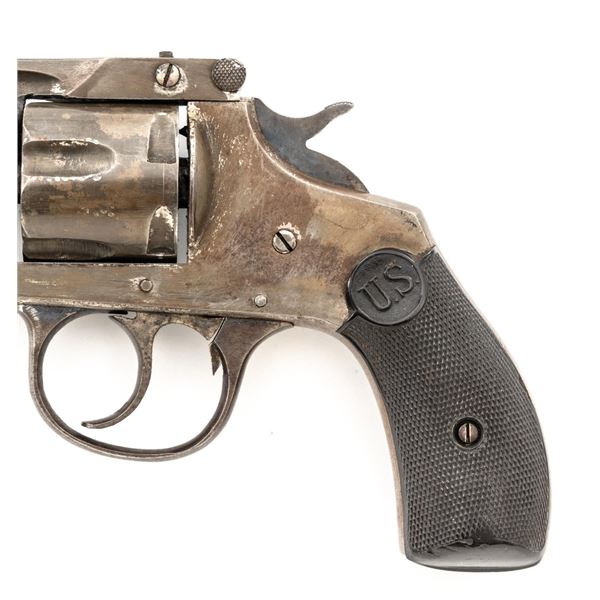 Iver Johnson U.S. Revolver Co. Double Action Top Break Revolver, #T33469, .38 S&W cal., 3.25" ribbed barrel, nickel finish, checkered hard rubber two-piece U.S. monogram grips, half-round blade and fixed "U"-notch rear sights, color case hardened hammer and trigger, and 5-shot fluted cylinder. Mfgd circa 1911-1935. Revolver is in very good overall condition, metal surfaces having worn to gray with traces of original nickel finish. Cylinder shows leading edgewear and roughness around the flutes. Hammer and trigger show muted color case hardened finish. Grips are in near fine condition, with flea bite nicks at the base of the left panel. Action functions well and locks up securely. Bore is very good with light erosion and defined rifling. Est.: $100-$200. (C&R/PPT)