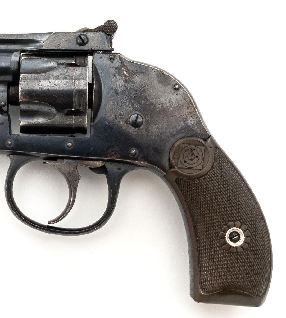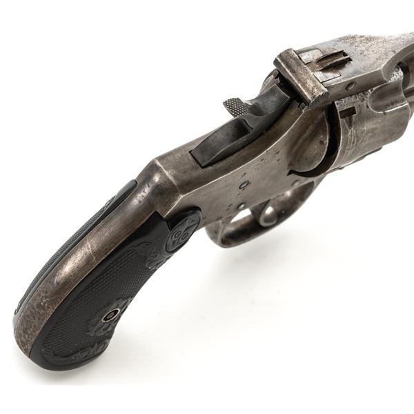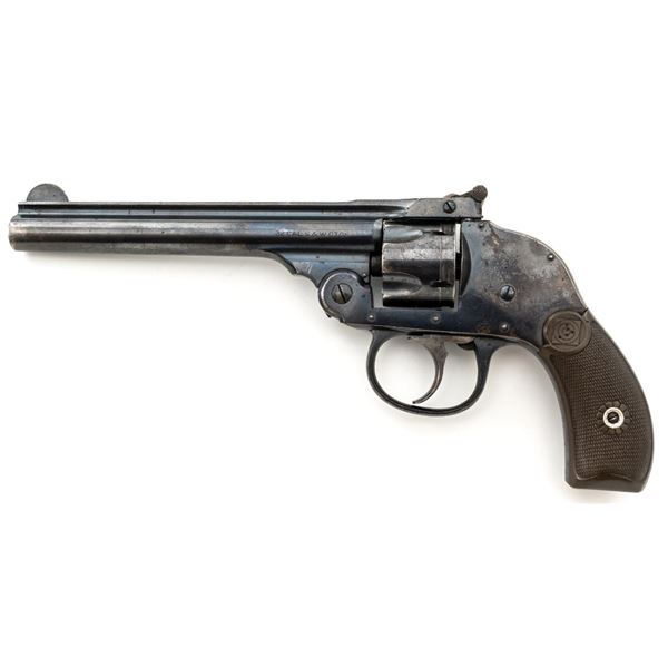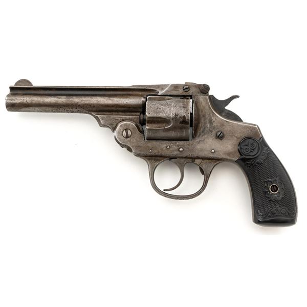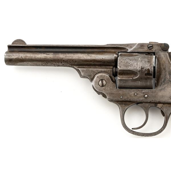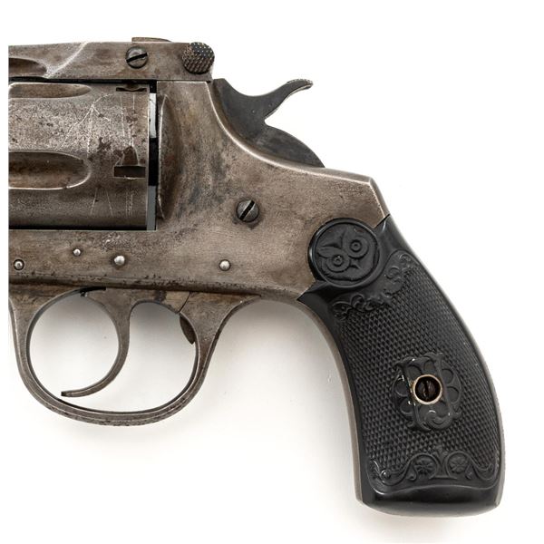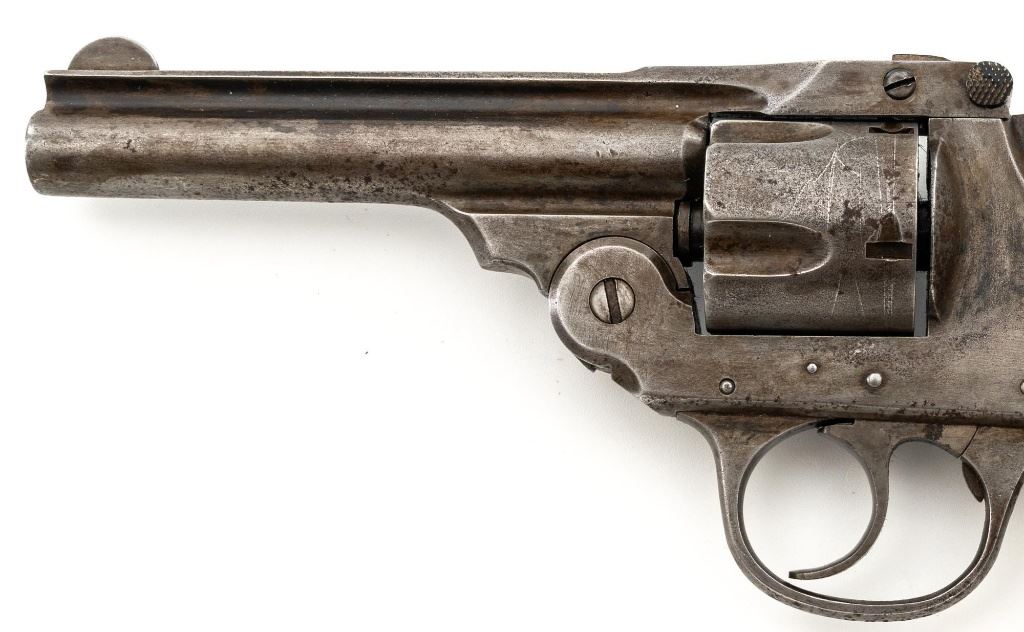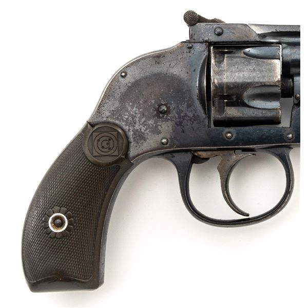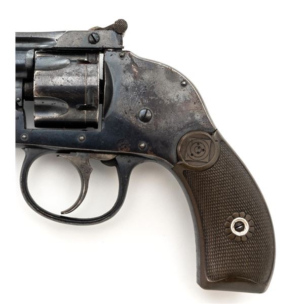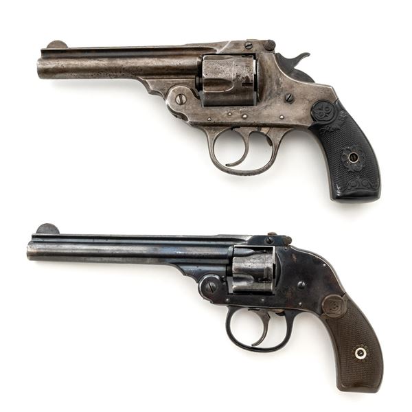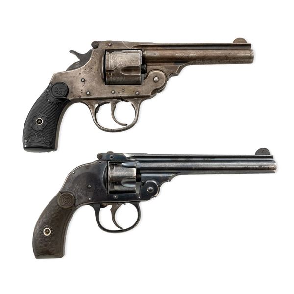 Lot of Two (2) Top-Break Double Action Revolvers by Iver Johnson & H&R: 1.) Iver Johnson 3rd Model Safety Automatic Revolver, #25186, .38 S&W cal., 4" barrel, nickel finish, checkered hard rubber two-piece grips, blade front sight and fixed "U"-notch rear sight. Revolver is in good overall condition, showing considerable thinning finish drifting to gray patina, with scattered spots of erosion and lighter pin prick pitting on the frame. Grips with fine checkering detail. Action functions and locks up securely. Bore is fair with moderate erosion and scattered lighter spots of pitting, showing defined rifling. 2.) Harrington & Richardson Hammerless Top-Break Double Action Revolver, #92503, .32 S&W cal., 5" ribbed barrel, blue finish, checkered hard rubber two-piece grips, blade front sight, fixed "U"-notch rear sight, and color case hardened trigger. Revolver is in near fine overall condition, retaining approx. 90%-92% thinning factory finish, with wear at the muzzle, erosion, and thinning finish. Front and backstrap have spots of light surface rust and edgewear. Grips are fine with good checkering detail and small handling marks. Action functions well. Bore is fair, with spots of light erosion, displaying defined rifling. Est.: $200-$400/lot. (C&R)