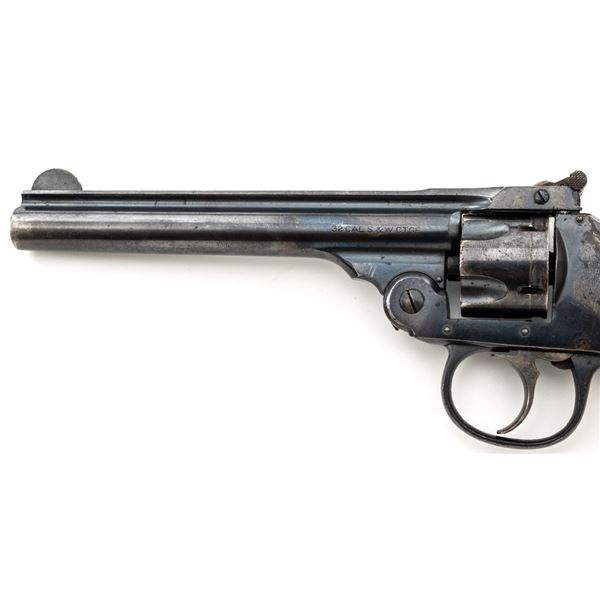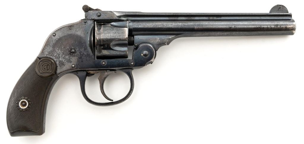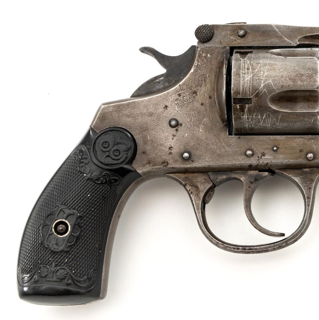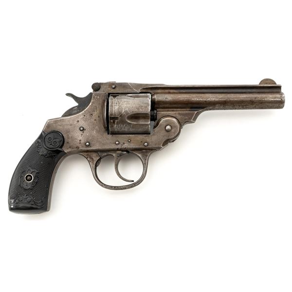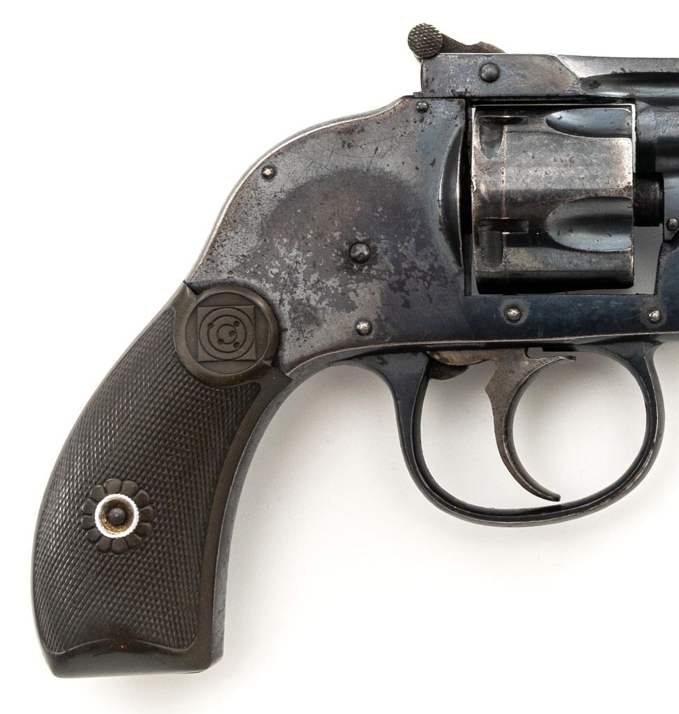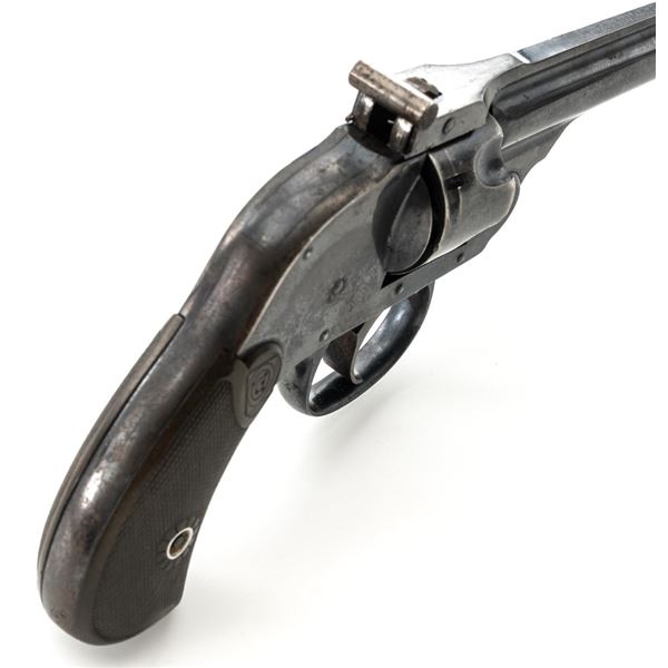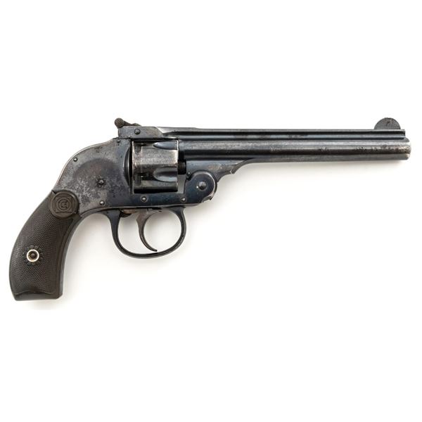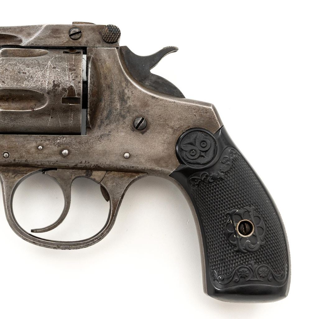 Lot of Two (2) Top-Break Double Action Revolvers by Iver Johnson & H&R: 1.) Iver Johnson 3rd Model Safety Automatic Revolver, #25186, .38 S&W cal., 4" barrel, nickel finish, checkered hard rubber two-piece grips, blade front sight and fixed "U"-notch rear sight. Revolver is in good overall condition, showing considerable thinning finish drifting to gray patina, with scattered spots of erosion and lighter pin prick pitting on the frame. Grips with fine checkering detail. Action functions and locks up securely. Bore is fair with moderate erosion and scattered lighter spots of pitting, showing defined rifling. 2.) Harrington & Richardson Hammerless Top-Break Double Action Revolver, #92503, .32 S&W cal., 5" ribbed barrel, blue finish, checkered hard rubber two-piece grips, blade front sight, fixed "U"-notch rear sight, and color case hardened trigger. Revolver is in near fine overall condition, retaining approx. 90%-92% thinning factory finish, with wear at the muzzle, erosion, and thinning finish. Front and backstrap have spots of light surface rust and edgewear. Grips are fine with good checkering detail and small handling marks. Action functions well. Bore is fair, with spots of light erosion, displaying defined rifling. Est.: $200-$400/lot. (C&R)