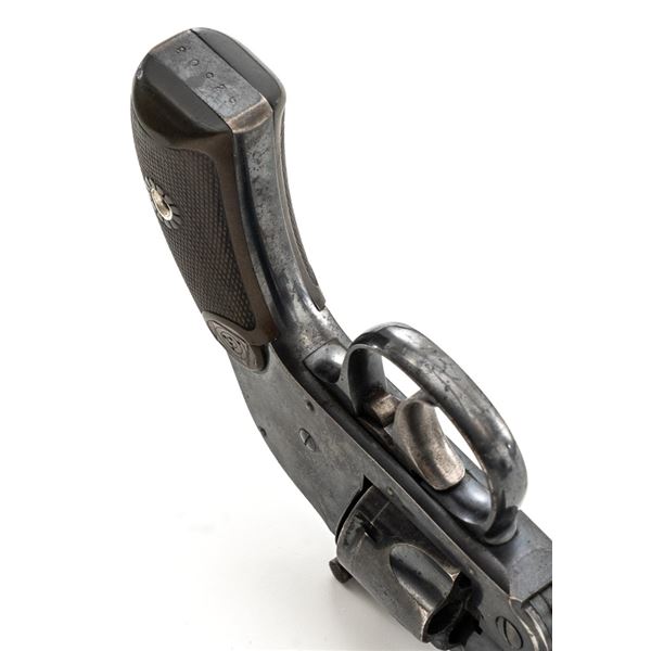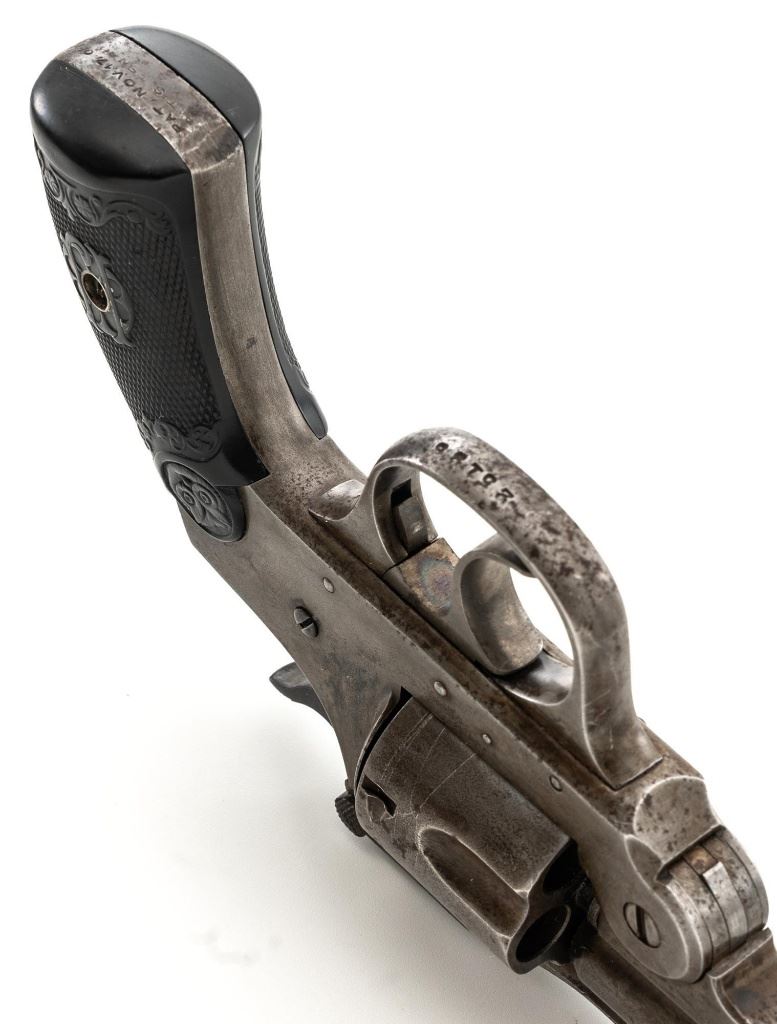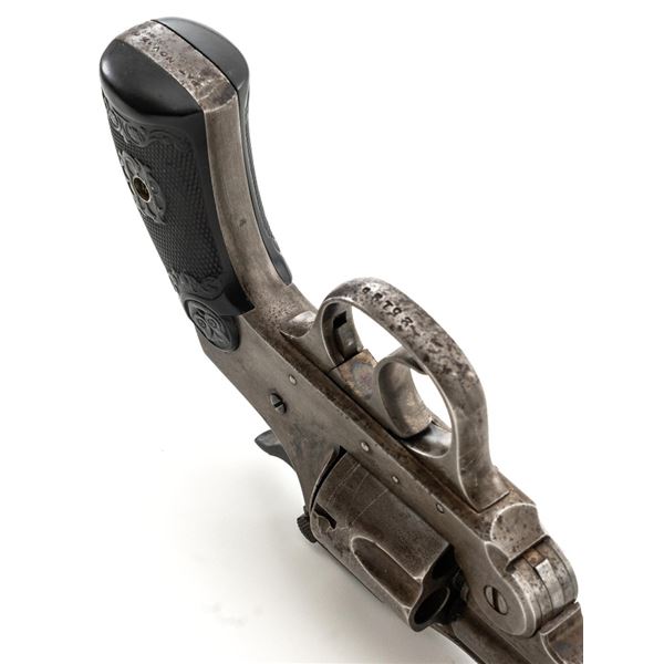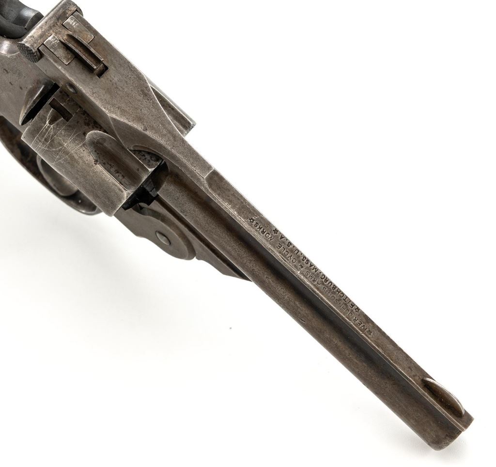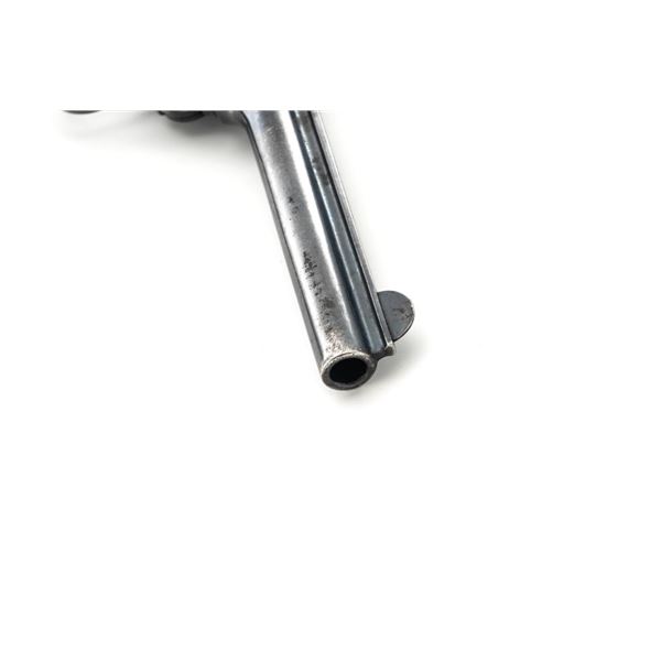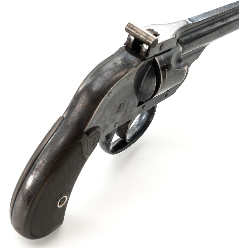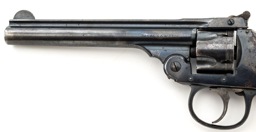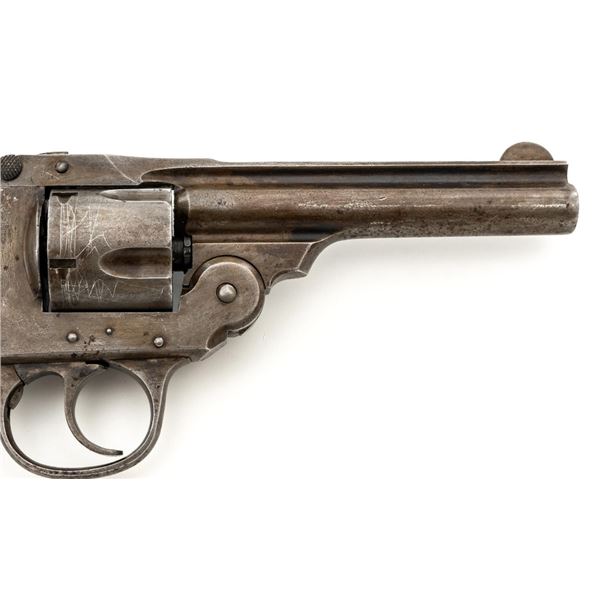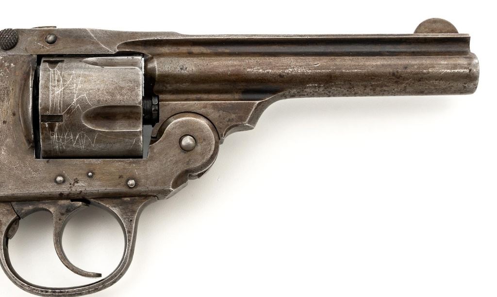 Lot of Two (2) Top-Break Double Action Revolvers by Iver Johnson & H&R: 1.) Iver Johnson 3rd Model Safety Automatic Revolver, #25186, .38 S&W cal., 4" barrel, nickel finish, checkered hard rubber two-piece grips, blade front sight and fixed "U"-notch rear sight. Revolver is in good overall condition, showing considerable thinning finish drifting to gray patina, with scattered spots of erosion and lighter pin prick pitting on the frame. Grips with fine checkering detail. Action functions and locks up securely. Bore is fair with moderate erosion and scattered lighter spots of pitting, showing defined rifling. 2.) Harrington & Richardson Hammerless Top-Break Double Action Revolver, #92503, .32 S&W cal., 5" ribbed barrel, blue finish, checkered hard rubber two-piece grips, blade front sight, fixed "U"-notch rear sight, and color case hardened trigger. Revolver is in near fine overall condition, retaining approx. 90%-92% thinning factory finish, with wear at the muzzle, erosion, and thinning finish. Front and backstrap have spots of light surface rust and edgewear. Grips are fine with good checkering detail and small handling marks. Action functions well. Bore is fair, with spots of light erosion, displaying defined rifling. Est.: $200-$400/lot. (C&R)