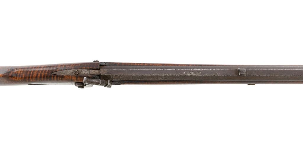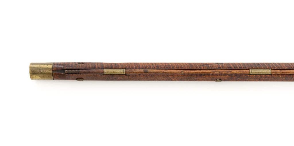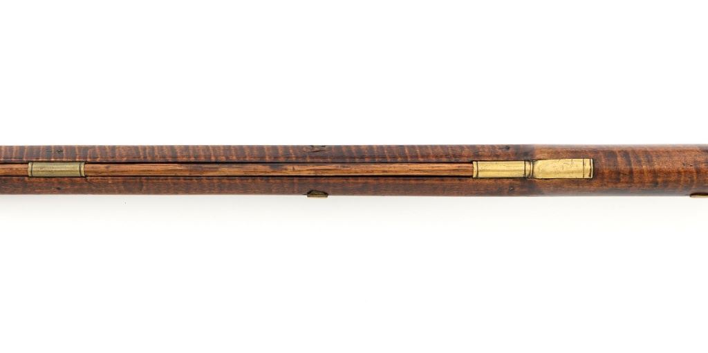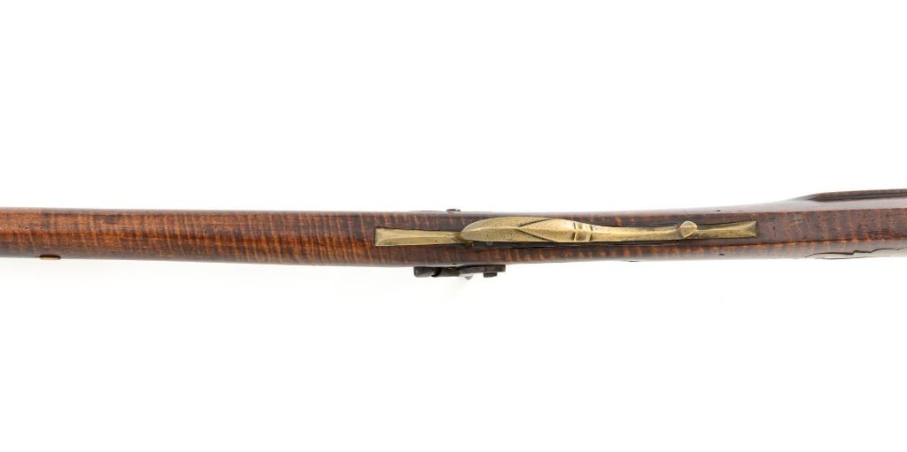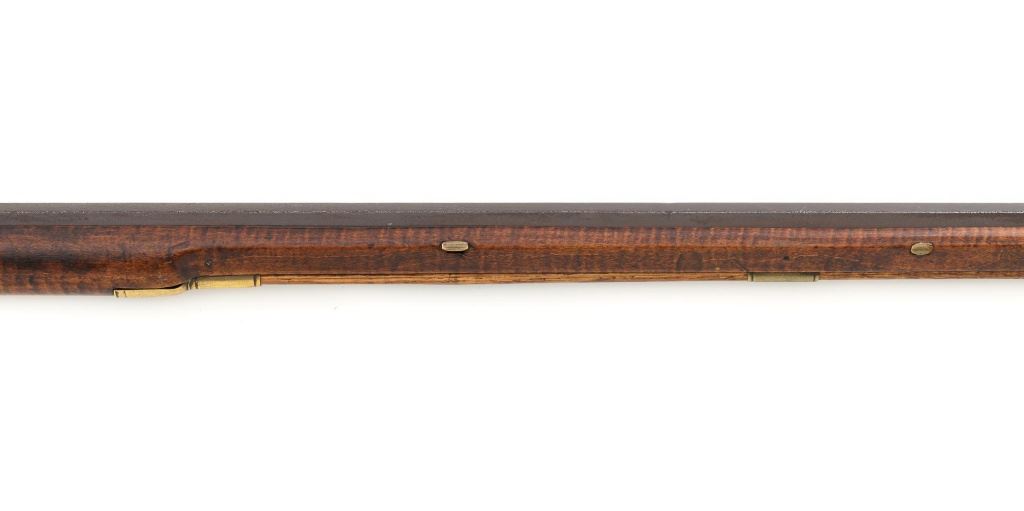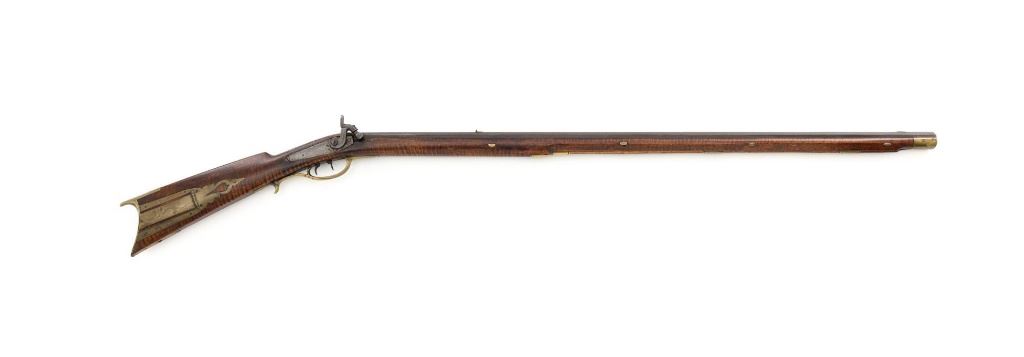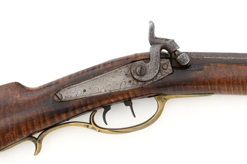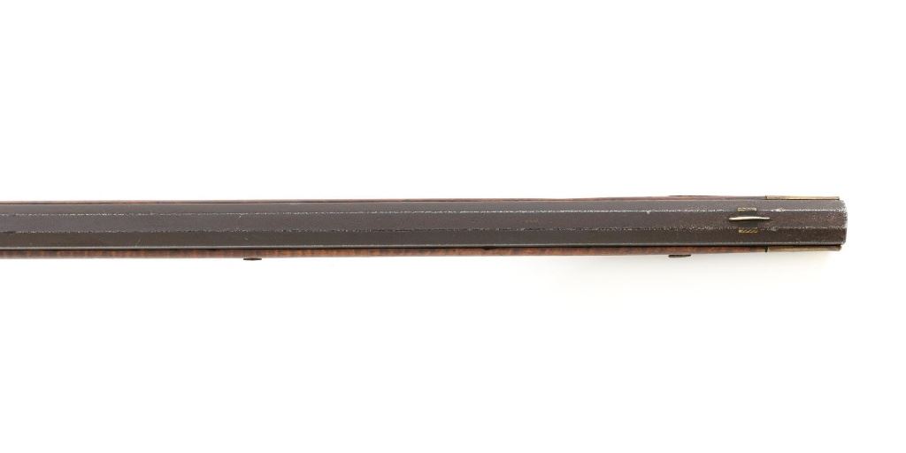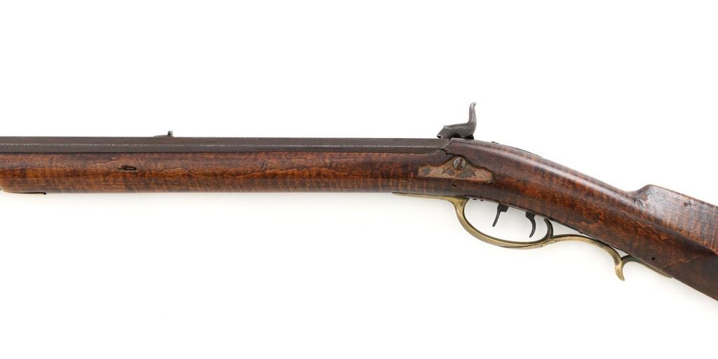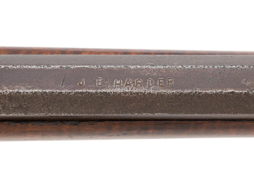 J.E. Harder Marked Full-Stock Pennsylvania Black Powder Percussion Muzzle Loading Rifle, #NVSN, .36 cal., 39" octagon barrel, metal with dark patina, faux tiger striped maple full-length stock with brass hardware, dovetailed German silver blade front sight, fixed "U"-notch rear sights, double set triggers in exaggerated brass trigger guard with finger rest, and full-length wooden ramrod. Barrel is marked "J E HARDER" on the top flat near the breech. Rifle is in very good overall condition, with the metal surfaces having a dark patina, showing intermittent light to moderate pitting along the length of the barrel. Side plate was likely color case hardened with crude "J" shaped scratches and simple light engraving to the hammer. There is corrosion and pitting around the nipple and barrel, due to firing and powder exposure. Stock is near fine with faux tiger striping, fading in areas. Brass hardware displays a pleasing patina, including the lightly engraved patch box with stylized finial. Stock has numerous indentations, scratches, and wood loss around the nipple from firing and exposure. Action and double set triggers function. Bore is dark. Jacob E. Harder was a noted gunsmith in the Clearfield/Lock Haven, PA area beginning in 1846, after a six year apprenticeship with the Bartlett Bros in New York. J.E. Harden & Son were still building rifles into the 1890s. Est.: $700-$900. (Antique)