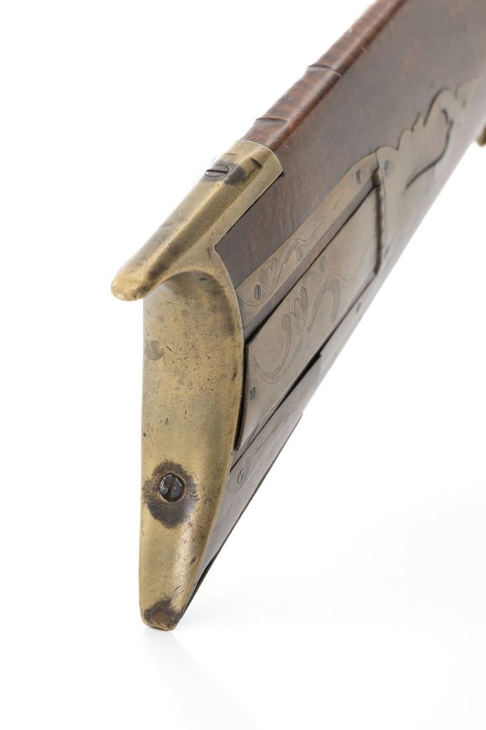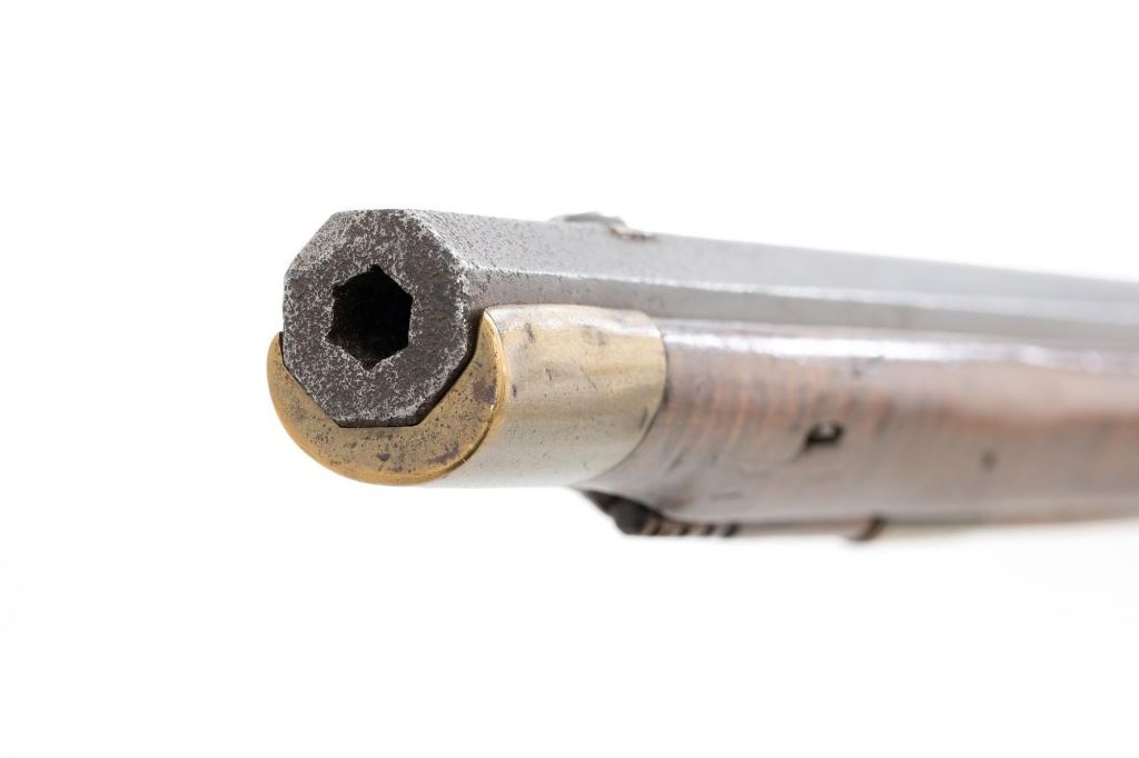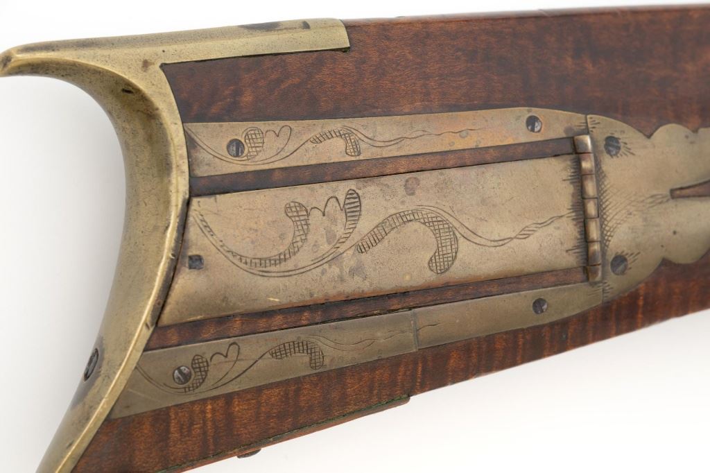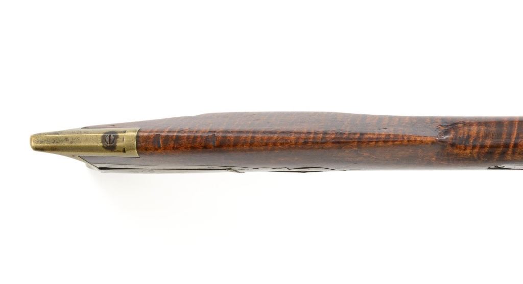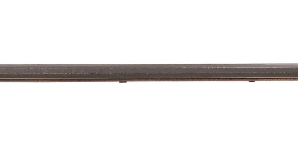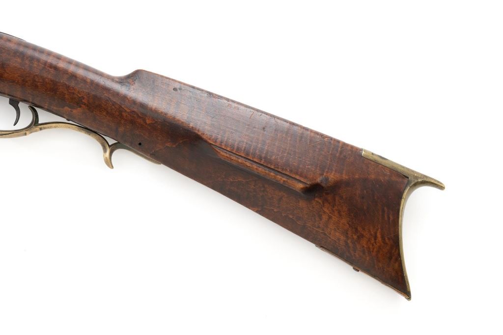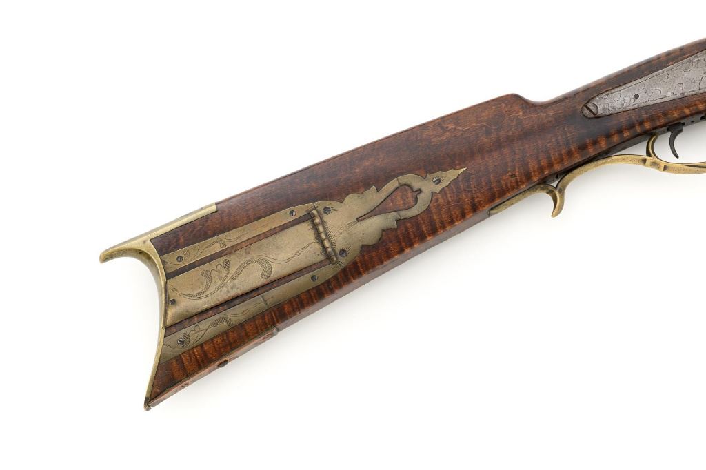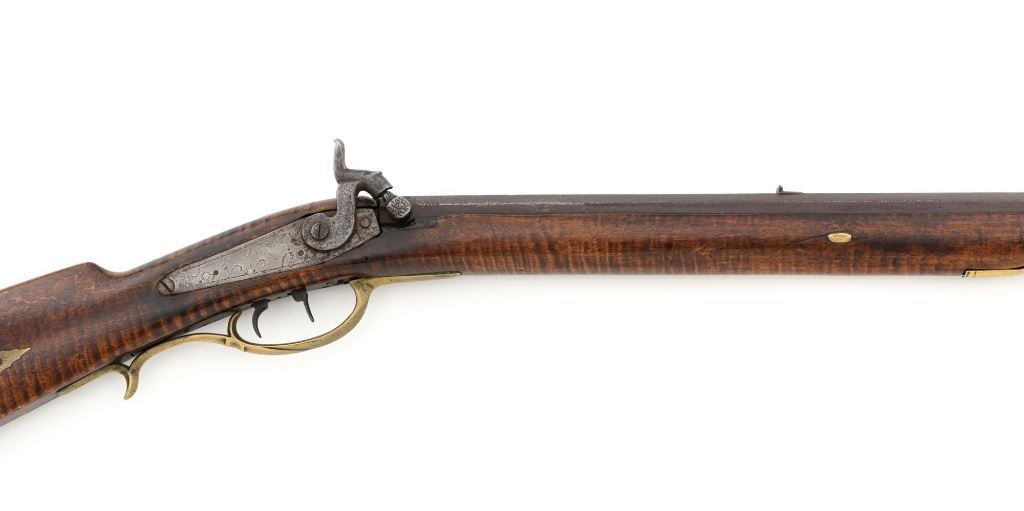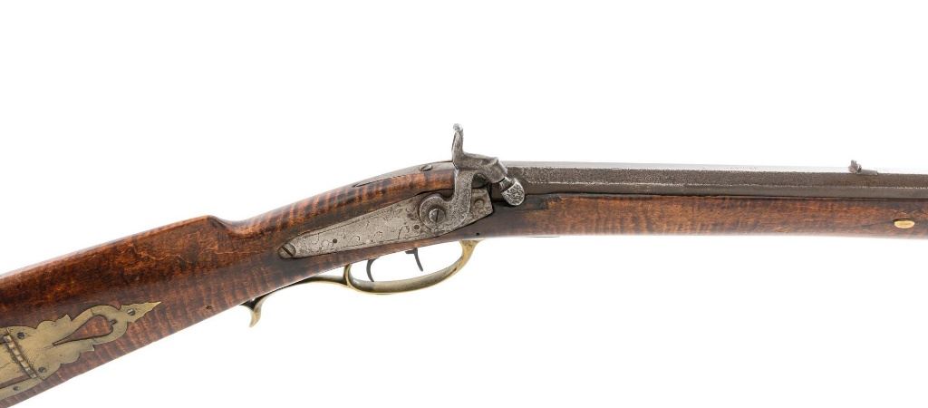 J.E. Harder Marked Full-Stock Pennsylvania Black Powder Percussion Muzzle Loading Rifle, #NVSN, .36 cal., 39" octagon barrel, metal with dark patina, faux tiger striped maple full-length stock with brass hardware, dovetailed German silver blade front sight, fixed "U"-notch rear sights, double set triggers in exaggerated brass trigger guard with finger rest, and full-length wooden ramrod. Barrel is marked "J E HARDER" on the top flat near the breech. Rifle is in very good overall condition, with the metal surfaces having a dark patina, showing intermittent light to moderate pitting along the length of the barrel. Side plate was likely color case hardened with crude "J" shaped scratches and simple light engraving to the hammer. There is corrosion and pitting around the nipple and barrel, due to firing and powder exposure. Stock is near fine with faux tiger striping, fading in areas. Brass hardware displays a pleasing patina, including the lightly engraved patch box with stylized finial. Stock has numerous indentations, scratches, and wood loss around the nipple from firing and exposure. Action and double set triggers function. Bore is dark. Jacob E. Harder was a noted gunsmith in the Clearfield/Lock Haven, PA area beginning in 1846, after a six year apprenticeship with the Bartlett Bros in New York. J.E. Harden & Son were still building rifles into the 1890s. Est.: $700-$900. (Antique)