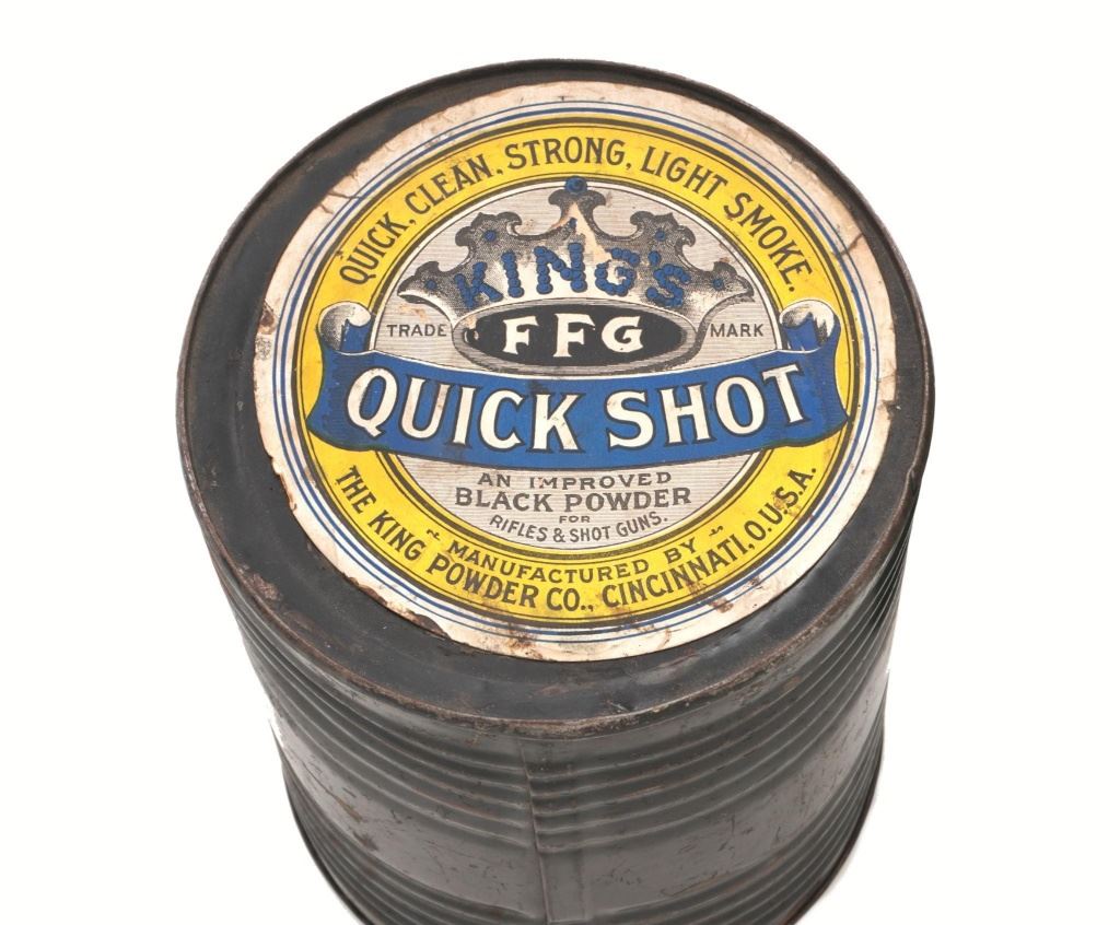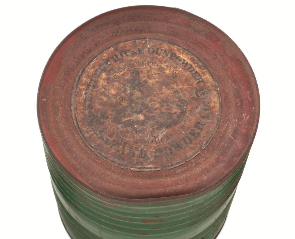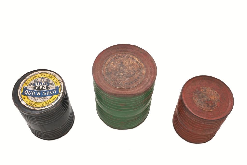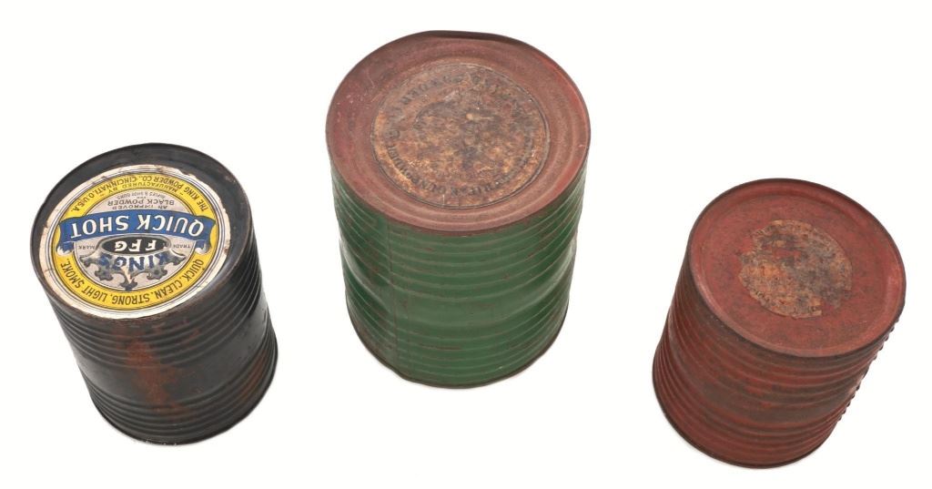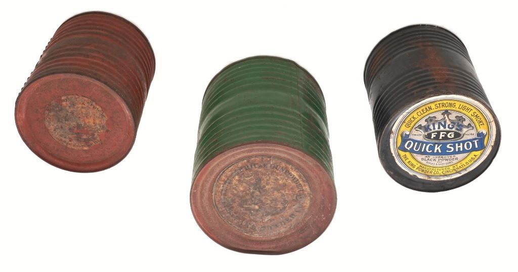 Large of Three (3) Circa Early 1900s Metal Gunpowder Storage Containers: 1.) Green painted ribbed metal measures 9.5" tall, 8" in diameter, and approx. 25" around the center. The 5.5" diameter paper advertising label on top of the lid reads "KENTUCKY RIFLE GUN POWDER CO. Manufactured at Hazards_____ con by the HAZARD POWDER CO.". With 3" partial advertising label on the other end that reads "HAZARDS GUNPOWDER". Overall condition is fair to near good. 2.) Red painted ribbed metal, 7" tall, 6.5" in diameter, and approx. 20" around the center. With one partially visible color advertising label on top of the lid that appears to identify it as a Hazards Gun Powder product. Overall condition is fair. 3.) Black painted ribbed metal, 7.75" tall, 6.5" in diameter, and approx. 20.5" around the center. With one visible fine condition color advertising label on top of the lid proclaiming "QUICK, CLEAN, STRONG, LIGHT SMOKE.- KINGS TRADE MARK FFG QUICK SHOT AN IMPROVED BLACK POWDER FOR RIFLES & SHOTGUNS. MANUFACTURED BY THE KING POWDER COL., CINCINNATI, O. U.S.A.". Overall condition of this container is fine. All appear to be from circa early 1900s and are empty. Est.: $250-$400/lot.