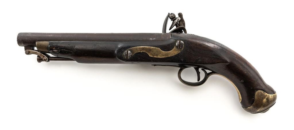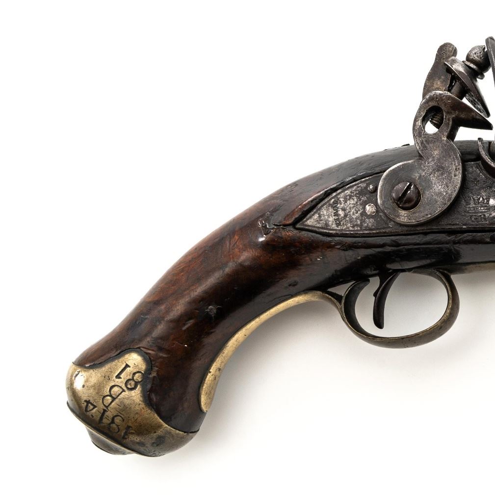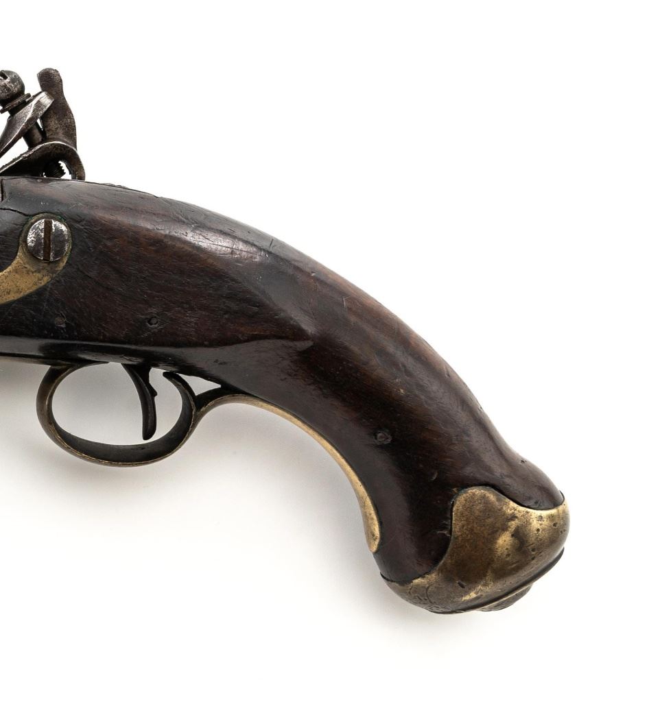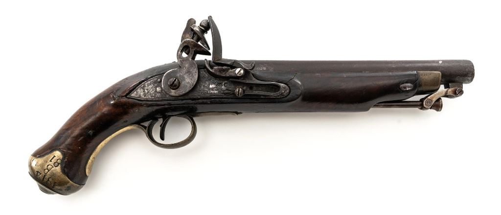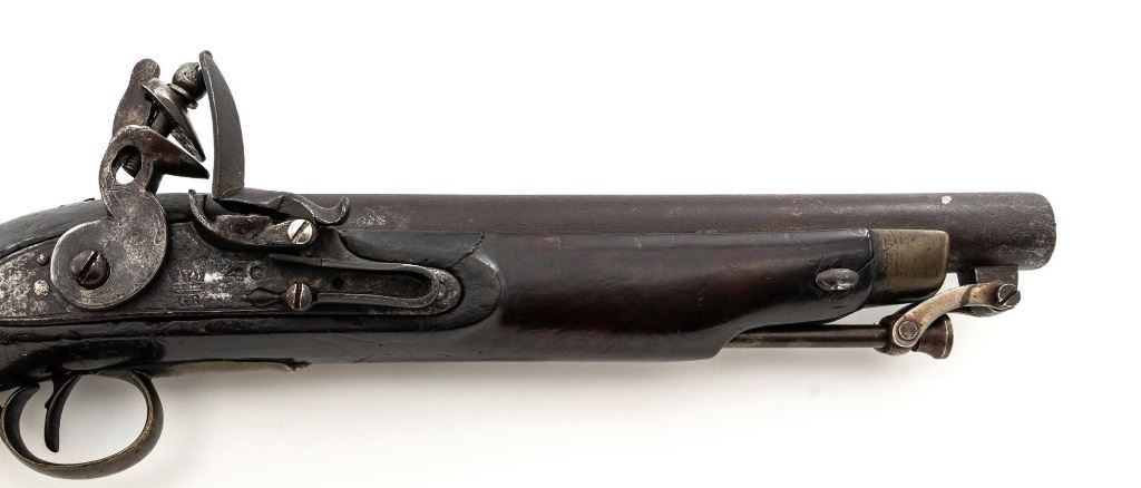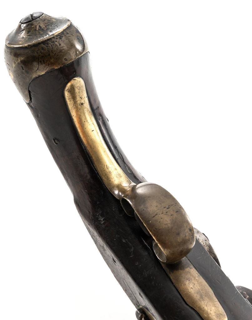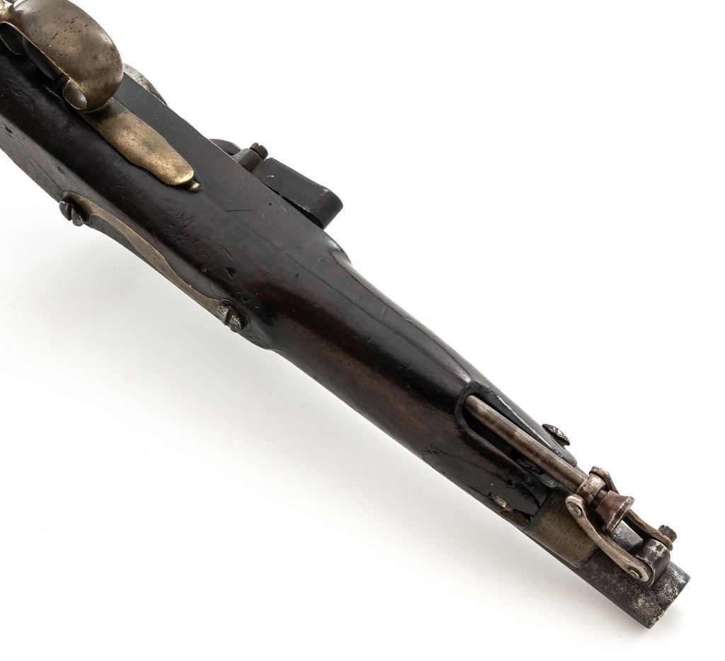 British 1796 Pattern Heavy Dragoon Flintlock Pistol, #2478, .75 cal., smoothbore, 9" round barrel with single flat iron key, bright finish hardwood stock; brass buttcap, trigger guard, and forend cap. No sights. Swiveling iron rammer is in good condition, it operates and locks in place smoothly. Two-line lockplate is marked "TOWER" on the tail and with "(Crown)/GR" and a Lock Viewers mark stamped under the pan. There is two-line engraving to the flat hammer. There are Proof and View marks stamped on left side of the barrel. Right side of the buttcap is stamped "1814/B/81". "(star)2478" is stamped on top of the barrel and partially on the lockplate. Condition overall is fair, barrel has dark brown patina, and the lockplate assembly shows darkening and patina. Wood is fair, with a glue repaired crack behind the lockplate, small cracks and chips to both sides of the forend. Hammer and frizzen spring operate smoothly. Hammer holds on half and full cock. Bore rates fair to good with surface rust but may clean better. Est.: $700-$900. (Antique)