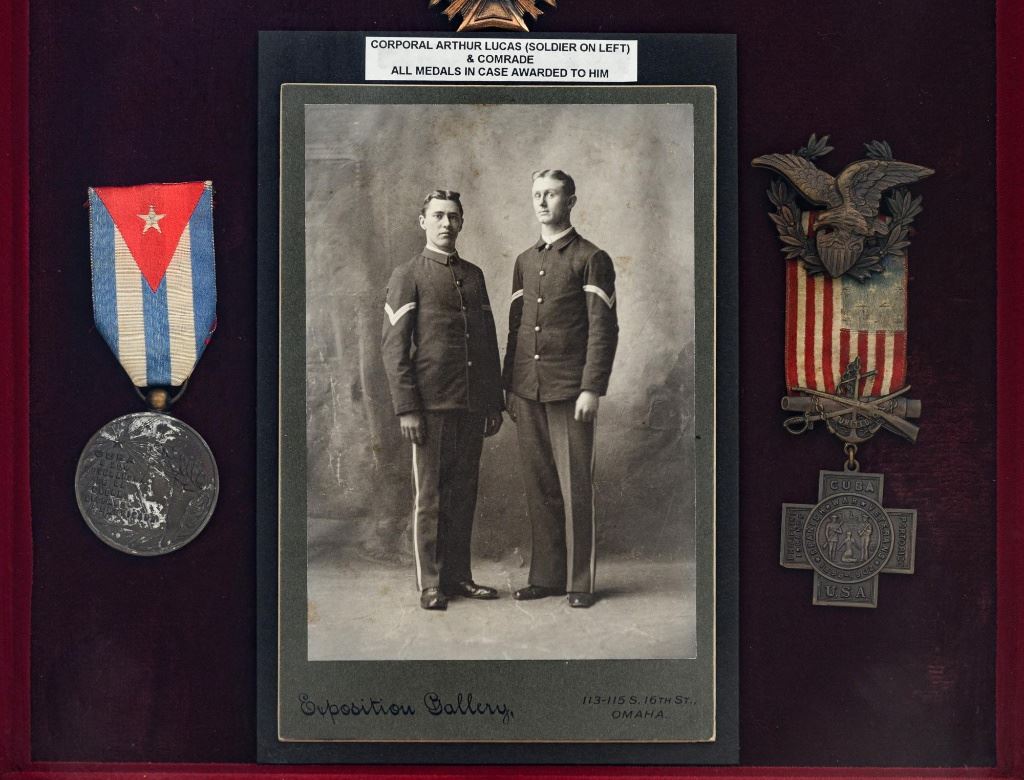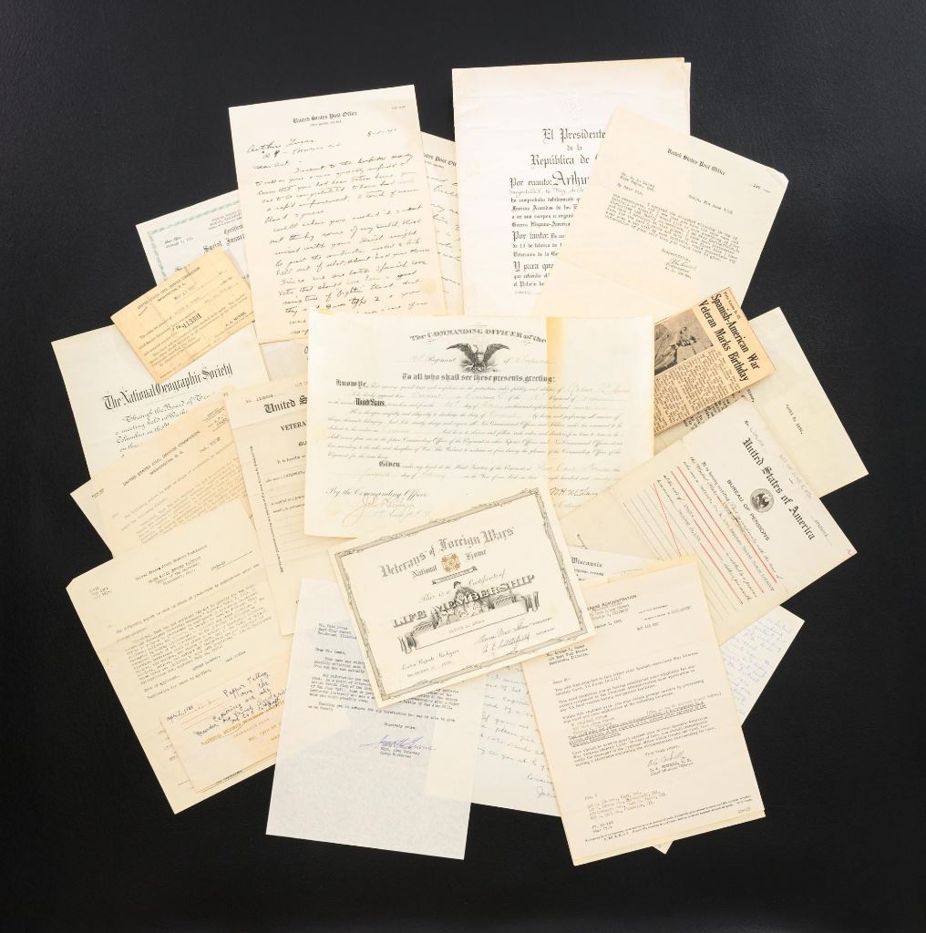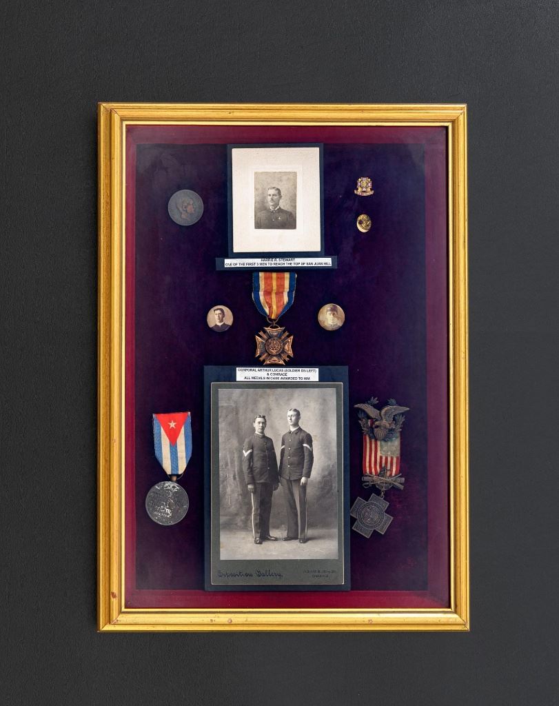 Spanish American War Veteran Framed Display with photographs, medals, and memorabilia purportedly belonging to Corporal Arthur L. Lucas, who was a participant in the assault at San Juan Hill in 1898. Included is a riker case containing military and civilian documents verifying his service and promotion to corporal then later to sergeant. He also served in the Philippines until 1901. In 1917 he applied for a reserve commission. The display is very well done, and in very good condition. Overall, an interesting lot, filled with information that warrants further research. Est.: $350-$500/lot.