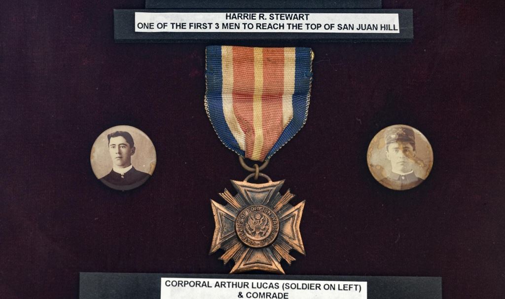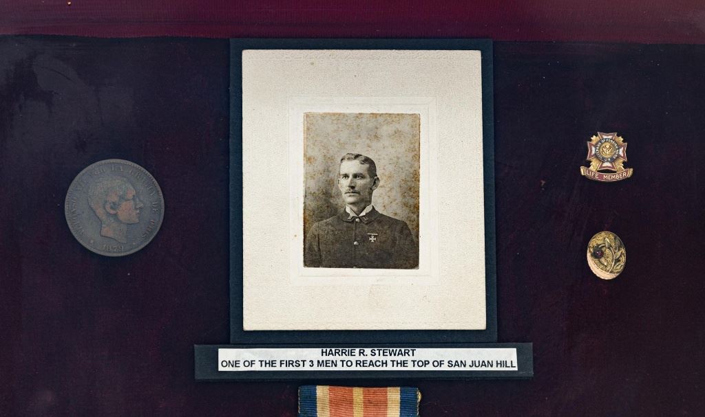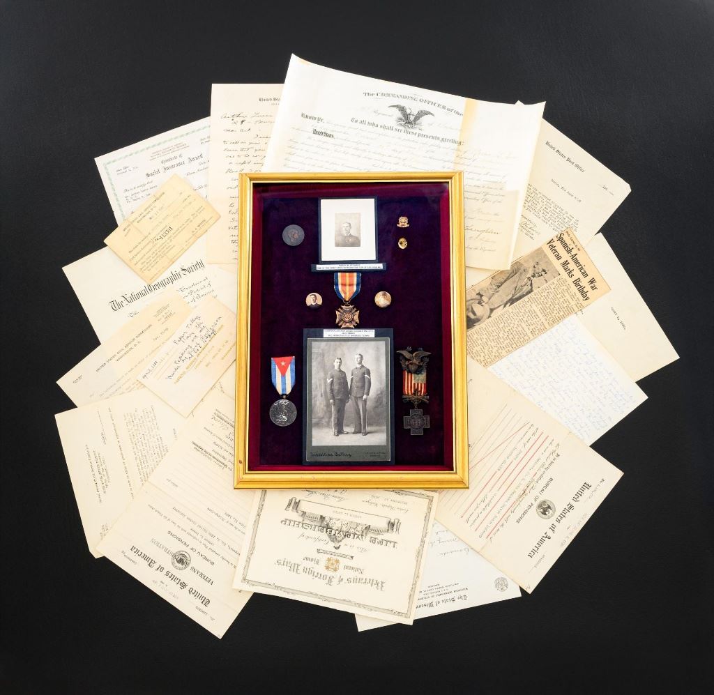 Lot 421 Spanish American War Veteran Framed Display with photographs, medals, and memorabilia