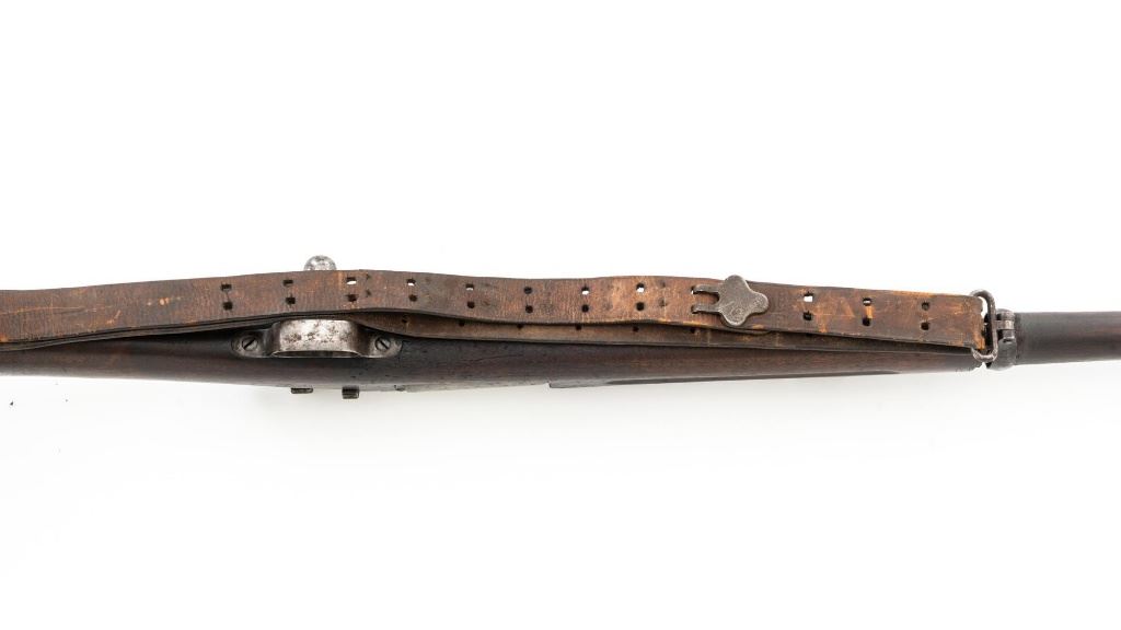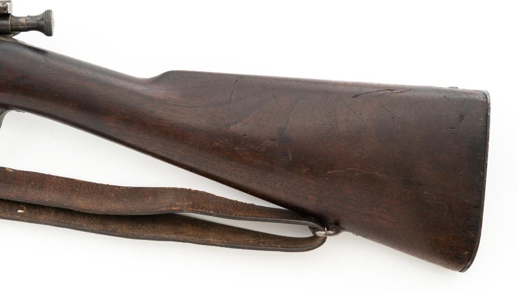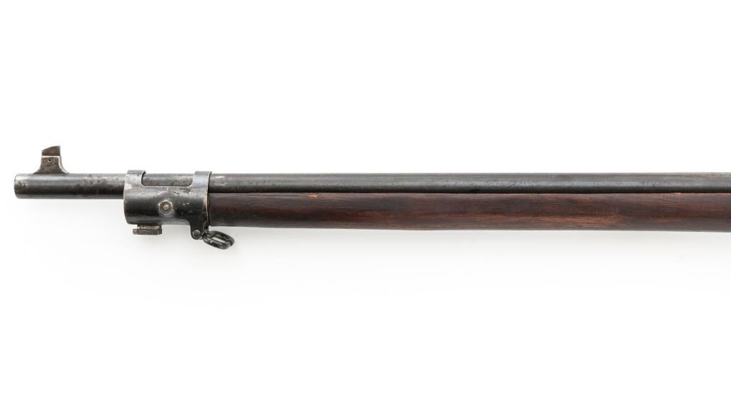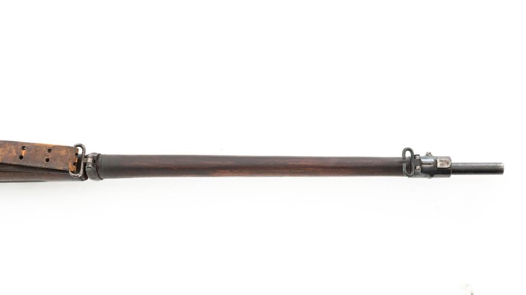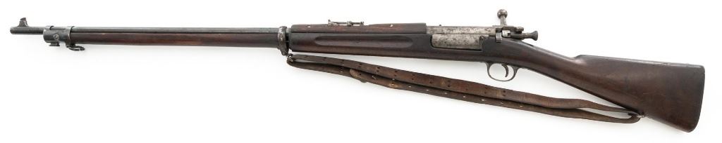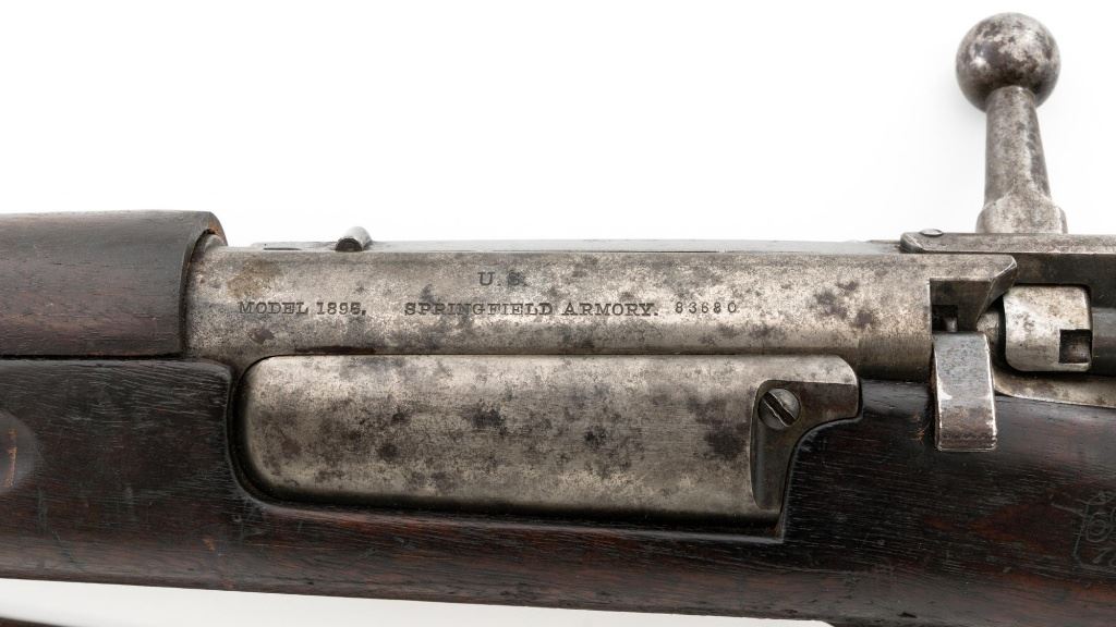 Antique U.S. Springfield Armory Model 1896 Krag Bolt Action Rifle, #83680, .30-40 Krag cal., 30" barrel, blued finish, walnut stock, blade front sight, and M1896 "U"-notched rear sight. The upper half of a MILSCO 1943 dated sling is attached. Receiver is marked "U.S./MODEL 1896 SPRINGFIELD ARMORY 83680" on the left side. Rifle is in good overall condition, metal having worn to gray, with scattered spots of light oxidation and patina. Stock is marked with a boxed "JSA/1897" on the left side and has a circled "P" proof behind the trigger guard. Stock was cut and the forend is joined underneath the rear band using two nails. Stock shows use throughout, heavier in front of the trigger guard. Action works properly. Bore is lightly frosted with good rifling. Est.: $500-$700. (Antique)