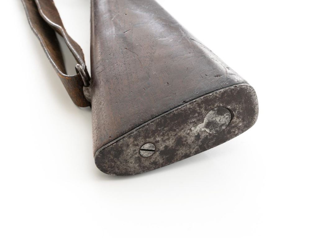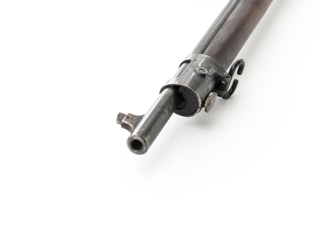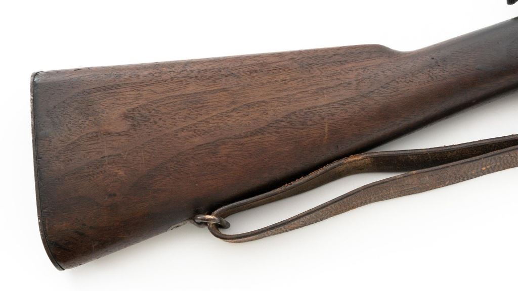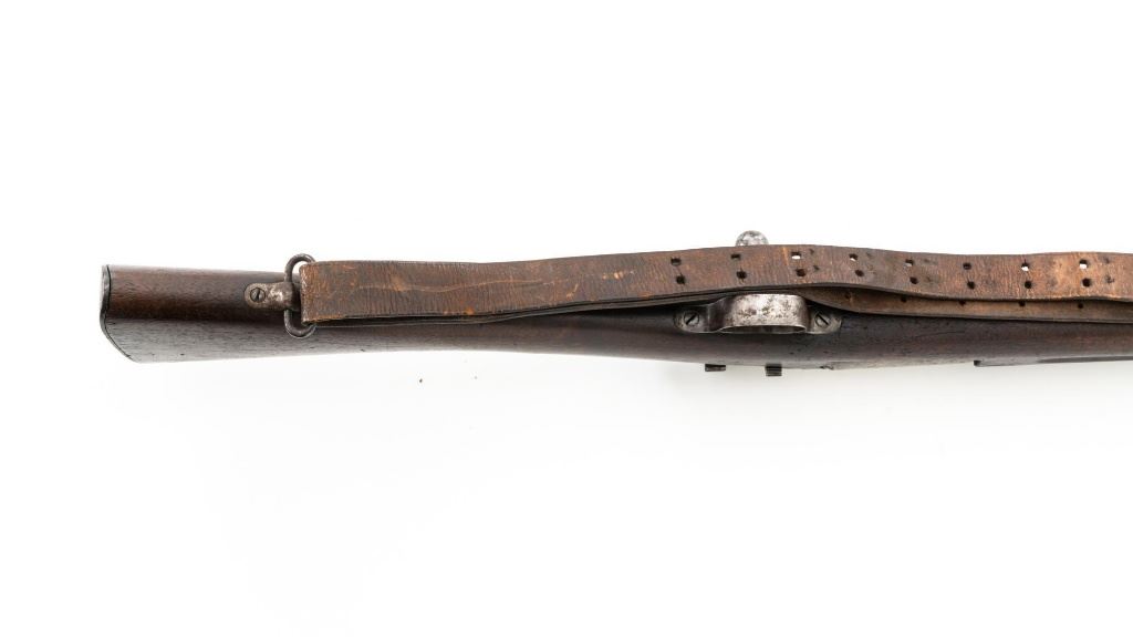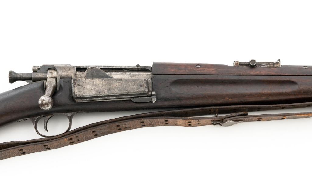 Antique U.S. Springfield Armory Model 1896 Krag Bolt Action Rifle, #83680, .30-40 Krag cal., 30" barrel, blued finish, walnut stock, blade front sight, and M1896 "U"-notched rear sight. The upper half of a MILSCO 1943 dated sling is attached. Receiver is marked "U.S./MODEL 1896 SPRINGFIELD ARMORY 83680" on the left side. Rifle is in good overall condition, metal having worn to gray, with scattered spots of light oxidation and patina. Stock is marked with a boxed "JSA/1897" on the left side and has a circled "P" proof behind the trigger guard. Stock was cut and the forend is joined underneath the rear band using two nails. Stock shows use throughout, heavier in front of the trigger guard. Action works properly. Bore is lightly frosted with good rifling. Est.: $500-$700. (Antique)