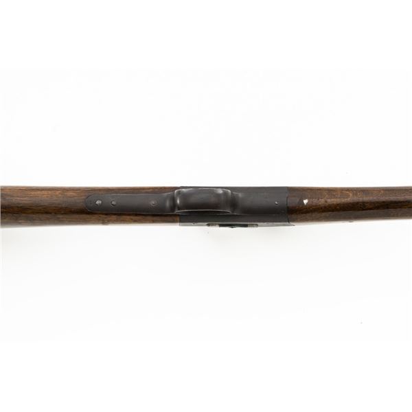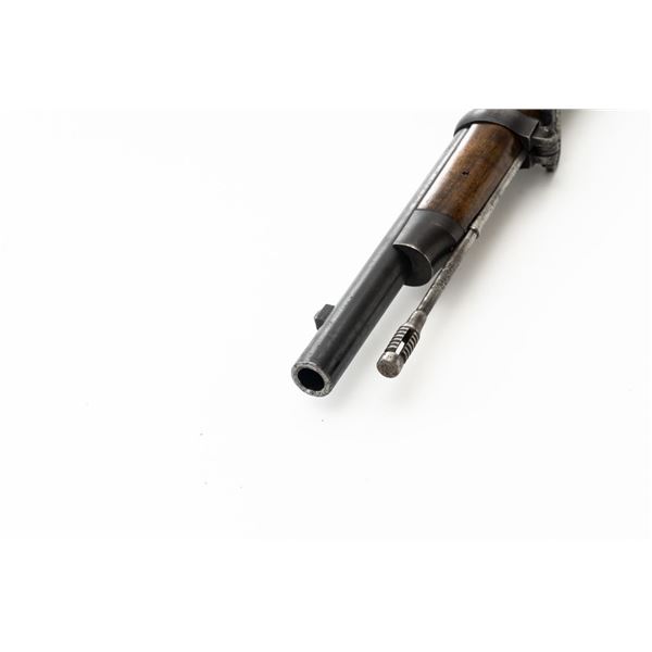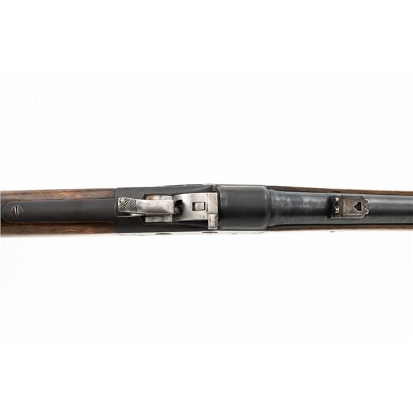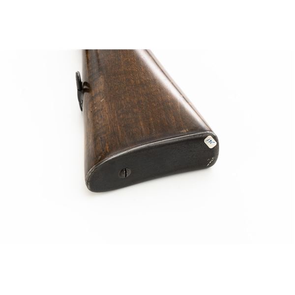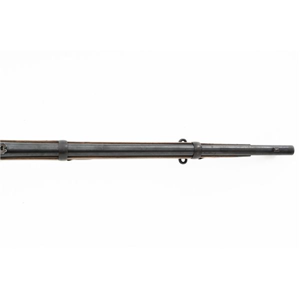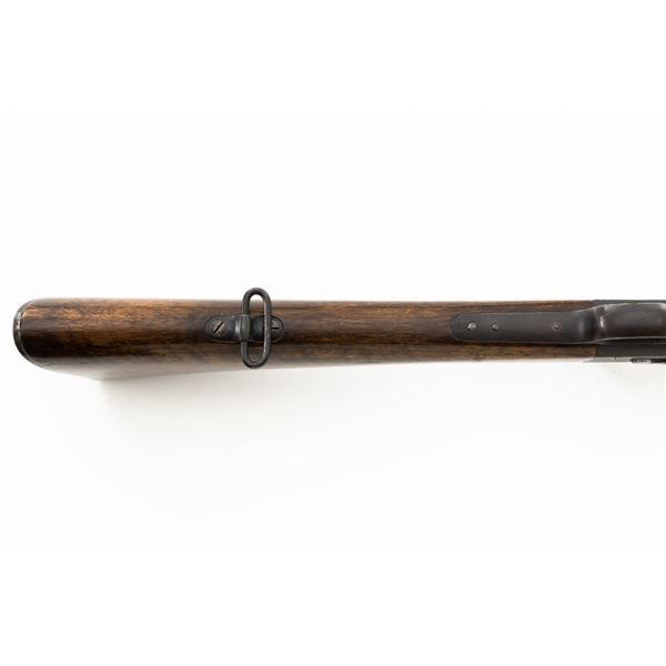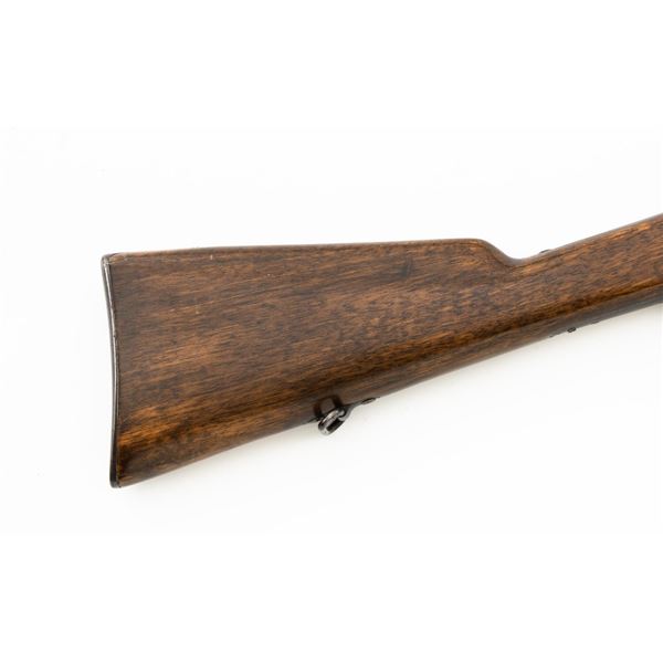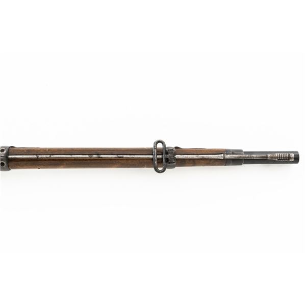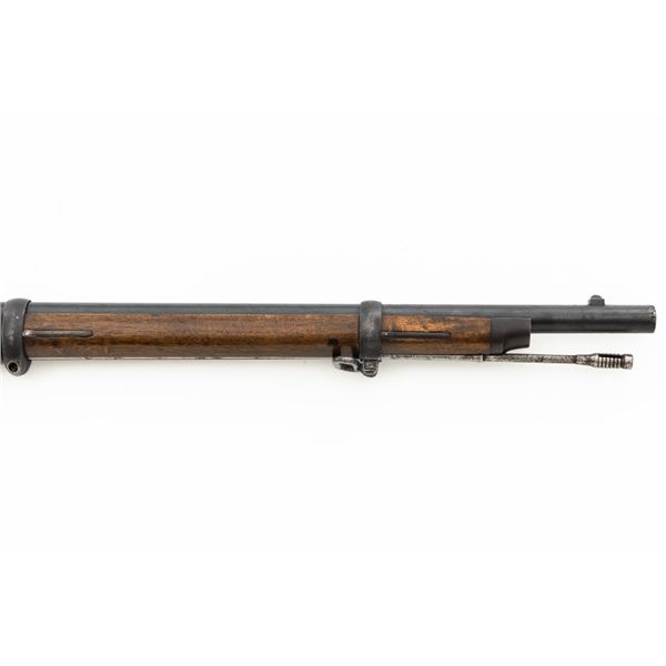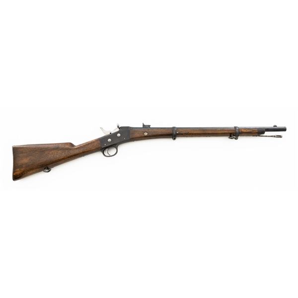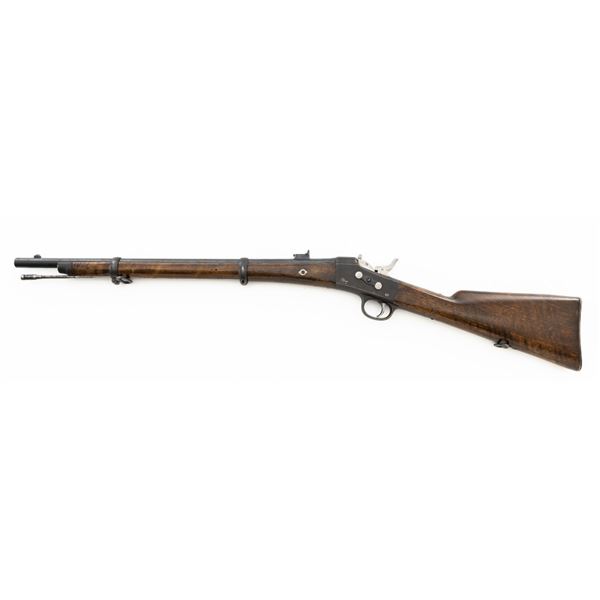 Custom Model 1874 Spanish Remington Rolling Block Short Rifle, #NVSN, .43 Spanish cal., shortened 23" barrel, with blue finish. Smooth hardwood straight grip stock and forend with sling swivels, two barrel bands, and ends with a smooth steel buttplate, providing a 12.75" LOP. Rifle also features a blade front sight, "V"-notched flip rear sight, and steel ramrod. Factory markings are legible, with a Spanish crown over "AR.O" and "1887" on the right side of the receiver. Left side of the breechblock is proofed "MR" and "(hammer)SM". Rifle is in very good overall condition, with the barrel retaining nearly all of an old refinish, with roughness and pitting at the muzzle, particularly on the right side. Receiver has gone to dull gray patina with dents and impressions. Left side shows areas of shallow pitting that have been cleaned. Stock is in very good condition with chips along the right side of the barrel channel and indentations consistent with service use. Stock has been sanded and a coat of varnish added. Action functions well and locks up securely. Bore is good with minor erosion and well-defined rifling. Est.: $300-$500. (Antique)