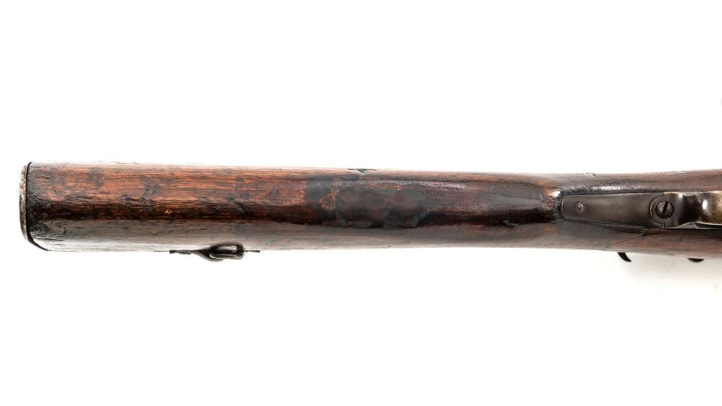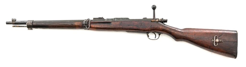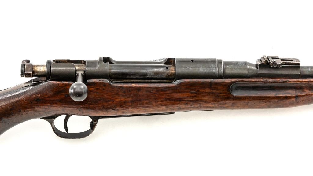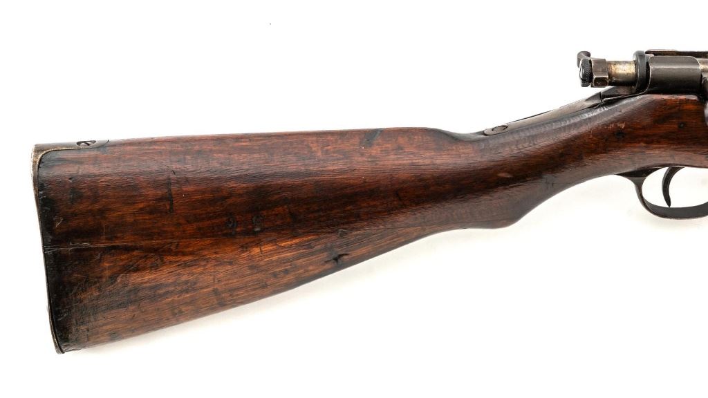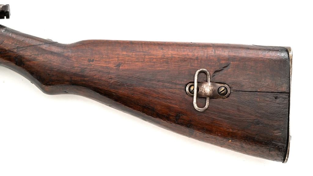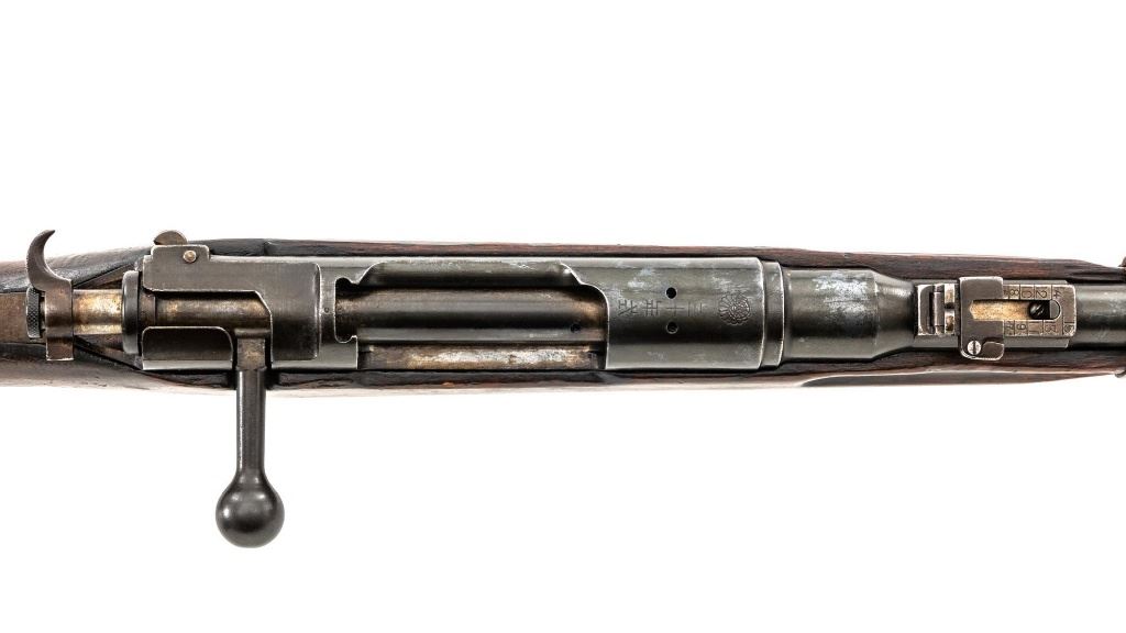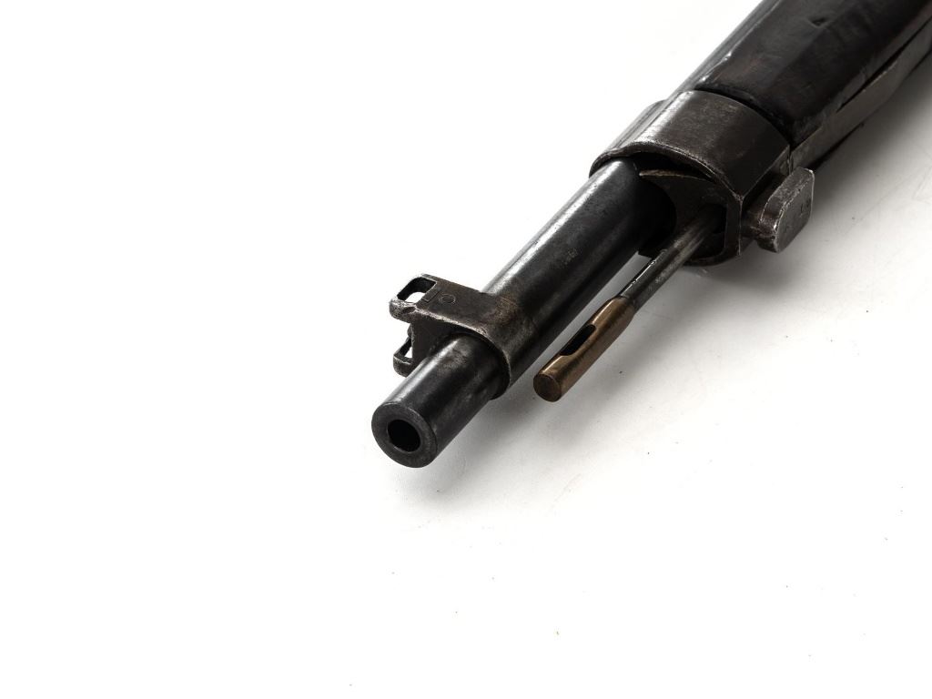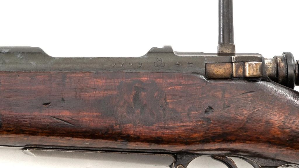 Japanese Type 30 Arisaka Bolt Action Carbine, #2729, 6.5x50mm cal., 19"barrel, blued finish, hardwood stock and handguard with two-piece buttstock, inverted-"V" front sight with protectors, adjustable folding leaf rear sight with wide "V"-notched groove, graduated to 1500 meters. Includes steel cleaning rod. Mum has been defaced with circular marks (possibly indicating removal from military service and transferred to a school for training.) over characters for "three ten type". Left side of the receiver rail is marked with Koishikawa arsenal stamp. "56" is carved into right side of the buttstock. Bolt handle and bayonet mount are numbered but do not match. No visible import marks. Condition overall is good, metal showing fine pitting to the barrel; wear to the barrel bands, bolt body, and buttplate. With areas of brown toning, especially to the trigger guard and magazine floorplate. Handguard is missing. Wood shows evidence of sanding, reshaping to underside of the buttstock. Left side of the forend has been repaired with wood putty and wood shows general marks from military use. Action operates smoothly. Bore rates fair with visible rifling. Est.: $400-$600. (C&R)