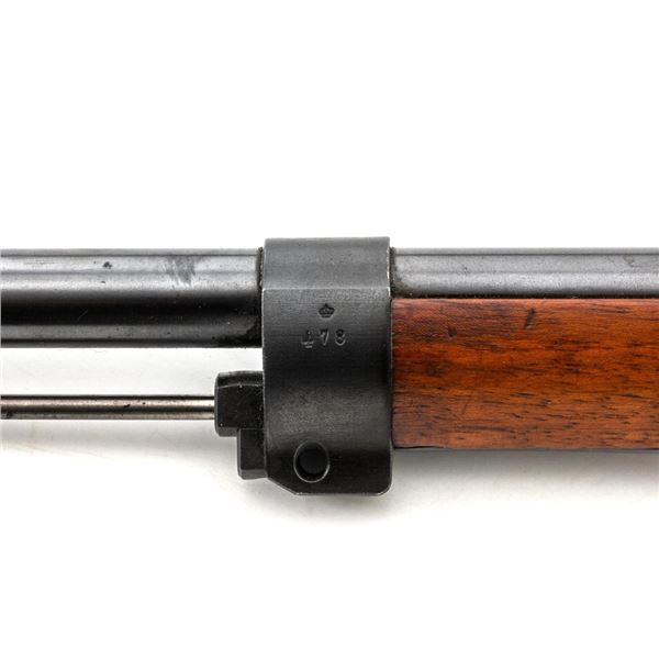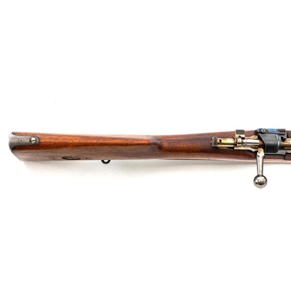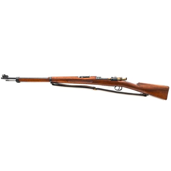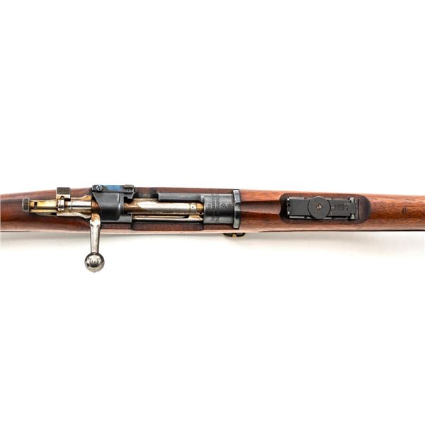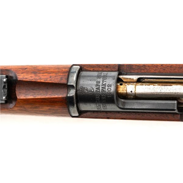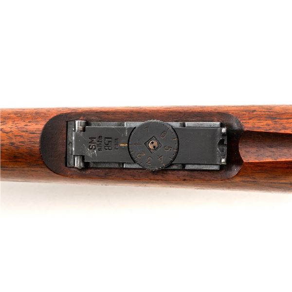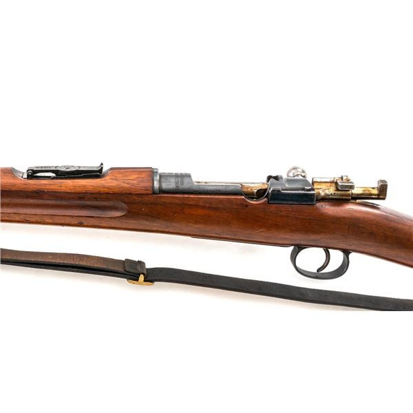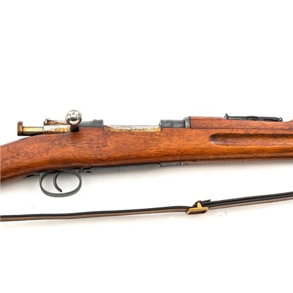 Swedish Model 1896 Mauser Bolt Action Rifle, #115478, 6.5x55mm cal., 29.25" barrel, blued finish with bright bolt assembly, hardwood stock and handguard, blade front sight with attached hood. The issue rear sight leaf has been replaced with a dial adjusted type with "U"-notched groove, marked "SM/SIKTE/ASY/ram", graduated to 700 meters. Includes a steel cleaning rod and brown leather sling. Sling is stamped "D.M.G.G.F. 1955" and is in very good used condition. Top of the receiver ring is marked with a crowned Swedish crest over "CARL GUSTAFS STADS/GEVARSFAKTORI./1902". Brass disc identifying bore and throat wear and range plate have been removed from right side of the buttstock. Matching numbers, except for replacement rear sight leaf. No visible import marks. Rifle is in near fine overall condition, retaining approx. 90% blue, with wear primarily to the floorplate and buttplate. Barrel finish shows moderate toning. There is old cosmoline on the bolt. Wood with scattered mostly light handling marks and scratches. Action operates smoothly. Bore is bright with very good rifling. Est.:$400-$600. (C&R)