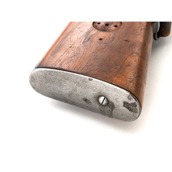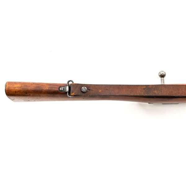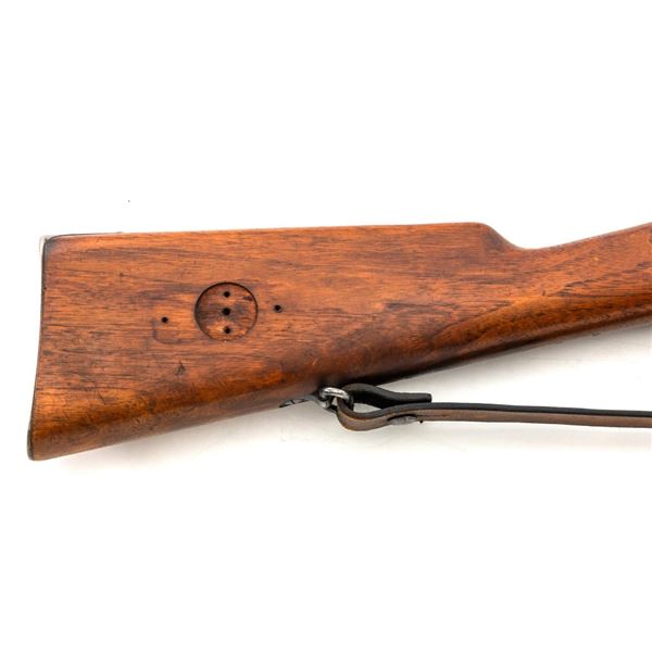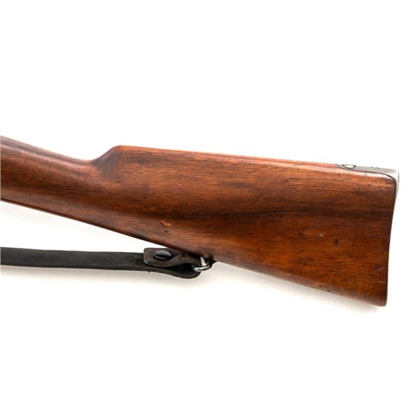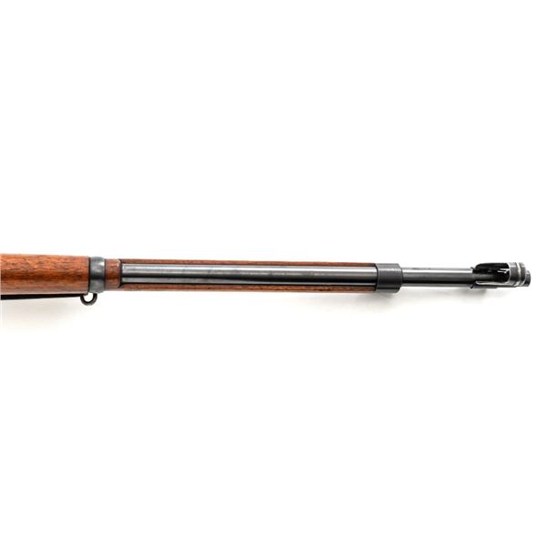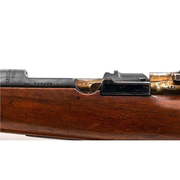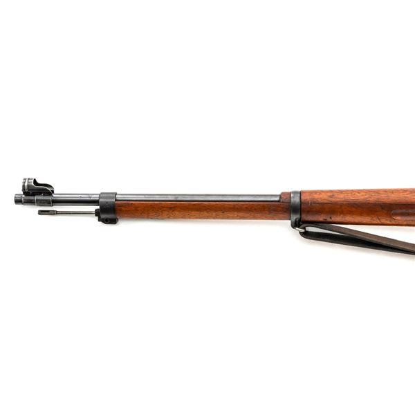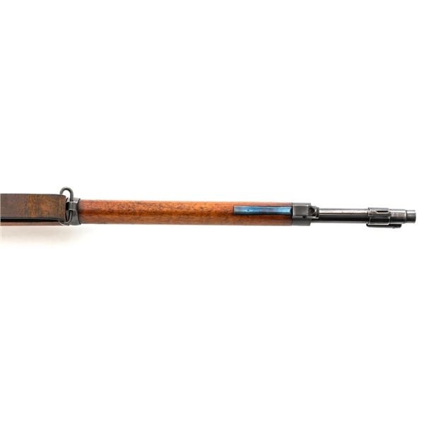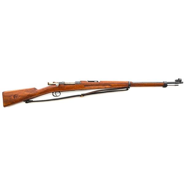Swedish Model 1896 Mauser Bolt Action Rifle, #115478, 6.5x55mm cal., 29.25" barrel, blued finish with bright bolt assembly, hardwood stock and handguard, blade front sight with attached hood. The issue rear sight leaf has been replaced with a dial adjusted type with "U"-notched groove, marked "SM/SIKTE/ASY/ram", graduated to 700 meters. Includes a steel cleaning rod and brown leather sling. Sling is stamped "D.M.G.G.F. 1955" and is in very good used condition. Top of the receiver ring is marked with a crowned Swedish crest over "CARL GUSTAFS STADS/GEVARSFAKTORI./1902". Brass disc identifying bore and throat wear and range plate have been removed from right side of the buttstock. Matching numbers, except for replacement rear sight leaf. No visible import marks. Rifle is in near fine overall condition, retaining approx. 90% blue, with wear primarily to the floorplate and buttplate. Barrel finish shows moderate toning. There is old cosmoline on the bolt. Wood with scattered mostly light handling marks and scratches. Action operates smoothly. Bore is bright with very good rifling. Est.:$400-$600. (C&R)