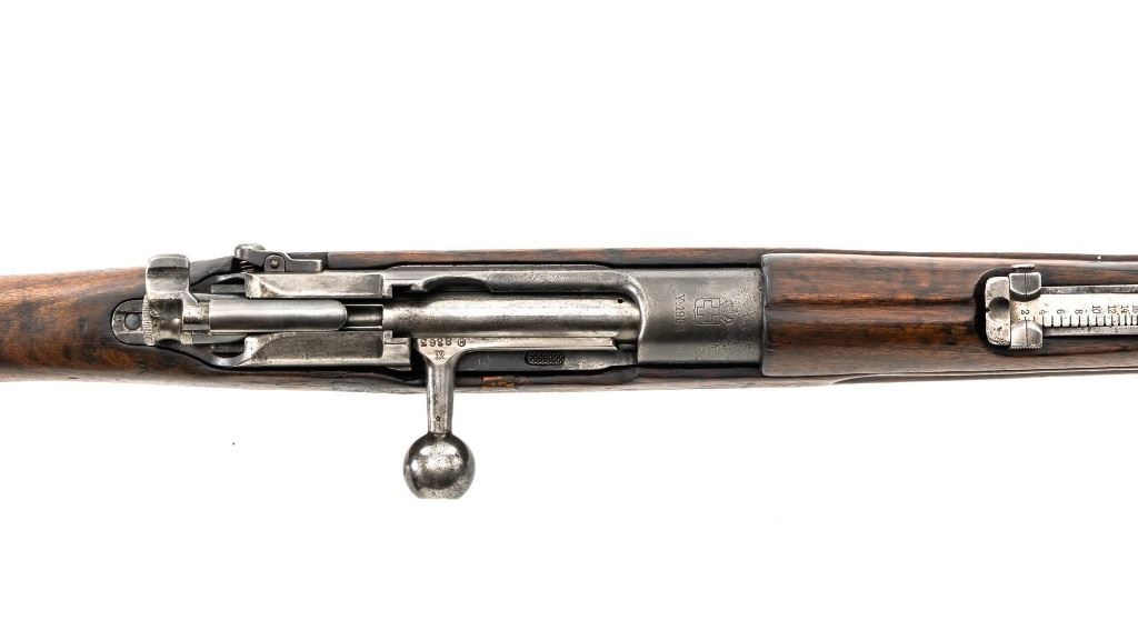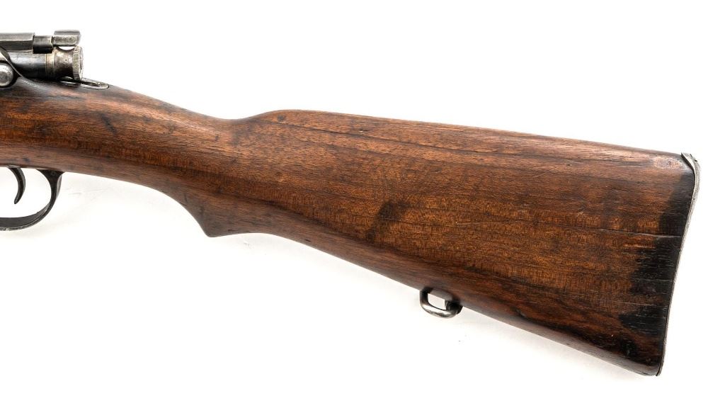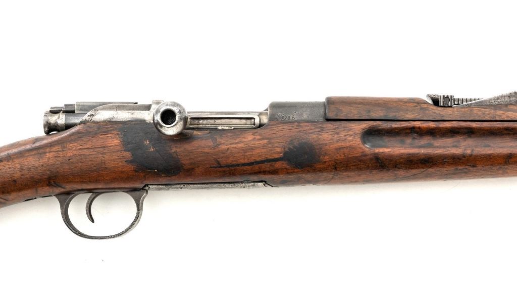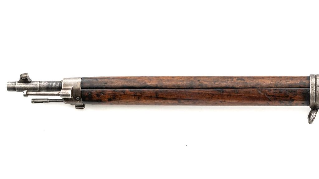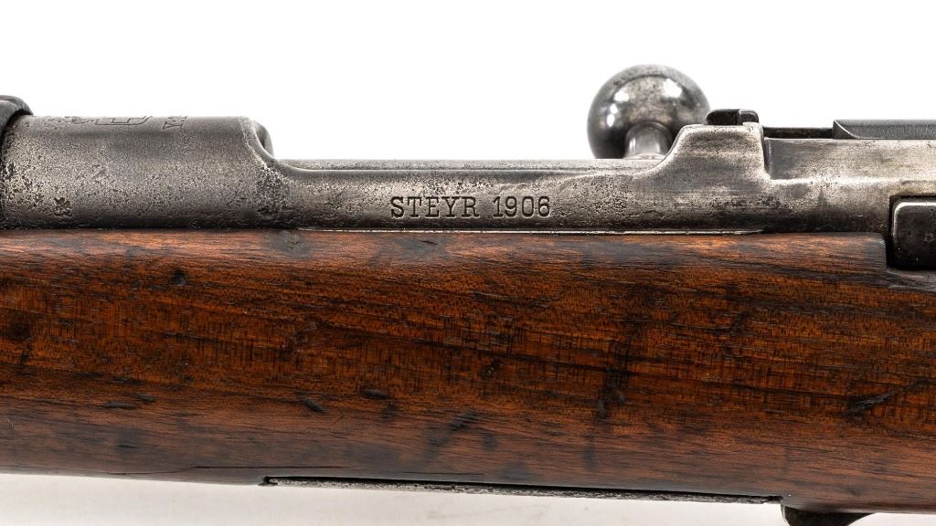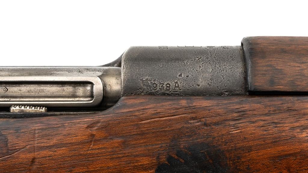 Greek M1903 Mannlicher Schoenauer Bolt Action Rifle, #938A, 6.5x54mm cal., 28.5" barrel, blued finish, hardwood stock and hand guard, dovetailed inverted-"V" front sight, and adjustable folding leaf rear sight with "V"-notched groove, graduated to 2000 meters. Steel cleaning rod is present. Top of the receiver ring is marked with crowned Greek crest over "YI 1903". There is a small Greek St George proof stamp on the left side. Left side of the receiver rail is marked "STEYR 1906". Condition overall is fair to good. Metal has been cleaned, now mostly gray mixed with areas of brown patina and traces of original finish. There are areas of pitting to the rear barrel band , receiver, and especially to the magazine floorplate, trigger guard, and buttplate. Wood has been sanded and varnish was applied over old dents and scratches. There is a crack and repairs to the buttstock and dark stains to right side of the forend. Action operates smoothly. Bore rates poor, rifling is still visible. Est.: $200-$400. (C&R)