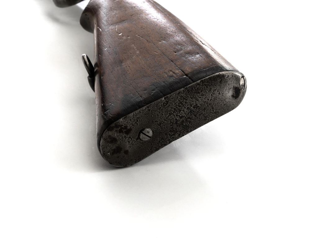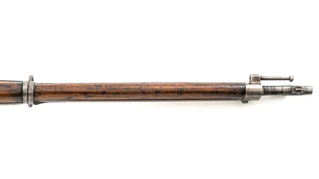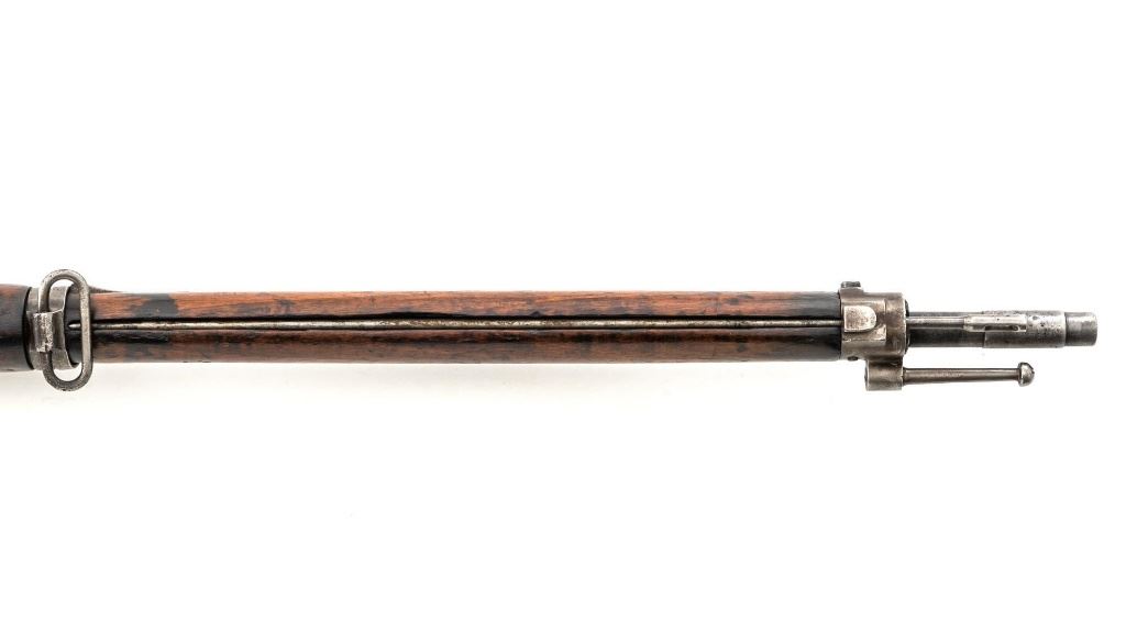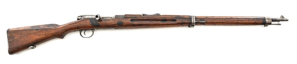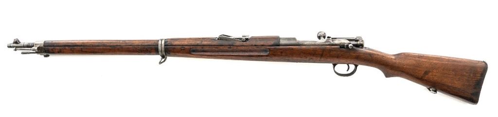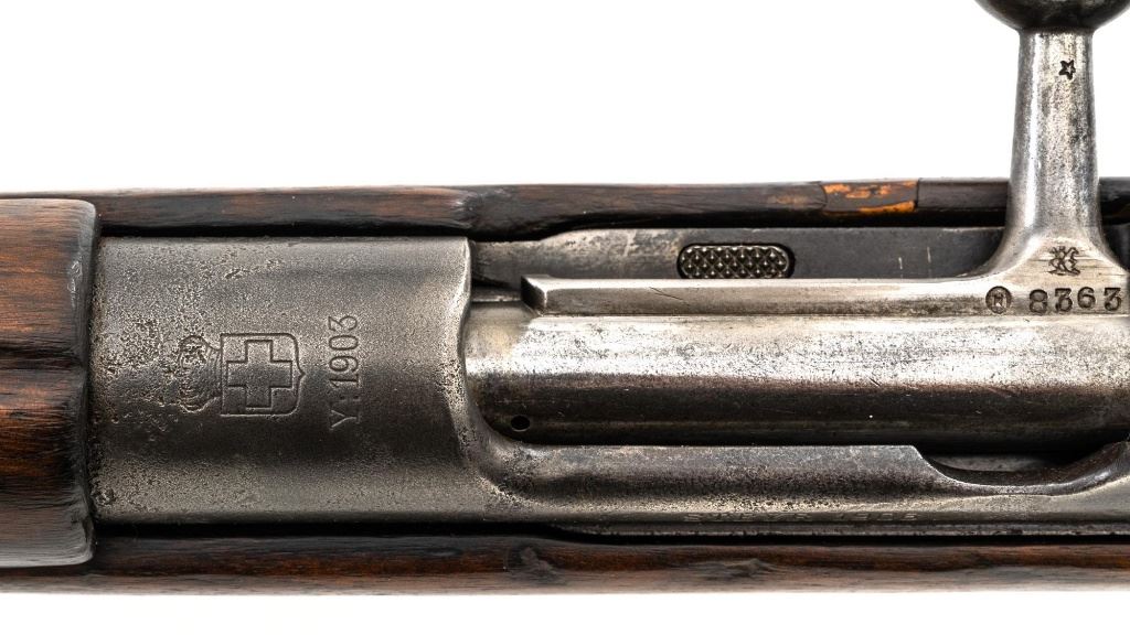 Greek M1903 Mannlicher Schoenauer Bolt Action Rifle, #938A, 6.5x54mm cal., 28.5" barrel, blued finish, hardwood stock and hand guard, dovetailed inverted-"V" front sight, and adjustable folding leaf rear sight with "V"-notched groove, graduated to 2000 meters. Steel cleaning rod is present. Top of the receiver ring is marked with crowned Greek crest over "YI 1903". There is a small Greek St George proof stamp on the left side. Left side of the receiver rail is marked "STEYR 1906". Condition overall is fair to good. Metal has been cleaned, now mostly gray mixed with areas of brown patina and traces of original finish. There are areas of pitting to the rear barrel band , receiver, and especially to the magazine floorplate, trigger guard, and buttplate. Wood has been sanded and varnish was applied over old dents and scratches. There is a crack and repairs to the buttstock and dark stains to right side of the forend. Action operates smoothly. Bore rates poor, rifling is still visible. Est.: $200-$400. (C&R)