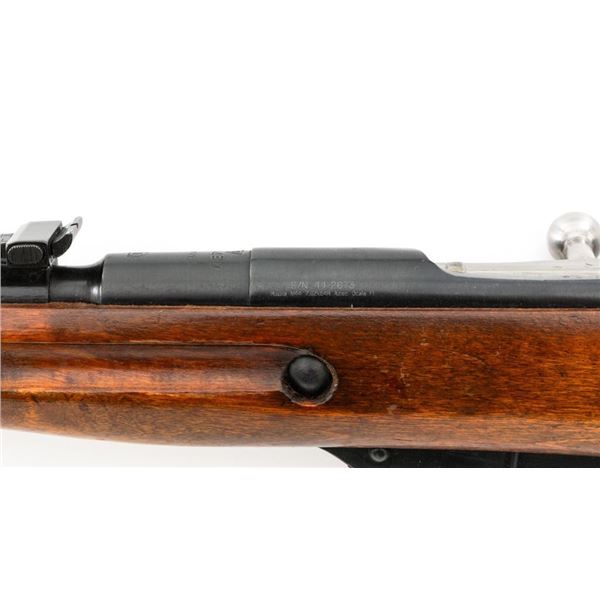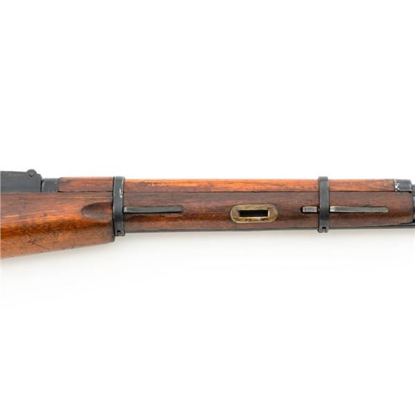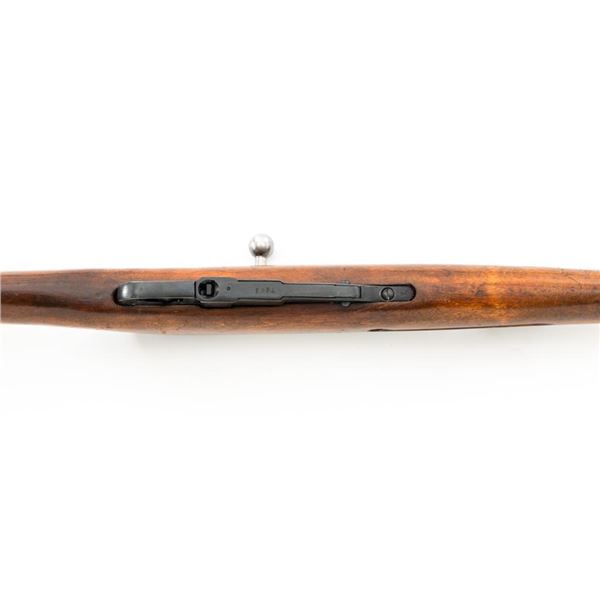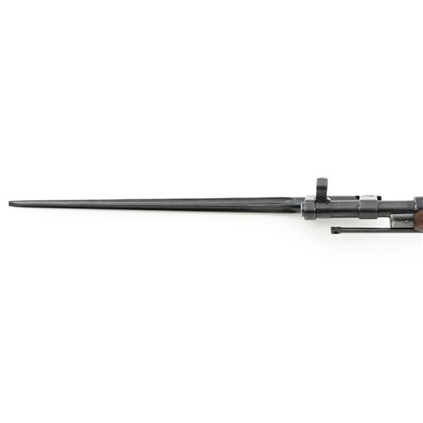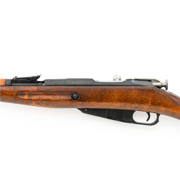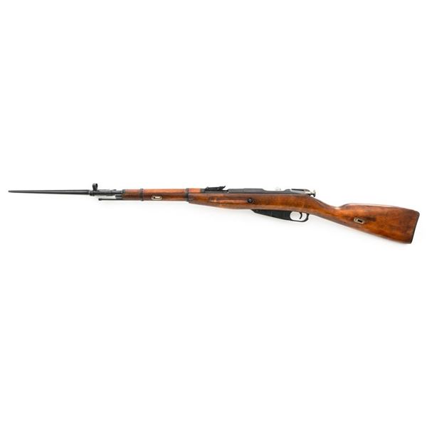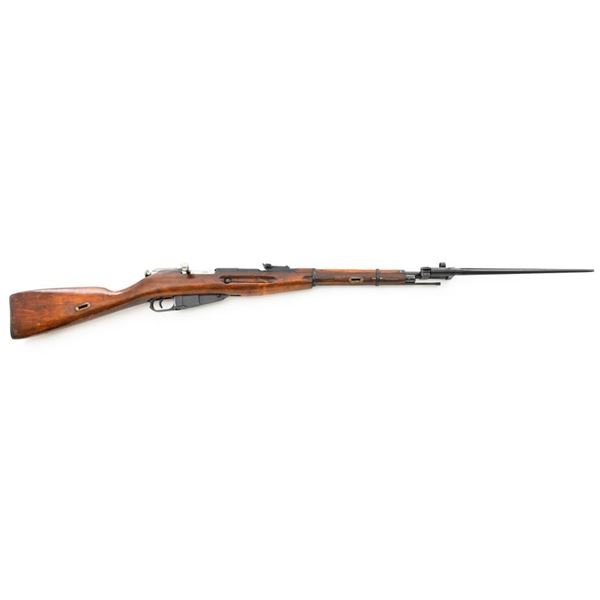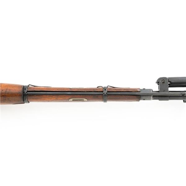 Soviet M44 Mosin Nagant Bolt Action Carbine with Folding Bayonet, #44-2673, 7.62x54Rmm cal., 20.25" barrel, blued finish with bright bolt assembly, hardwood stock and handguard, hooded post front sight, and adjustable tangent rear sight with "U"-notched groove, graduated to 1000 meters. Includes bayonet and cleaning rod. Bayonet operates and locks into place smoothly. Top of the barrel shank is stamped with "(Soviet crest)/1944r/NE7949/(Izhevsk Arsenal symbol)". Matching visible numbers. Importer applied serial number and information on left side of the receiver. Condition overall is very good+, retaining approx. 97% arsenal refinished blue. Wood with scattered handling marks and some areas of flaking to the varnish finish. Action operates smoothly. Bore is bright with very good, clearly defined rifling. Est.: $300-$450. (C&R)
