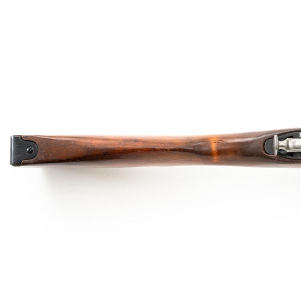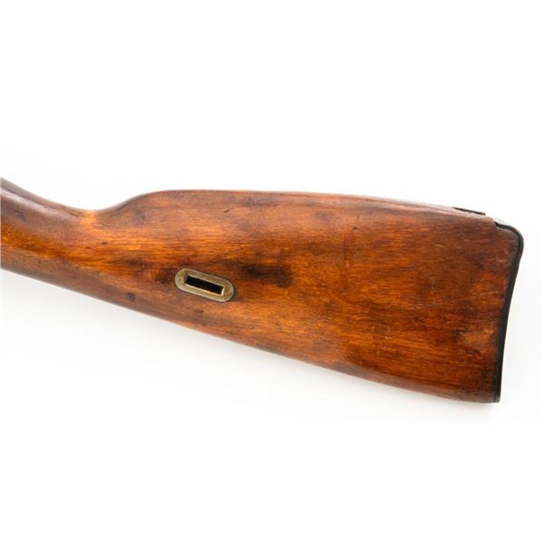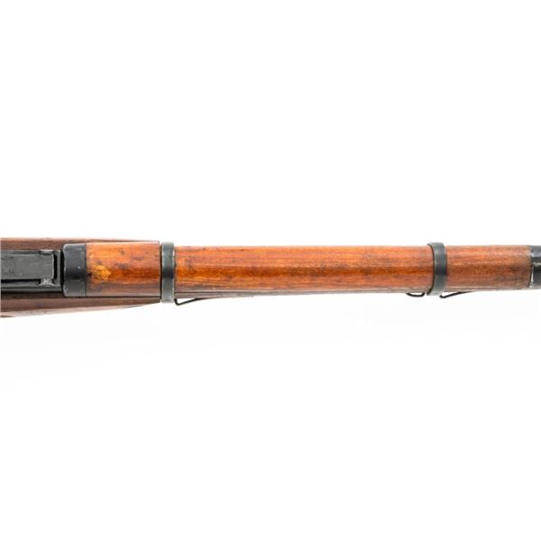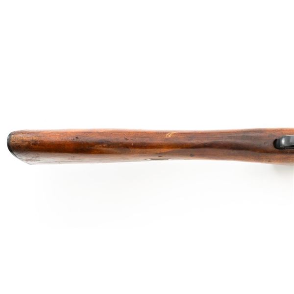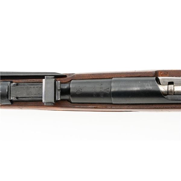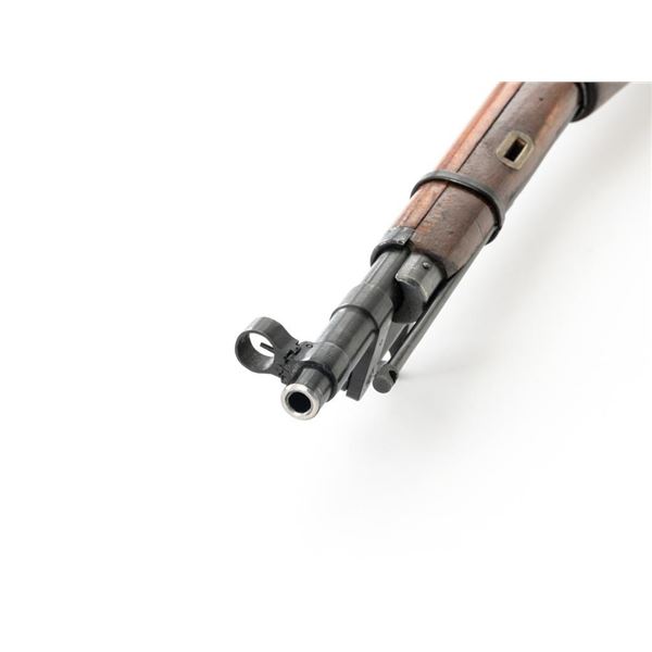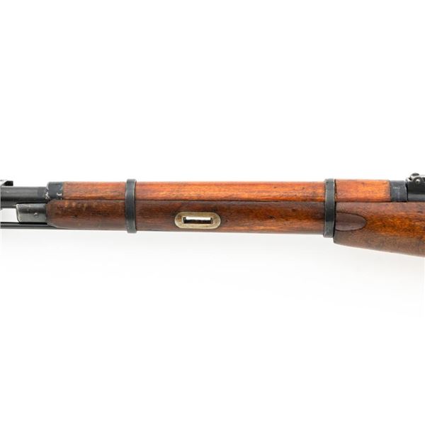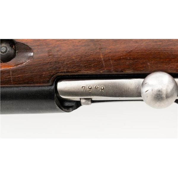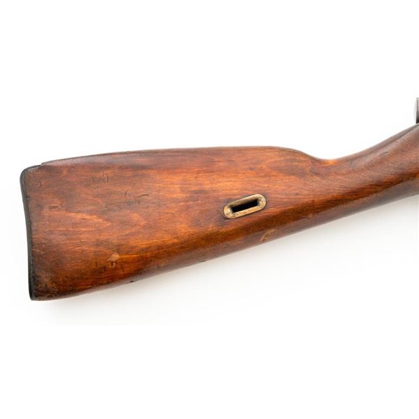 Soviet M44 Mosin Nagant Bolt Action Carbine with Folding Bayonet, #44-2673, 7.62x54Rmm cal., 20.25" barrel, blued finish with bright bolt assembly, hardwood stock and handguard, hooded post front sight, and adjustable tangent rear sight with "U"-notched groove, graduated to 1000 meters. Includes bayonet and cleaning rod. Bayonet operates and locks into place smoothly. Top of the barrel shank is stamped with "(Soviet crest)/1944r/NE7949/(Izhevsk Arsenal symbol)". Matching visible numbers. Importer applied serial number and information on left side of the receiver. Condition overall is very good+, retaining approx. 97% arsenal refinished blue. Wood with scattered handling marks and some areas of flaking to the varnish finish. Action operates smoothly. Bore is bright with very good, clearly defined rifling. Est.: $300-$450. (C&R)