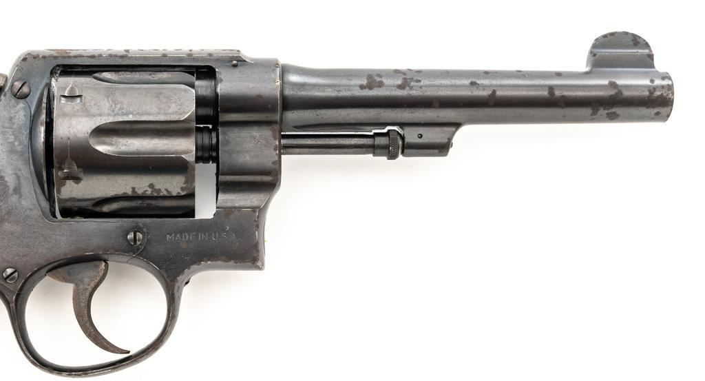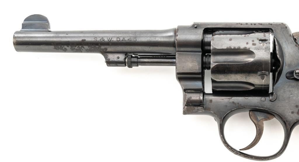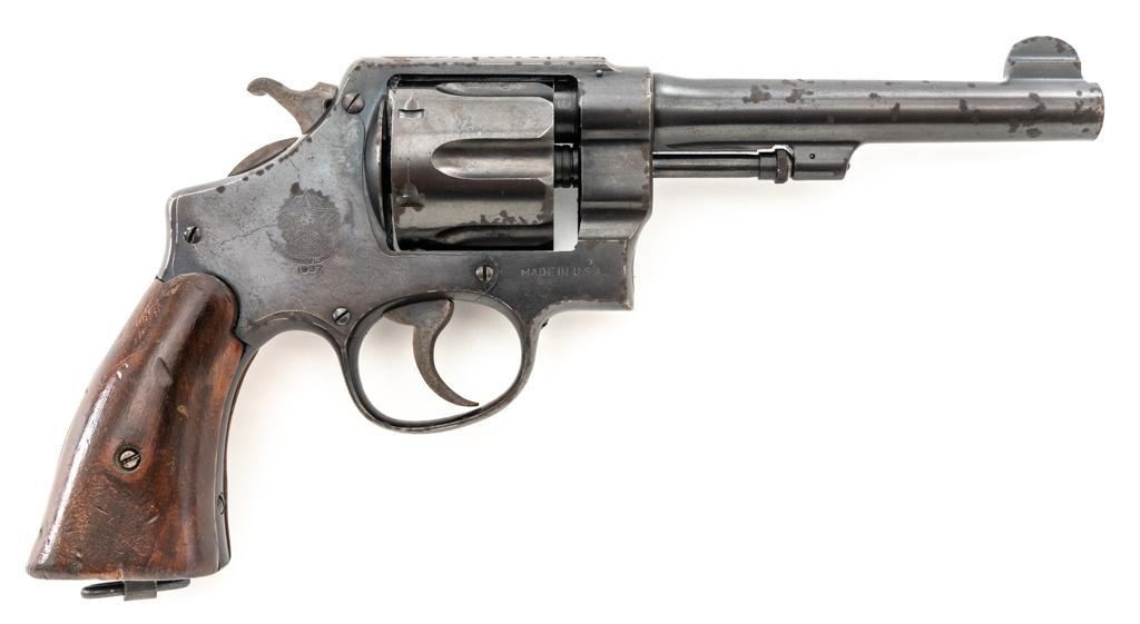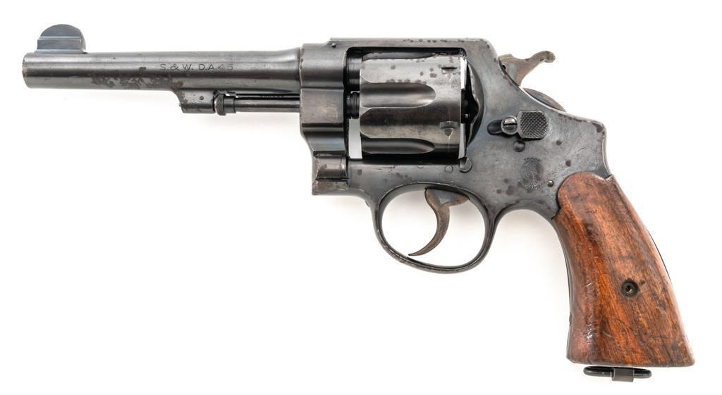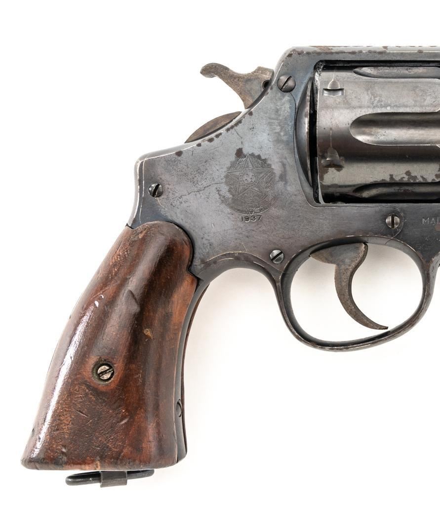Brazilian Contract Smith & Wesson Model of 1917 .45 Hand Ejector Double Action Revolver, #208425, .45 ACP cal., 5.5" barrel, blue finish, smooth walnut two-piece grips, lanyard ring, 5-screw frame, half-round blade front and fixed square notch rear sight, with color case hardened hammer and trigger. Factory markings are clear, with a crisp Brazilian National Crest on the right side of the frame, dated 1937. Import marked on the left side of the grip frame, under the panel. Matching serial numbers on the cylinder, barrel, and frame. Revolver is in very good overall condition, retaining approx. 84%-86% thinning factory finish, showing moderate wear at the muzzle, light to moderate scattered spots of surface rust and corrosion. Top strap shows heavier rust due to poor storage. Trigger and hammer display muted color case hardening. Grips are in good condition, with dents and impressions consistent with service use and wear around the bases. Action fuctions well. Bore is good, with scattered light corrosion and defined rifling. Est.: $400-$700. (C&R/PPT)